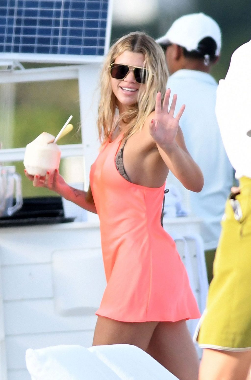 Sofia Richie foi vista usando um vestido neon brilhante sobre seu biquíni enquanto aproveitava o sol em uma praia de Miami com Scott Disick, 26/11/2019. A jovem estrela passou o fim de semana descansando com amigos. Paparazzi tiraram várias fotos bem-sucedidas da loira.