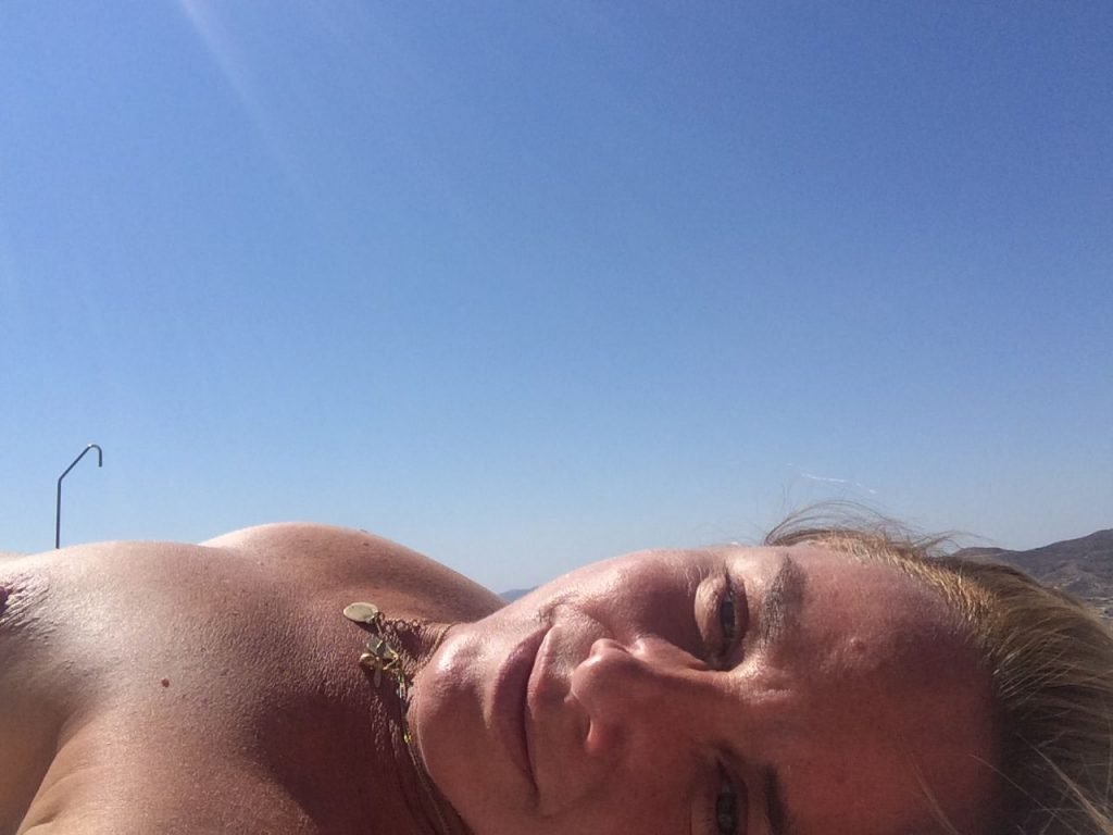 Ha! A segunda foto parece que ela tem um pau, com uma toalha preta cobrindo. LMFAO!
