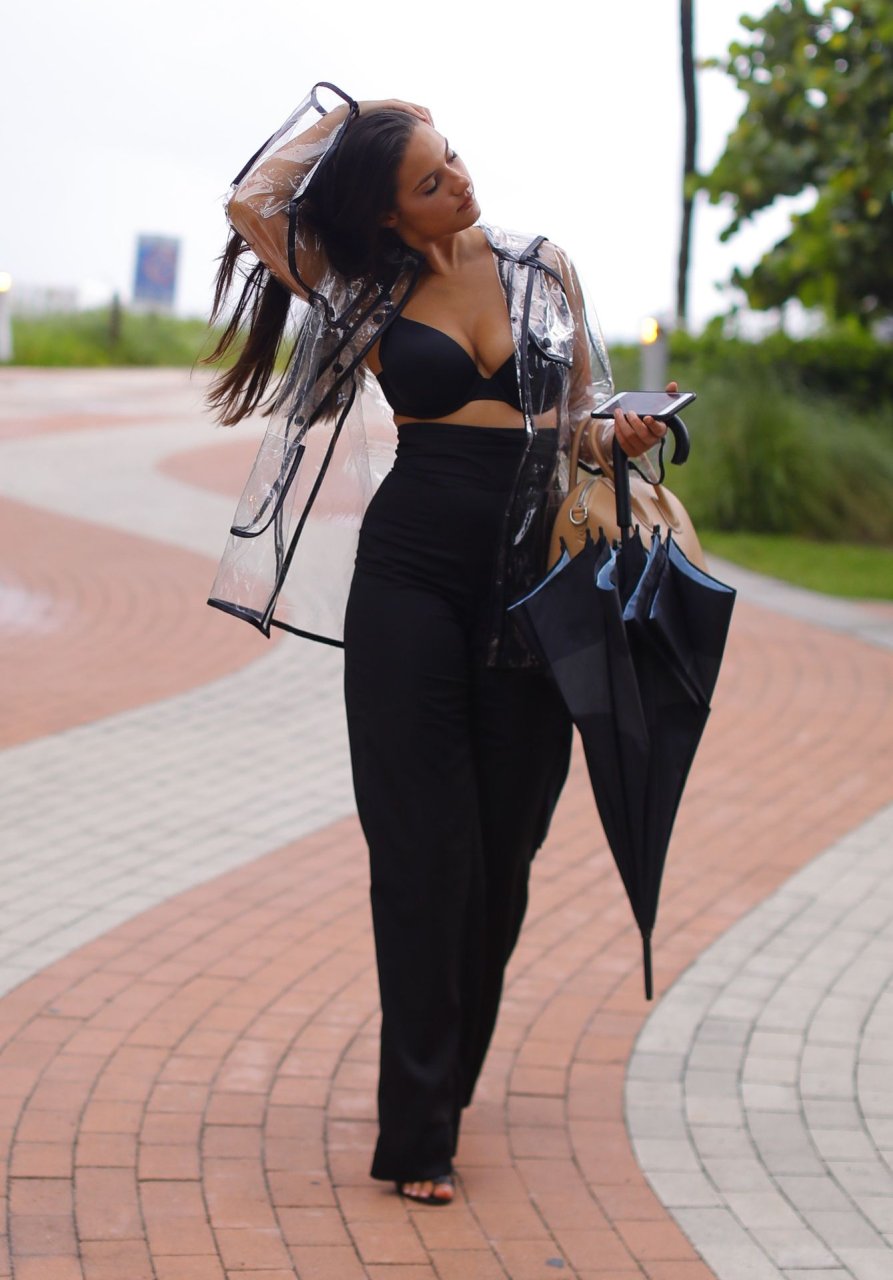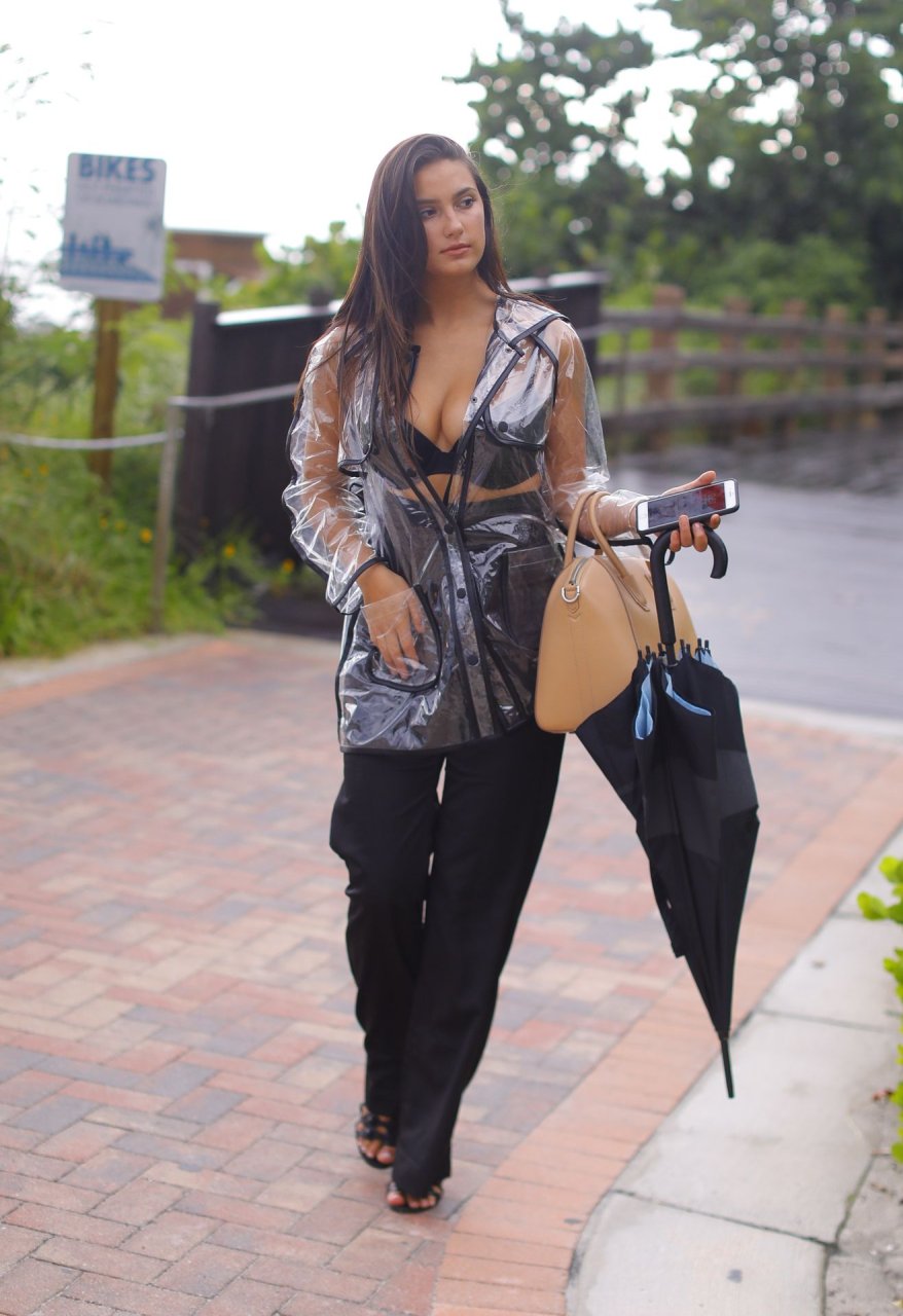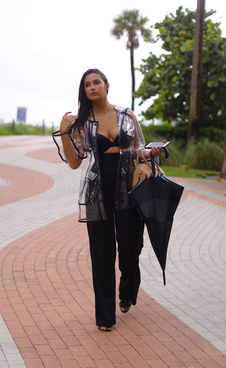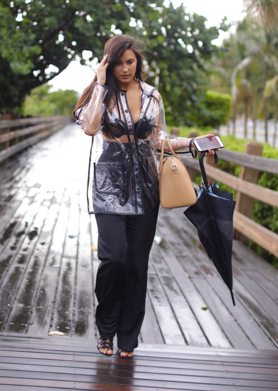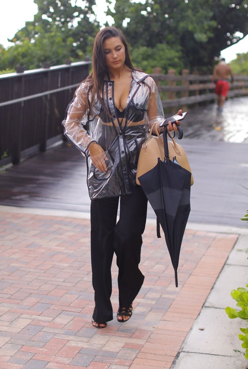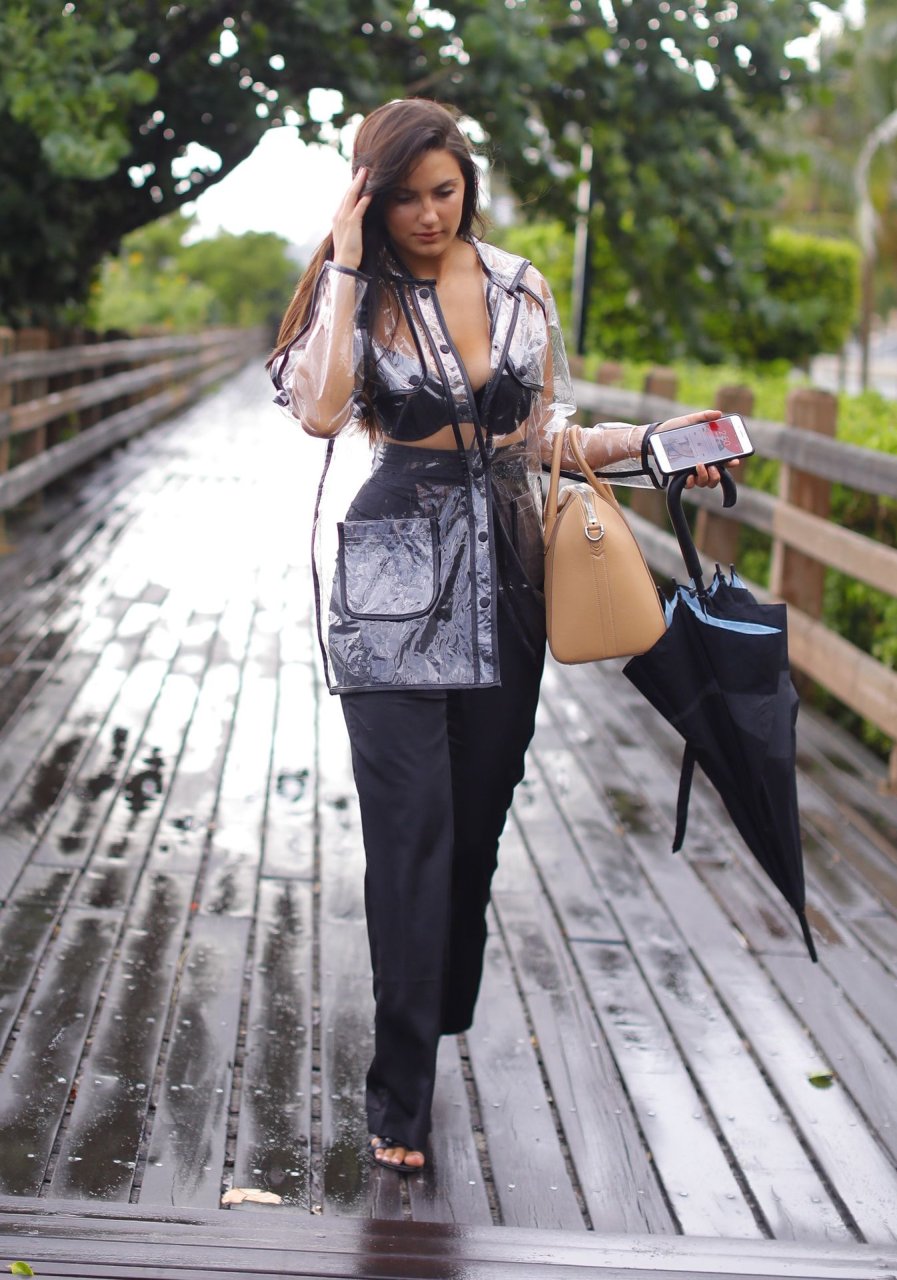 A modelo francesa Tao Wickrath impressiona enquanto caminha na chuva com uma capa de chuva transparente e sutiã por baixo, aproveitando um passeio na praia e um Starbucks em Miami em um dia chuvoso, 25/08/2018.