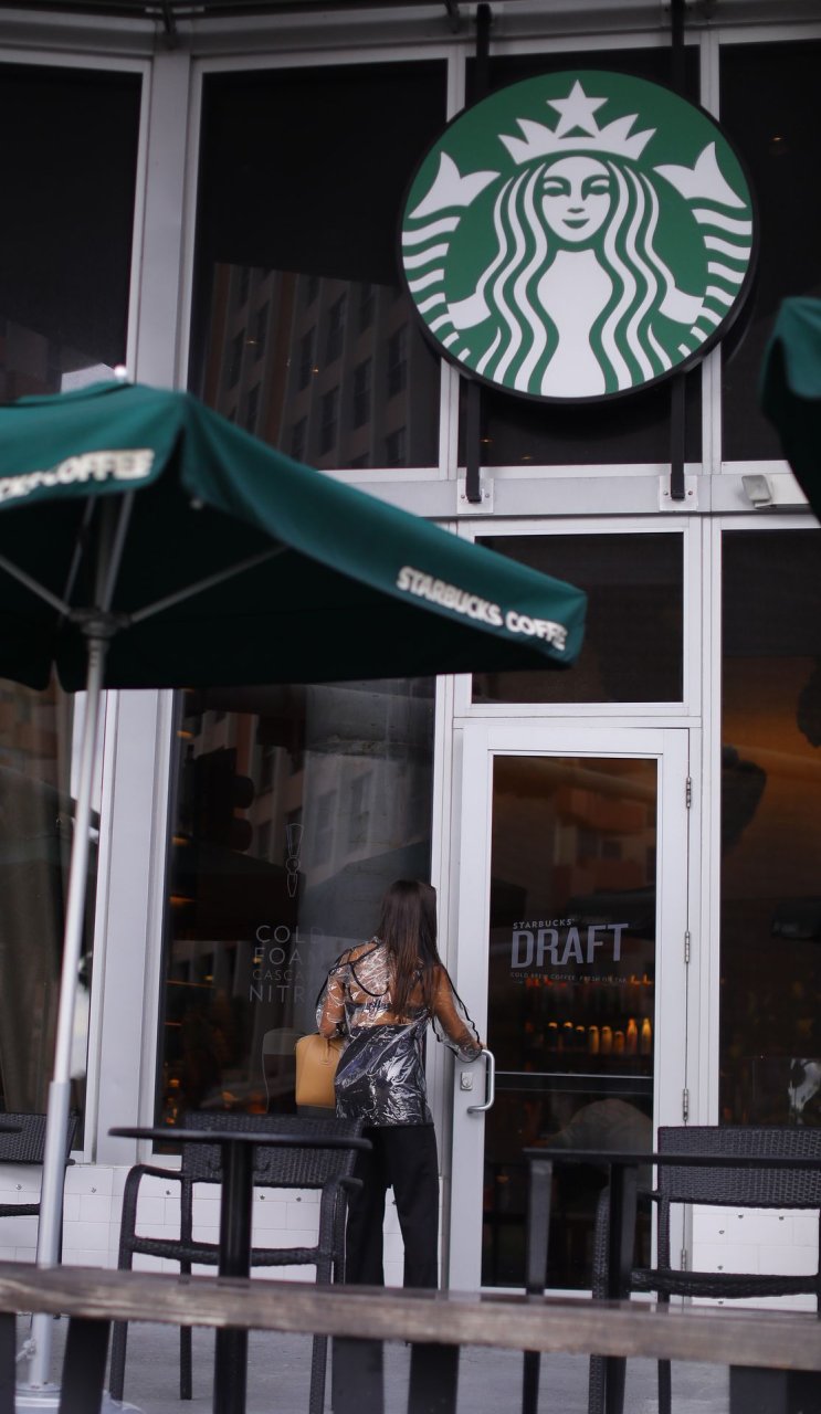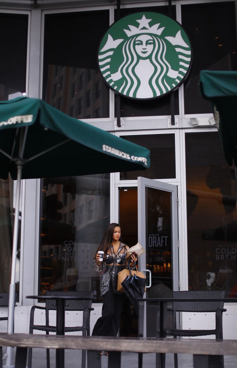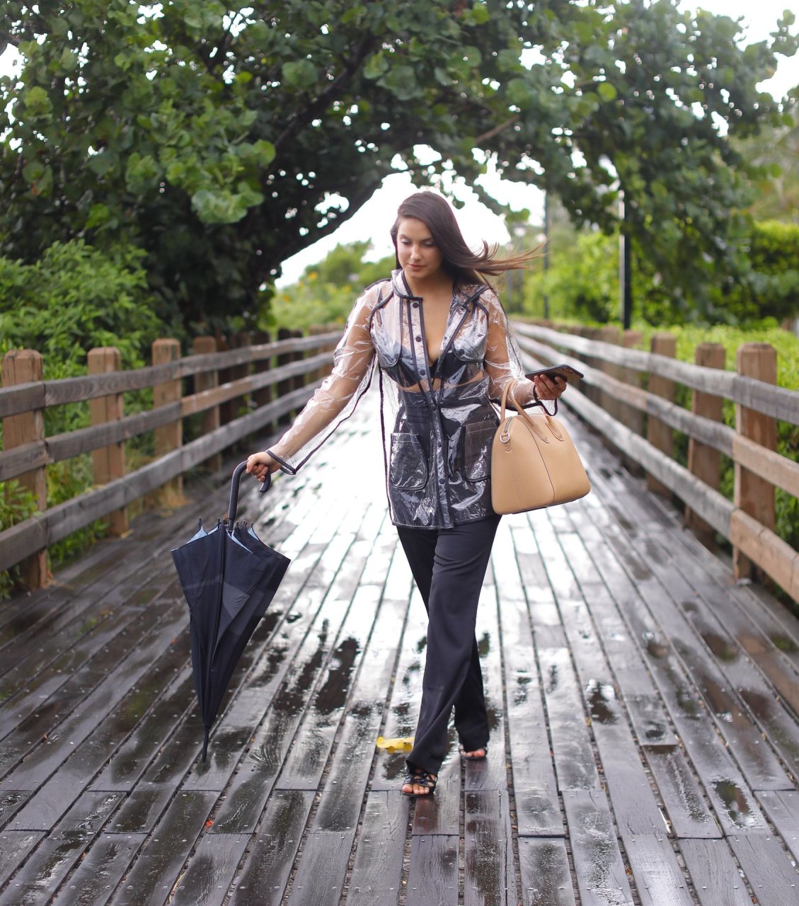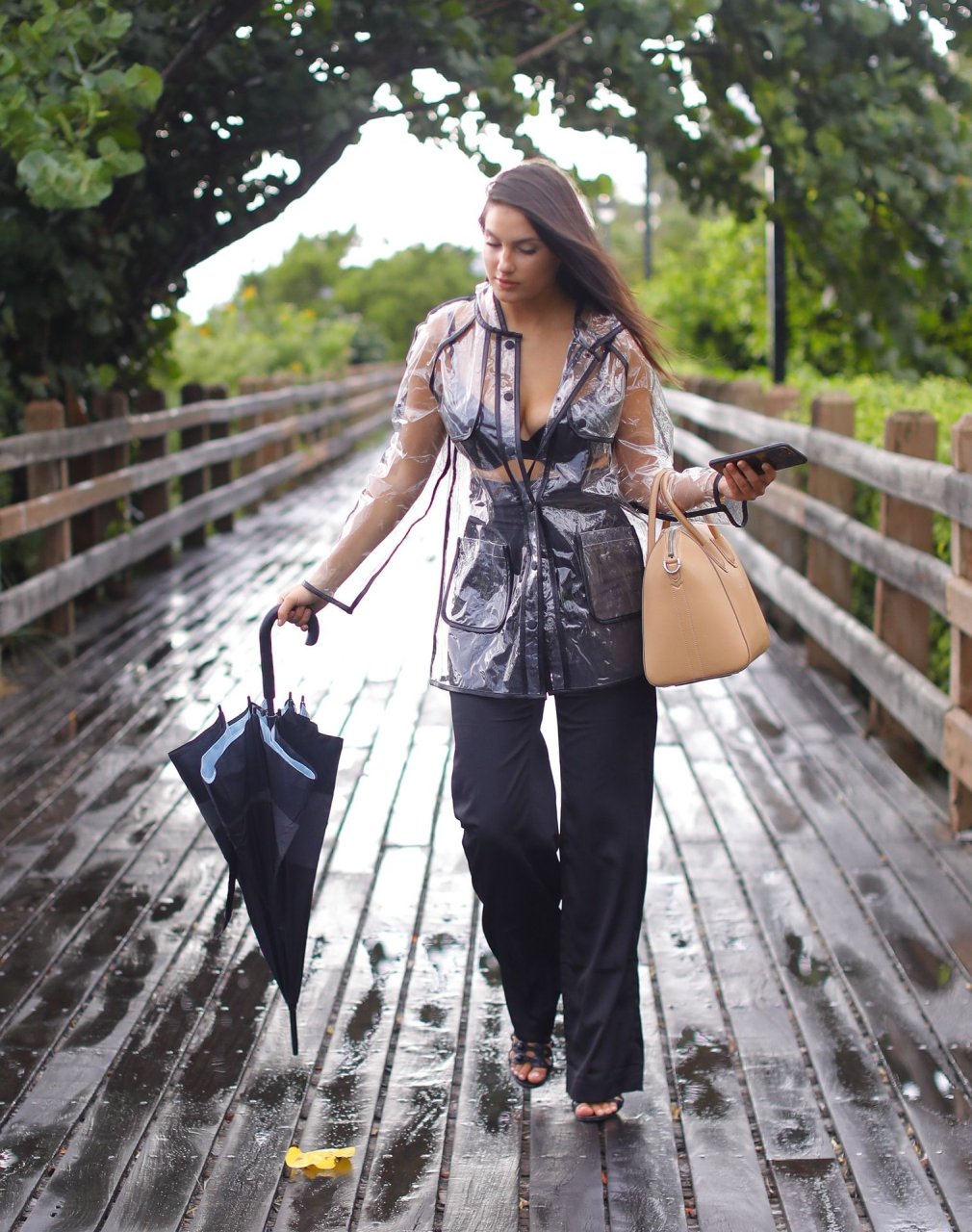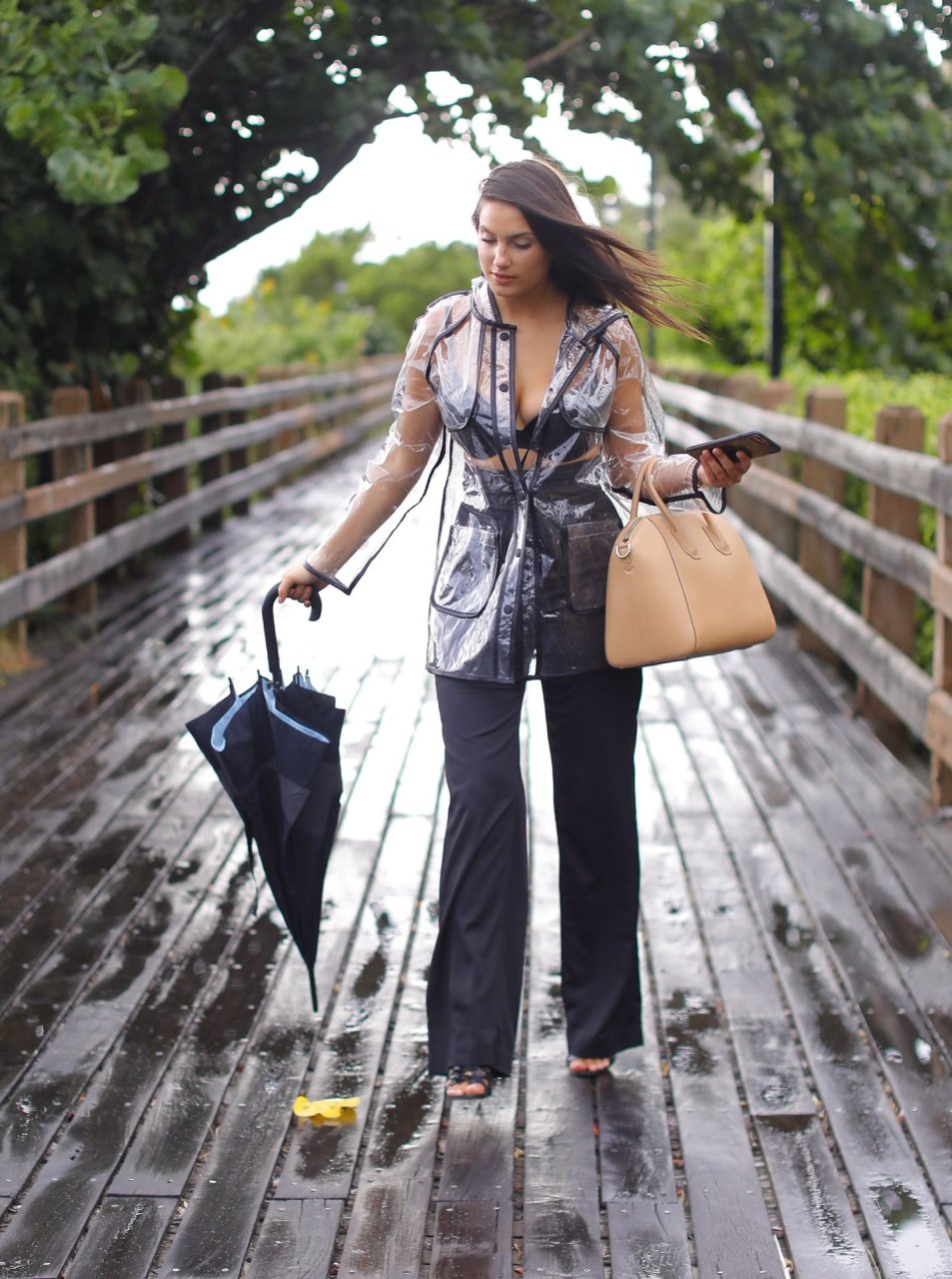 A modelo francesa Tao Wickrath impressiona enquanto caminha na chuva com uma capa de chuva transparente e sutiã por baixo, aproveitando um passeio na praia e um Starbucks em Miami em um dia chuvoso, 25/08/2018.