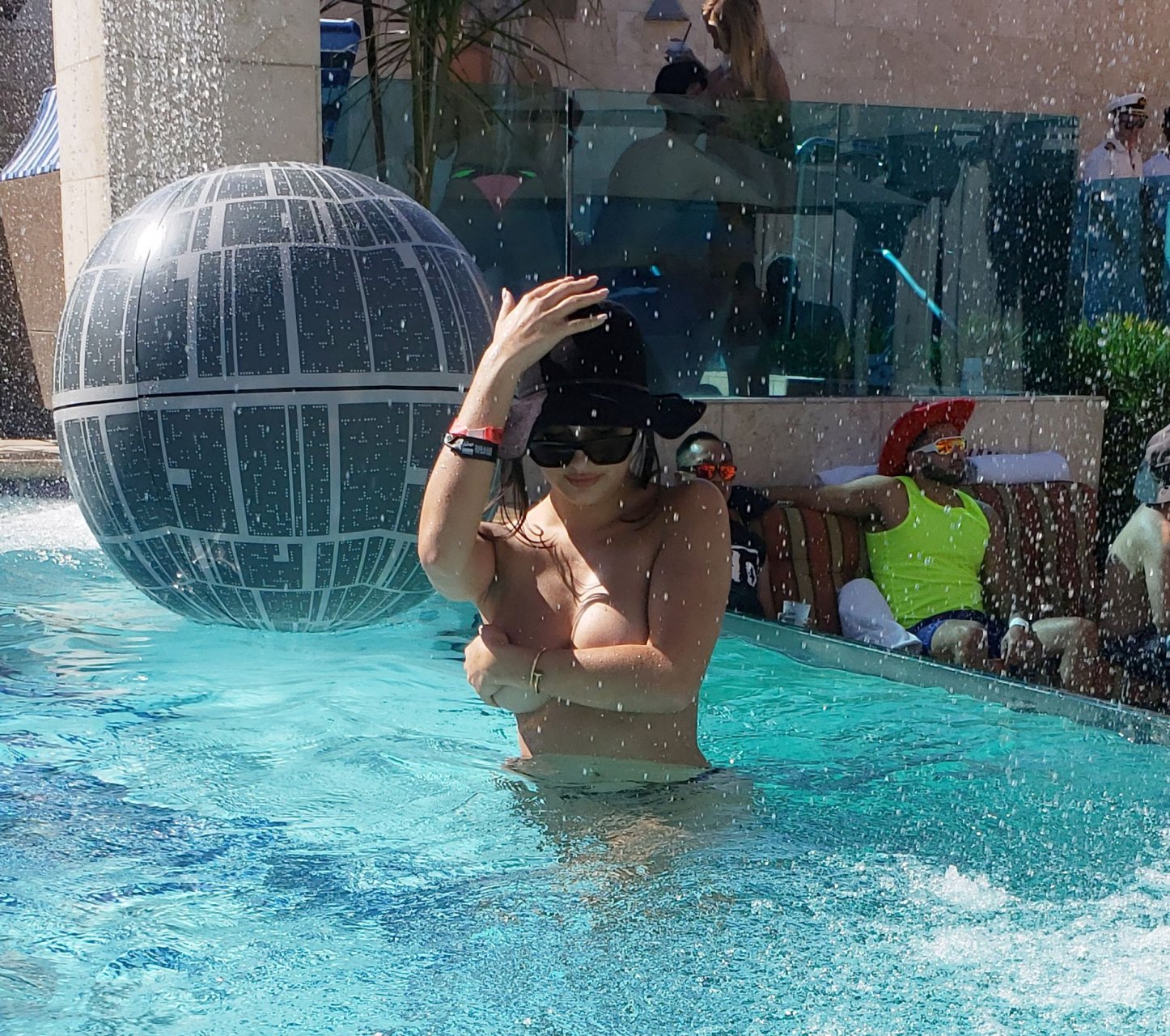 A modelo estava se divertindo na piscina VIP do clube diurno Sapphire, onde havia um balão da Estrela da Morte de Star Wars na piscina ao lado dela. Tao também foi vista mais tarde na piscina do Ceasar’s Palace segurando uma lata na mão para celebrar o feriado mexicano sob o sol quente.