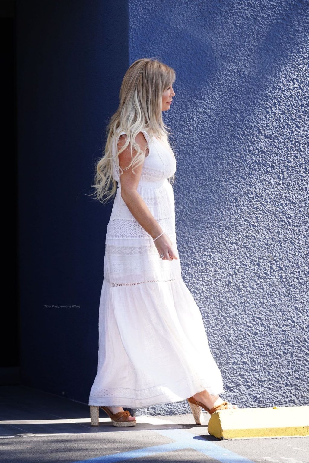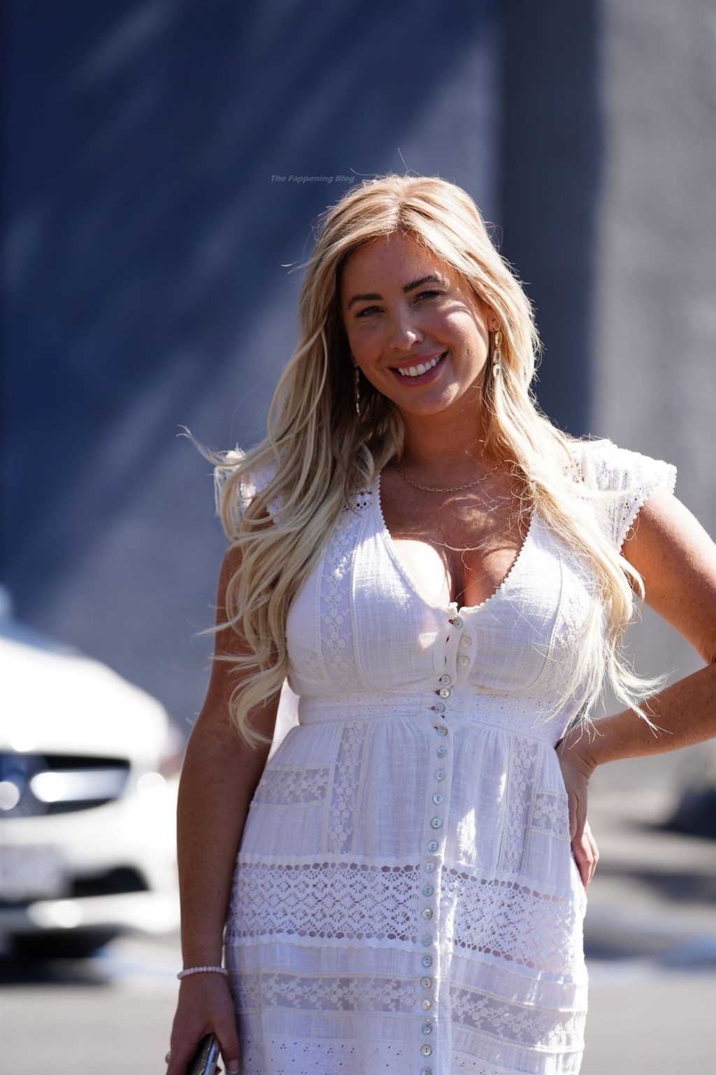 Tasha Reign é vista fora do JAM Studios em North Hollywood, 02/03/2021. A loira mostra seus enormes seios, vestindo um vestido branco.