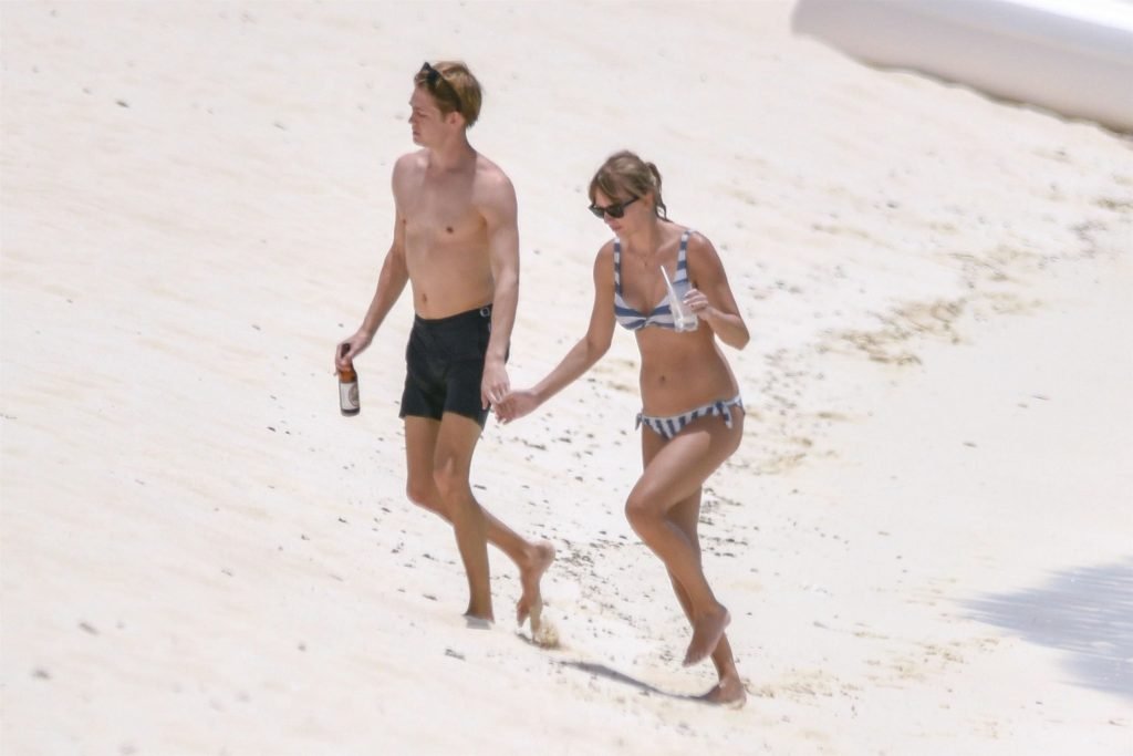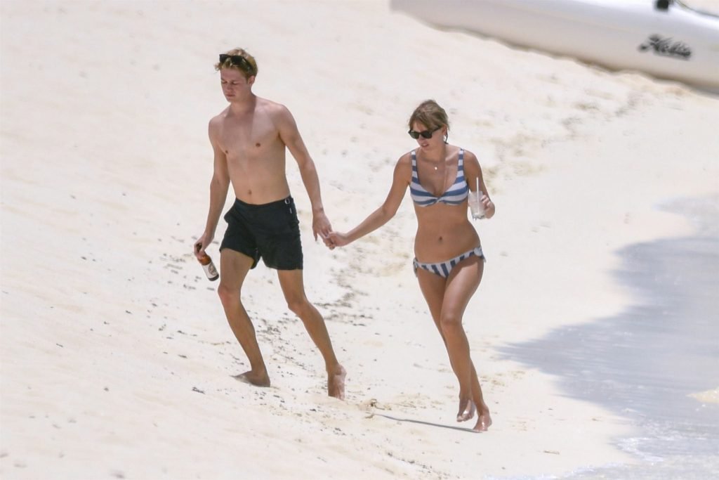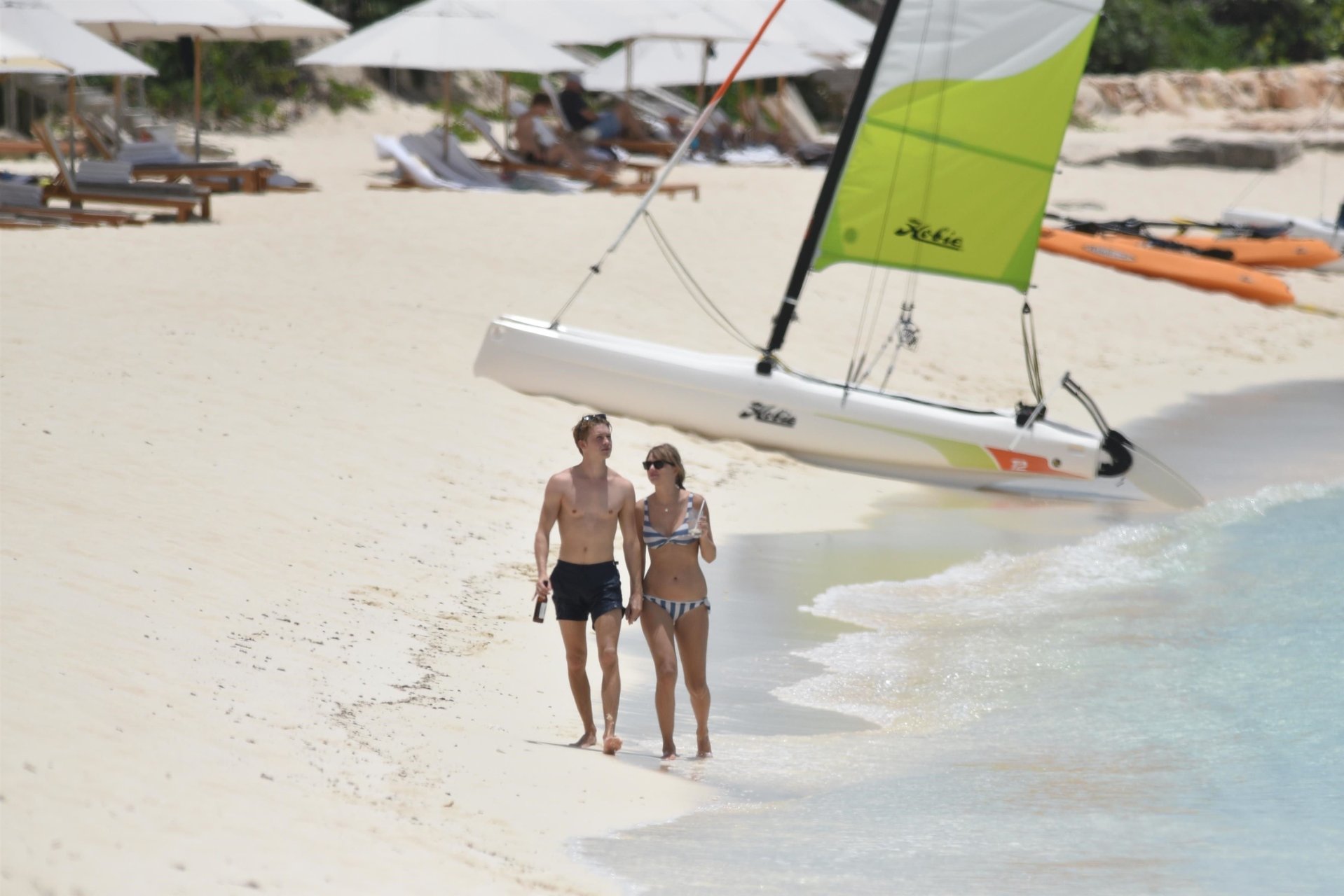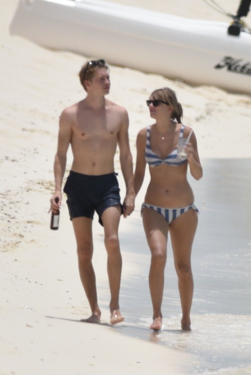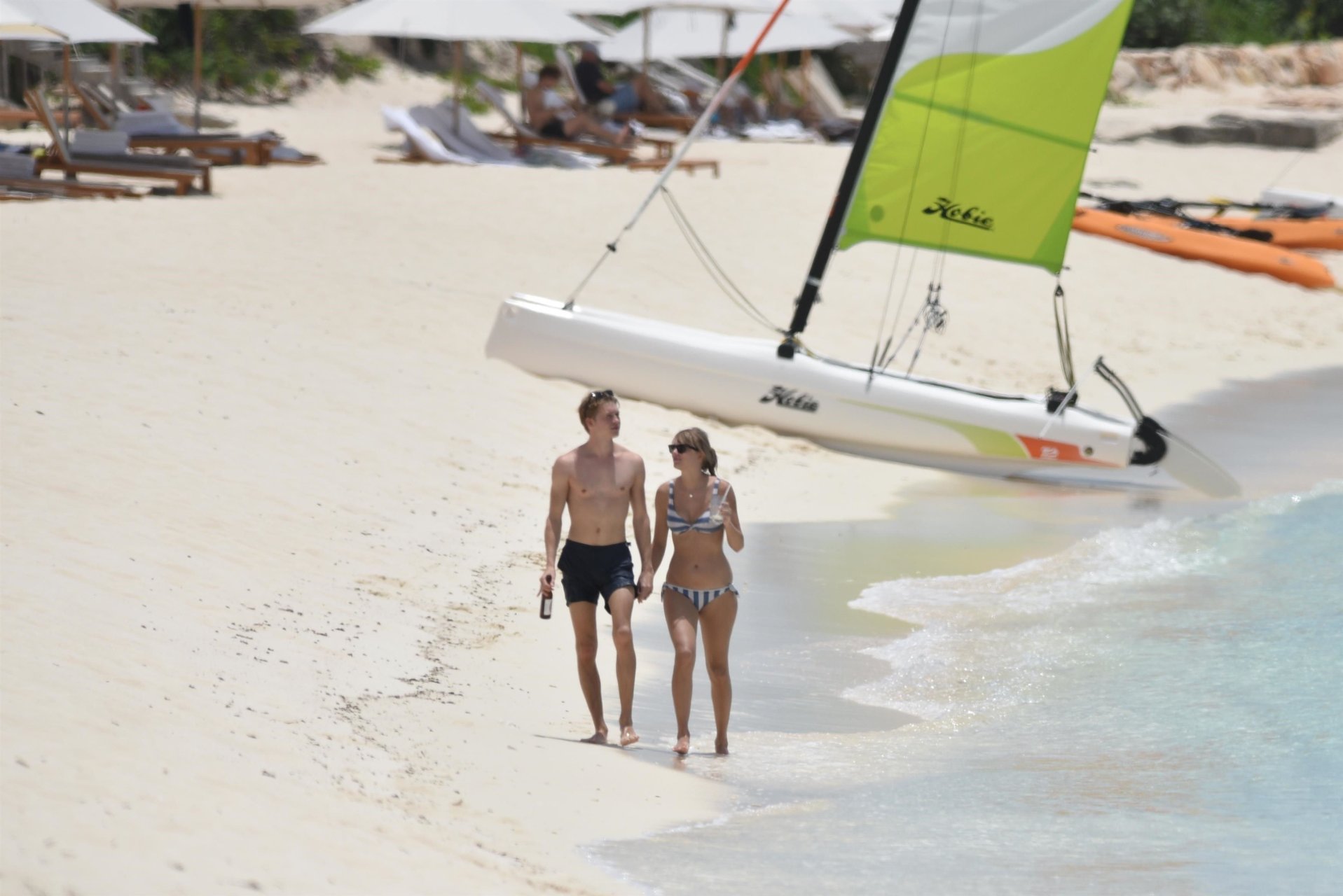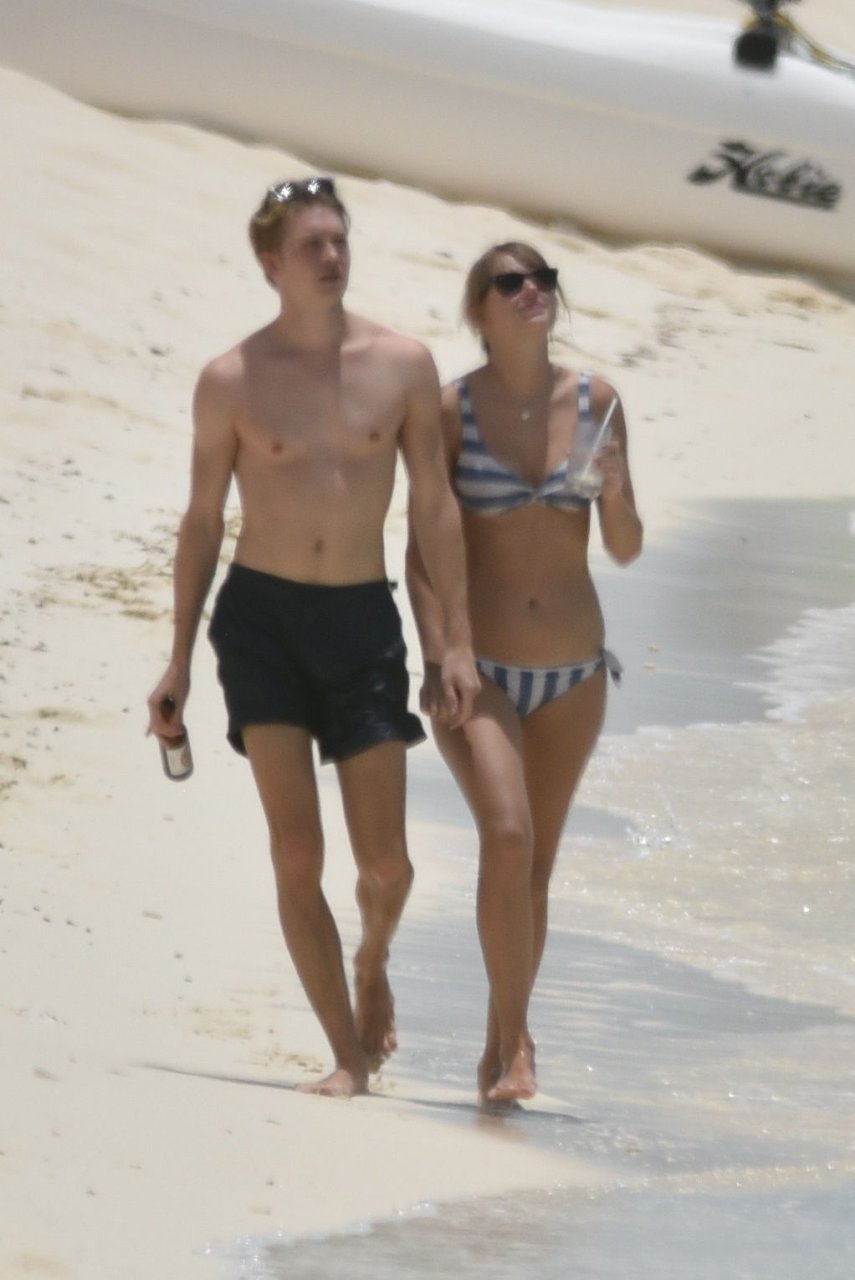 Taylor Swift e seu namorado Joe Alwyn continuam sua escapada romântica em um resort privado de luxo em Turks e Caicos, 05/07/2018. O casal aproveitou algumas bebidas na praia enquanto caminhavam de mãos dadas após um rápido mergulho no oceano. Taylor exibiu seu corpo tonificado em um biquíni listrado azul e branco.