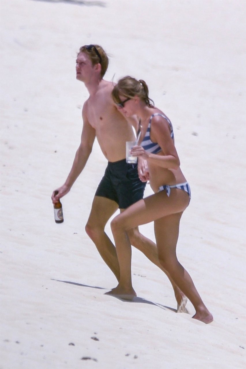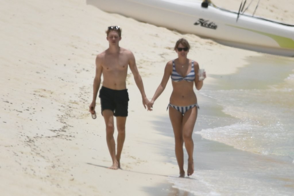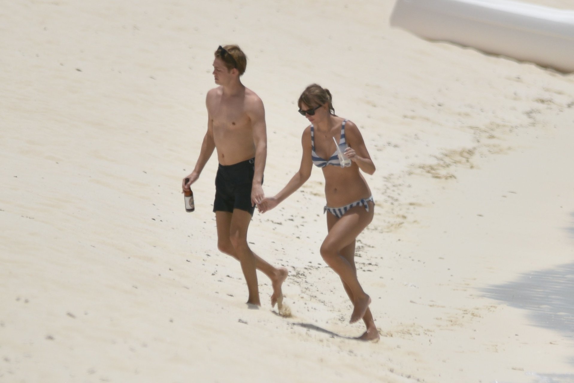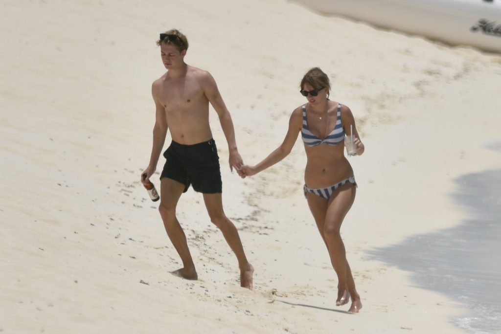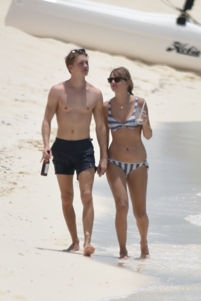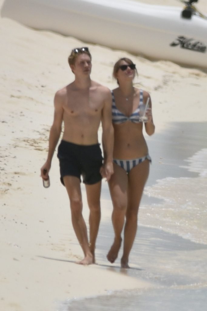 Taylor Swift e seu namorado Joe Alwyn continuam sua escapada romântica em um resort privado de luxo em Turks e Caicos, 05/07/2018. O casal aproveitou algumas bebidas na praia enquanto caminhavam de mãos dadas após um rápido mergulho no oceano. Taylor exibiu seu corpo tonificado em um biquíni listrado azul e branco.