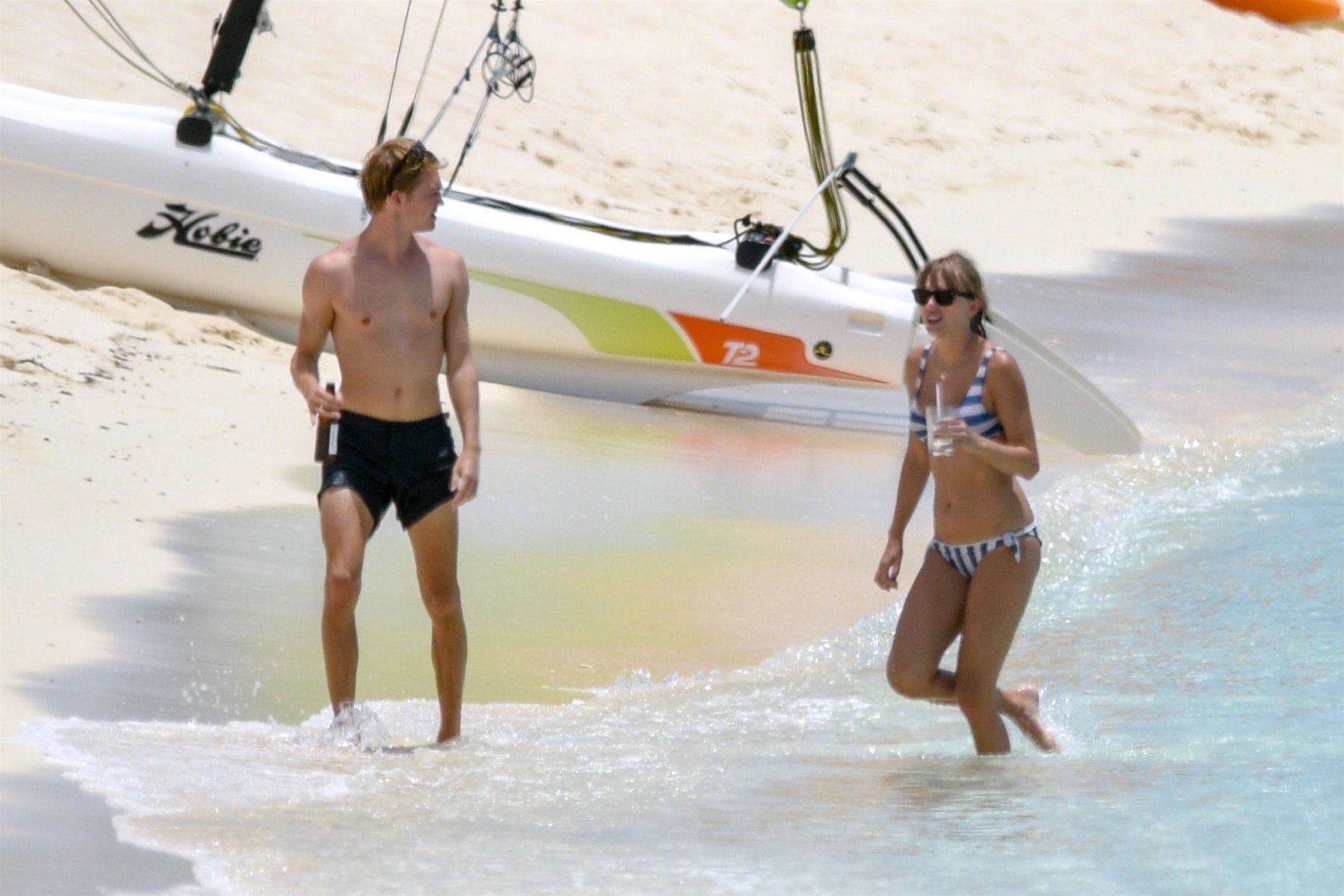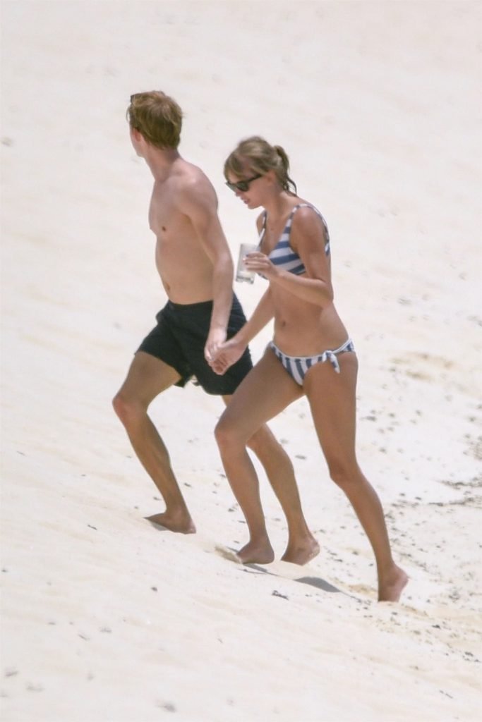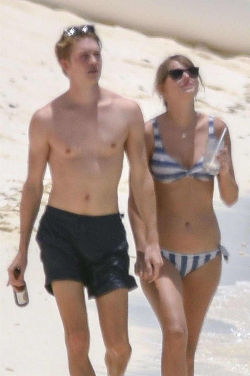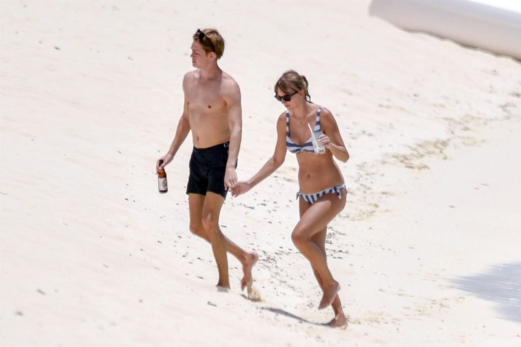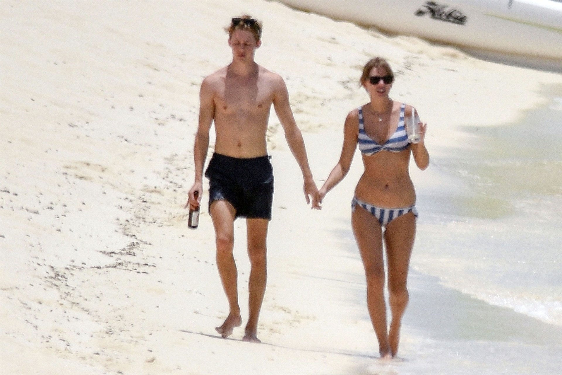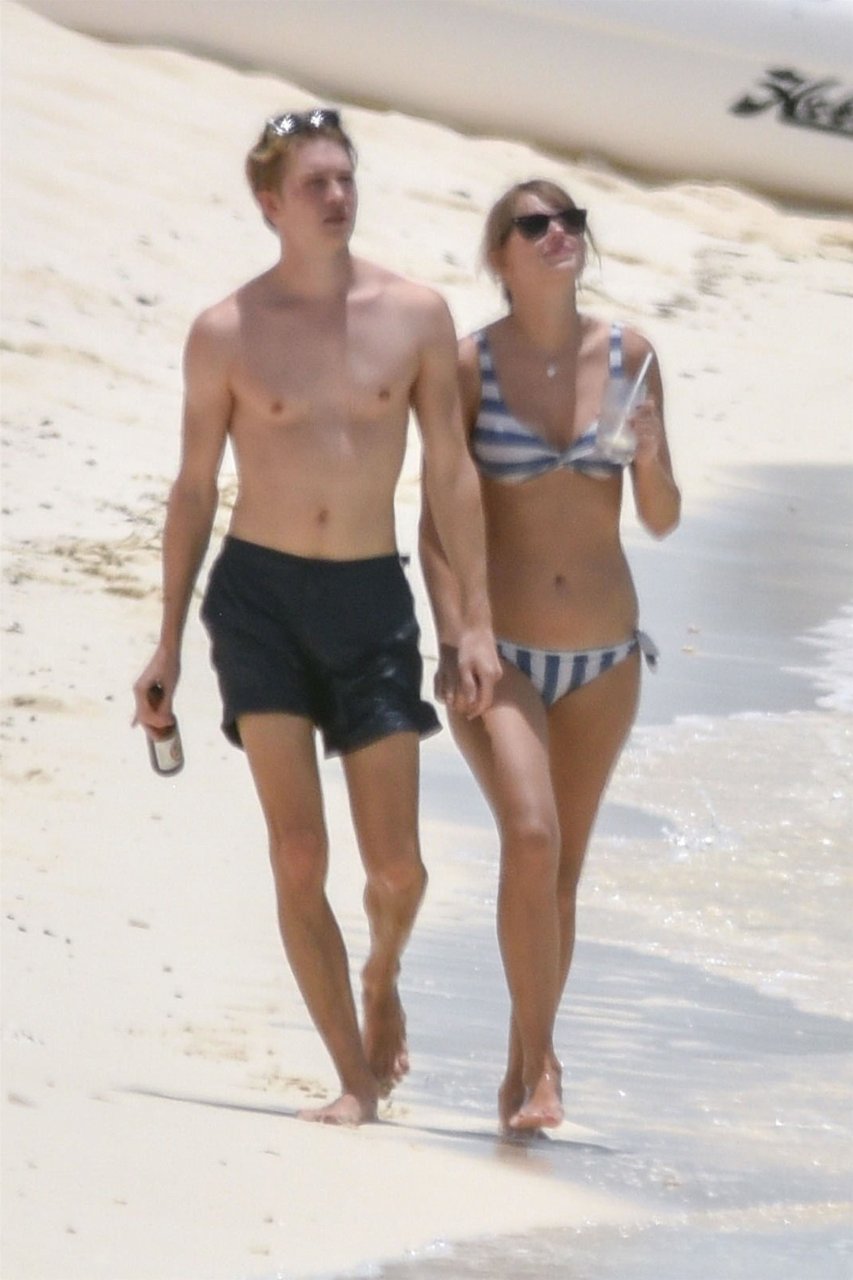 Taylor Swift e seu namorado Joe Alwyn continuam sua escapada romântica em um resort privado de luxo em Turks e Caicos, 05/07/2018. O casal aproveitou algumas bebidas na praia enquanto caminhavam de mãos dadas após um rápido mergulho no oceano. Taylor exibiu seu corpo tonificado em um biquíni listrado azul e branco.