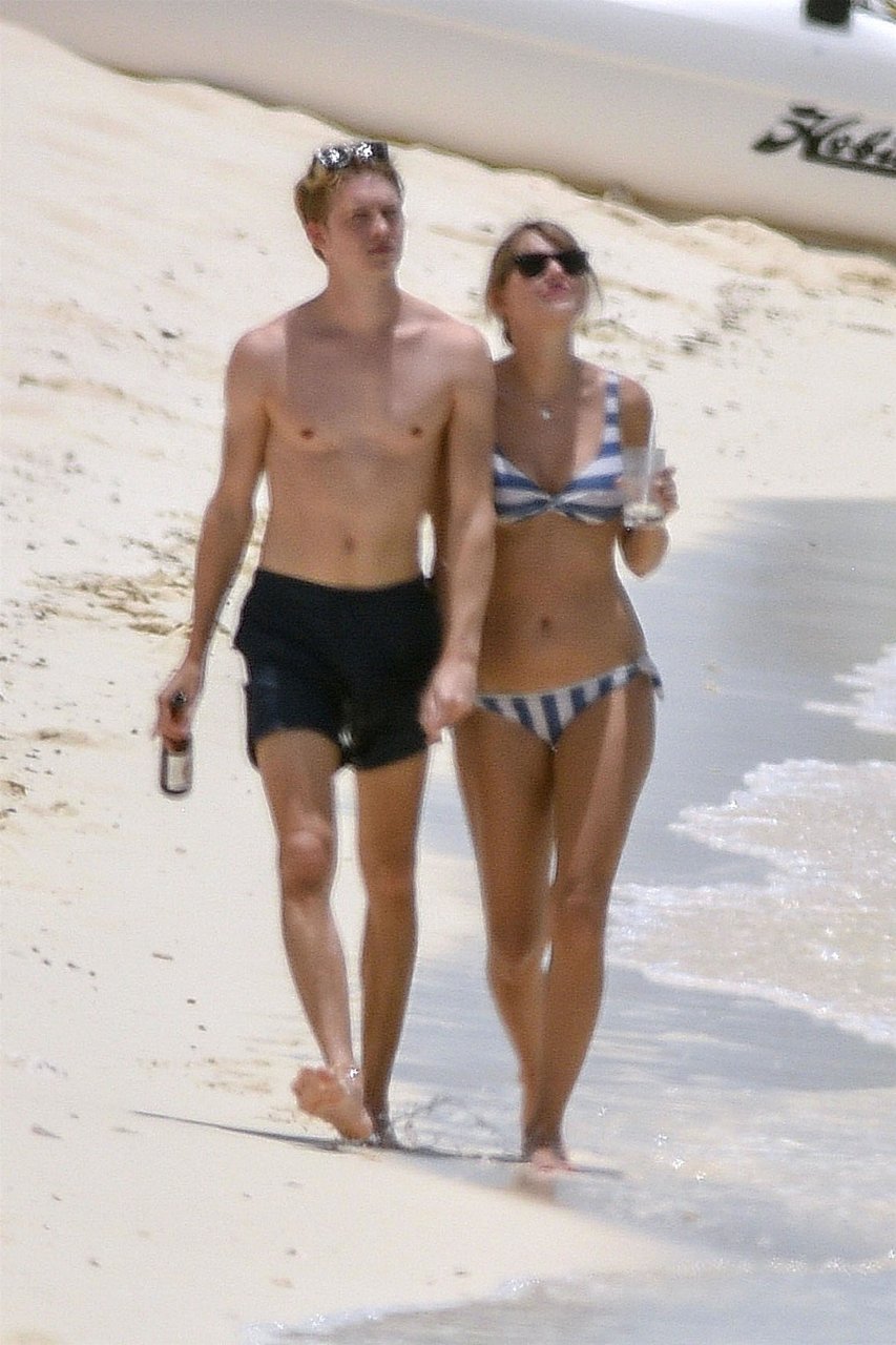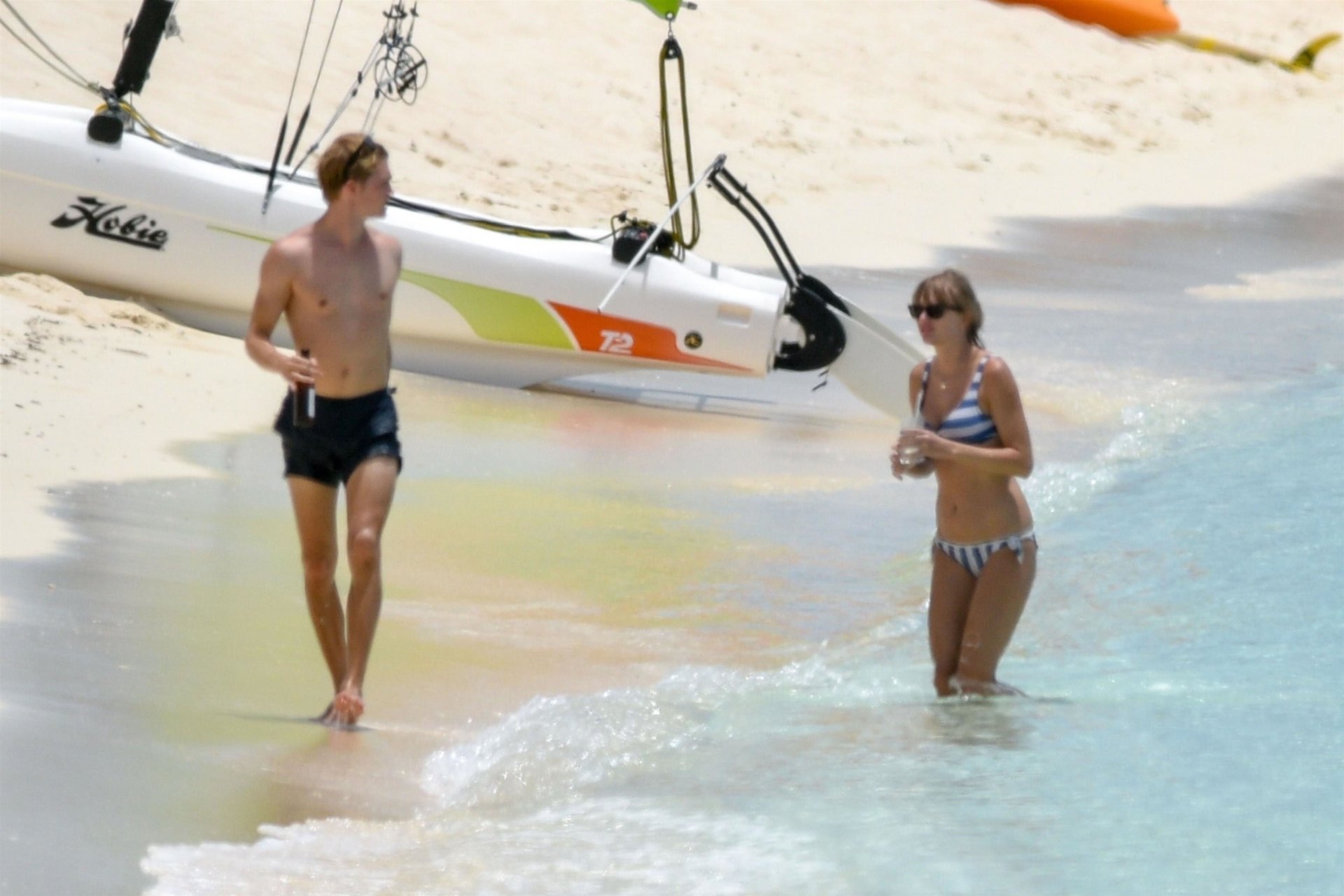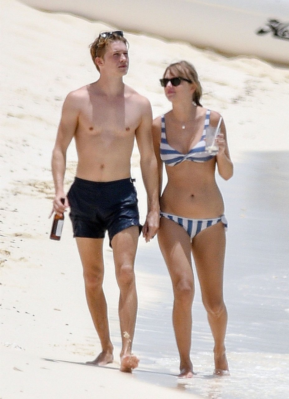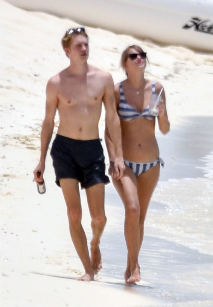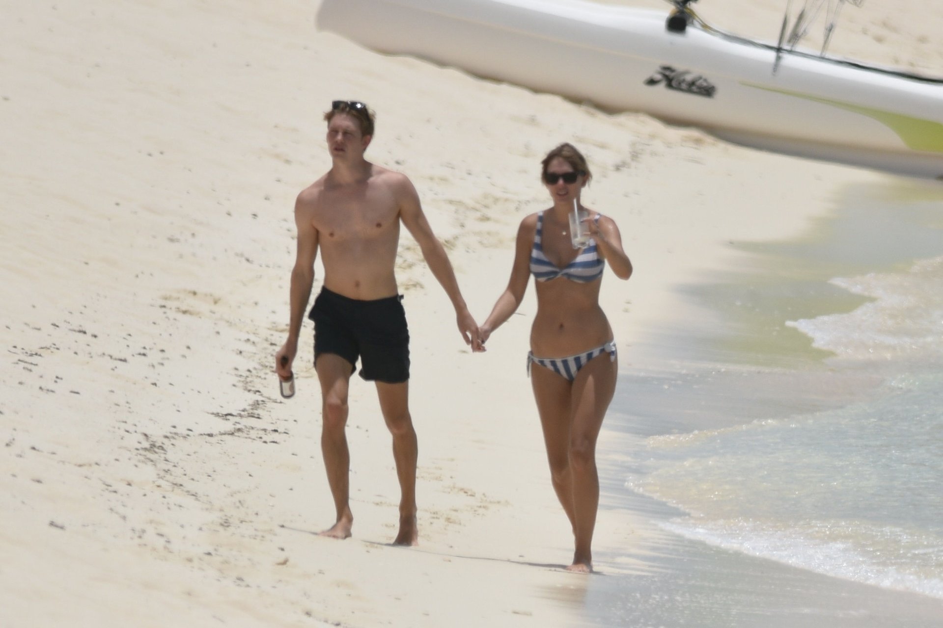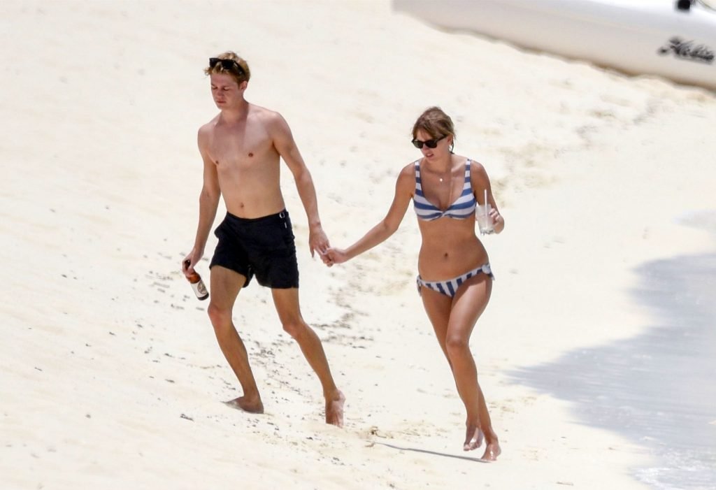 Taylor Swift e seu namorado Joe Alwyn continuam sua escapada romântica em um resort privado de luxo em Turks e Caicos, 05/07/2018. O casal aproveitou algumas bebidas na praia enquanto caminhavam de mãos dadas após um rápido mergulho no oceano. Taylor exibiu seu corpo tonificado em um biquíni listrado azul e branco.