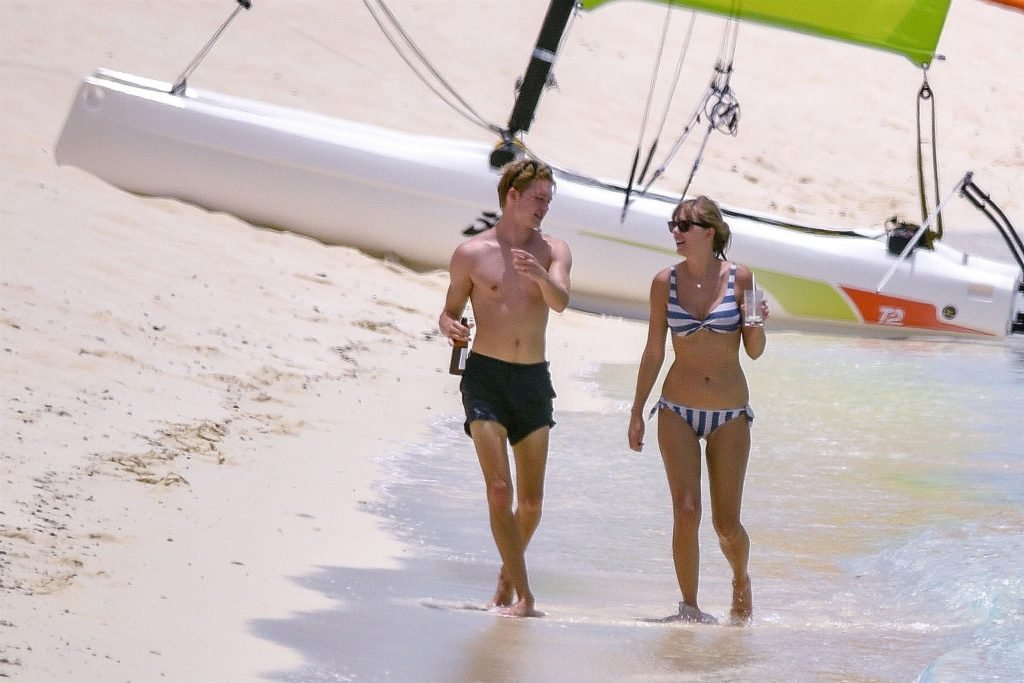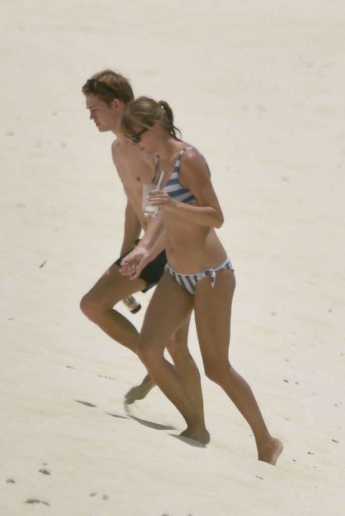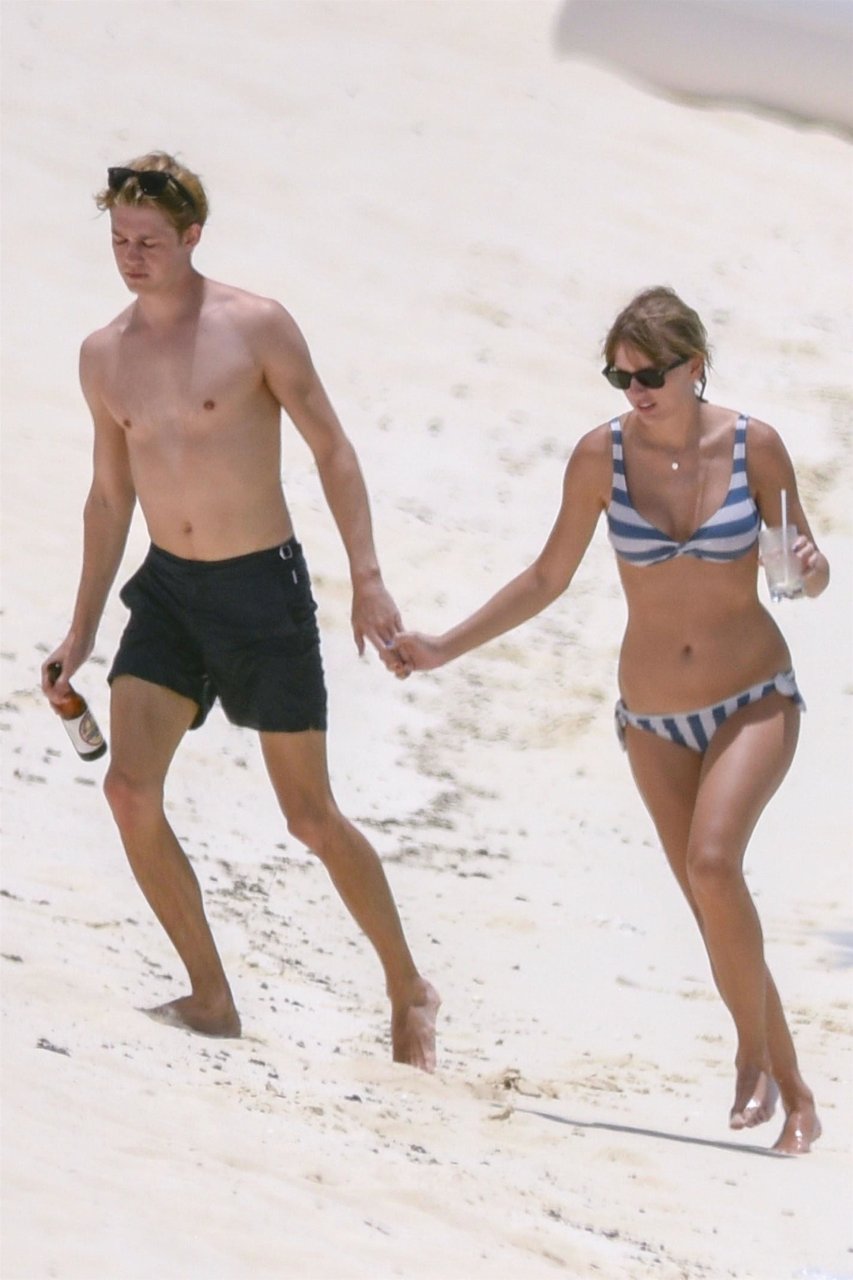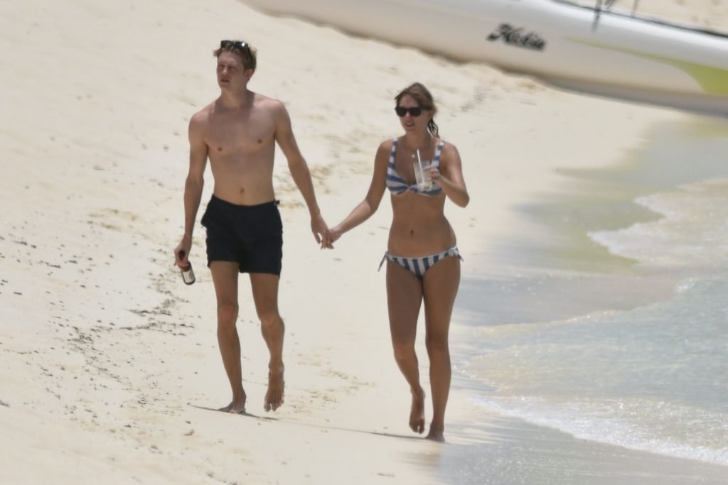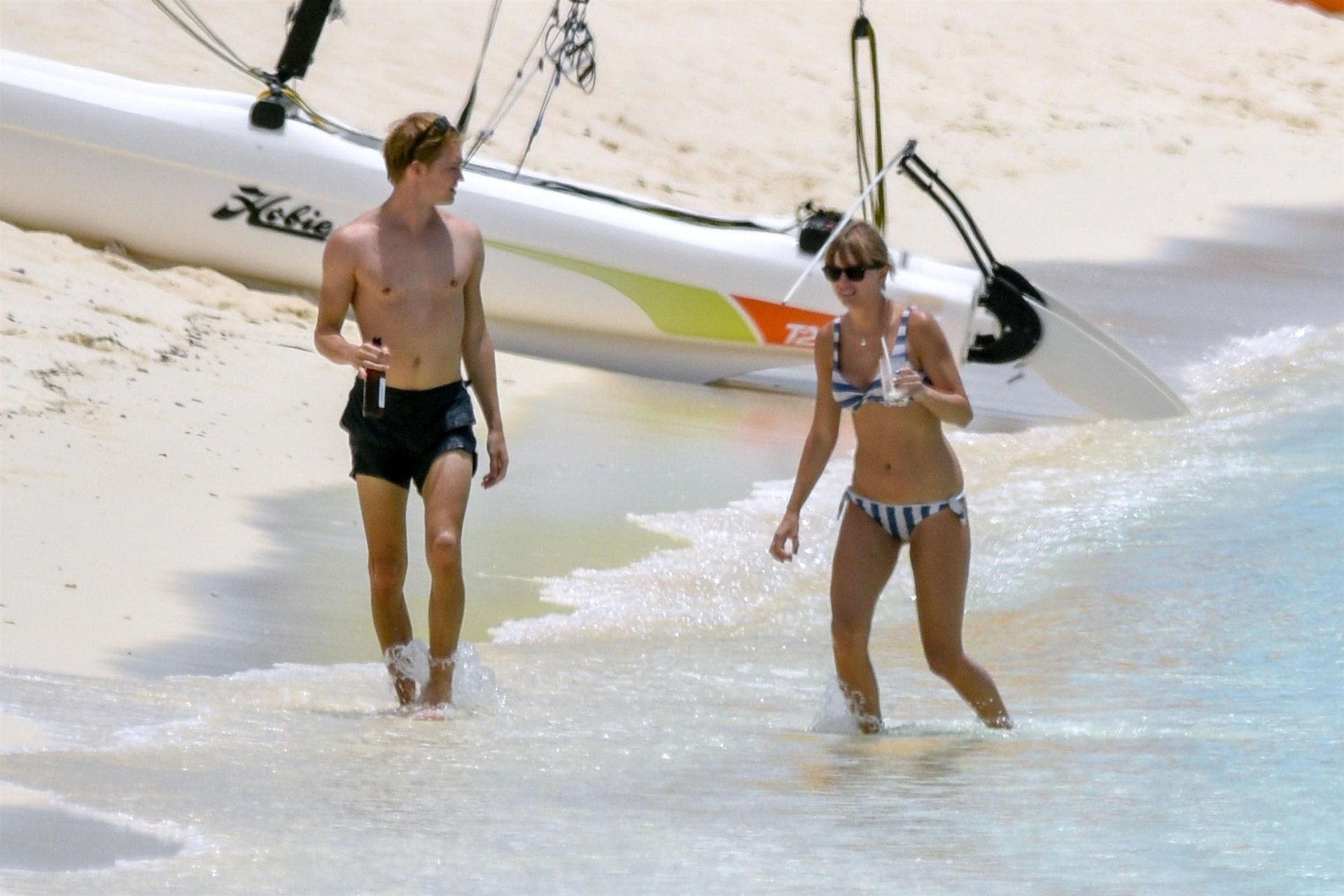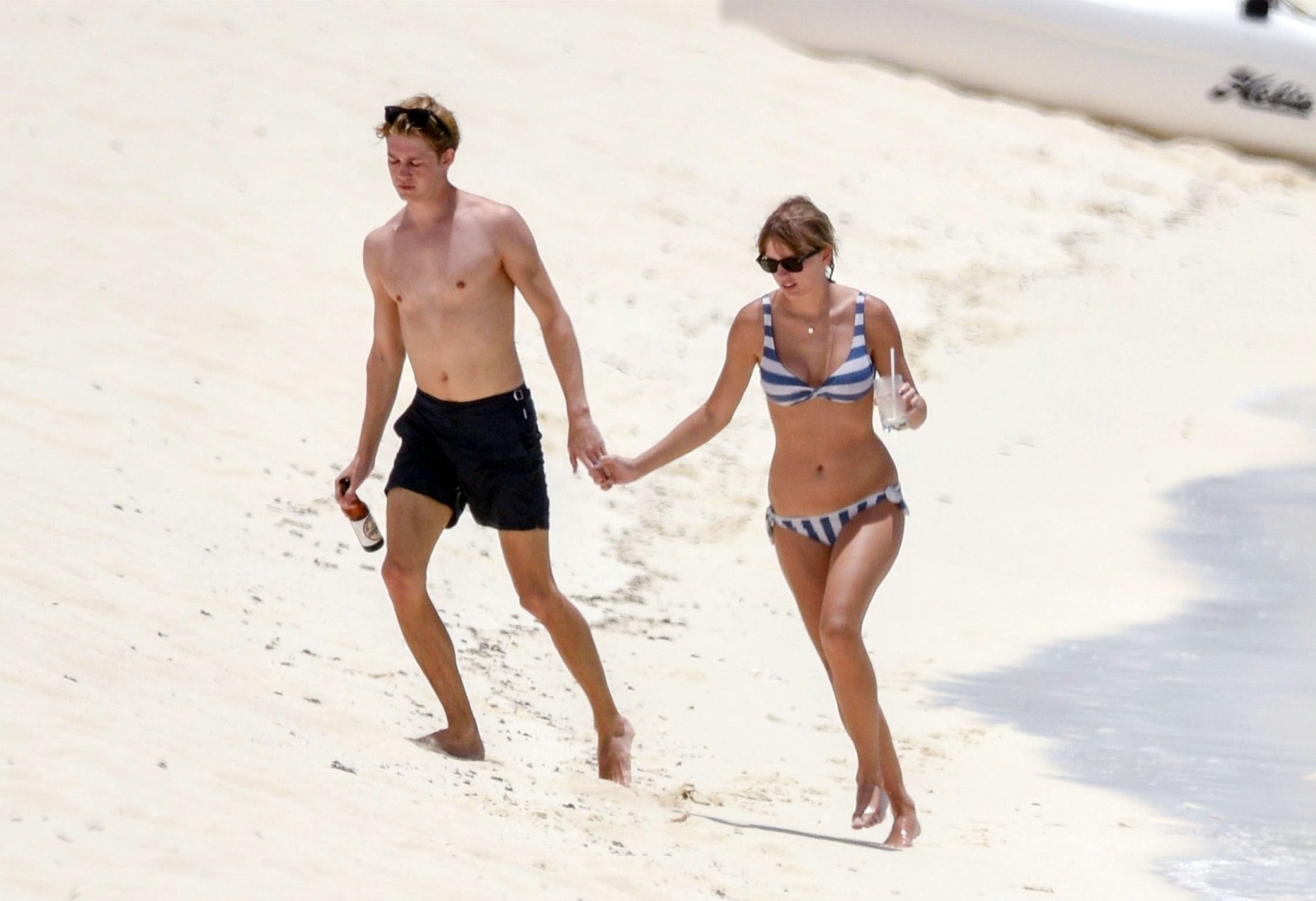 Taylor Swift e seu namorado Joe Alwyn continuam sua escapada romântica em um resort privado de luxo em Turks e Caicos, 05/07/2018. O casal aproveitou algumas bebidas na praia enquanto caminhavam de mãos dadas após um rápido mergulho no oceano. Taylor exibiu seu corpo tonificado em um biquíni listrado azul e branco.
