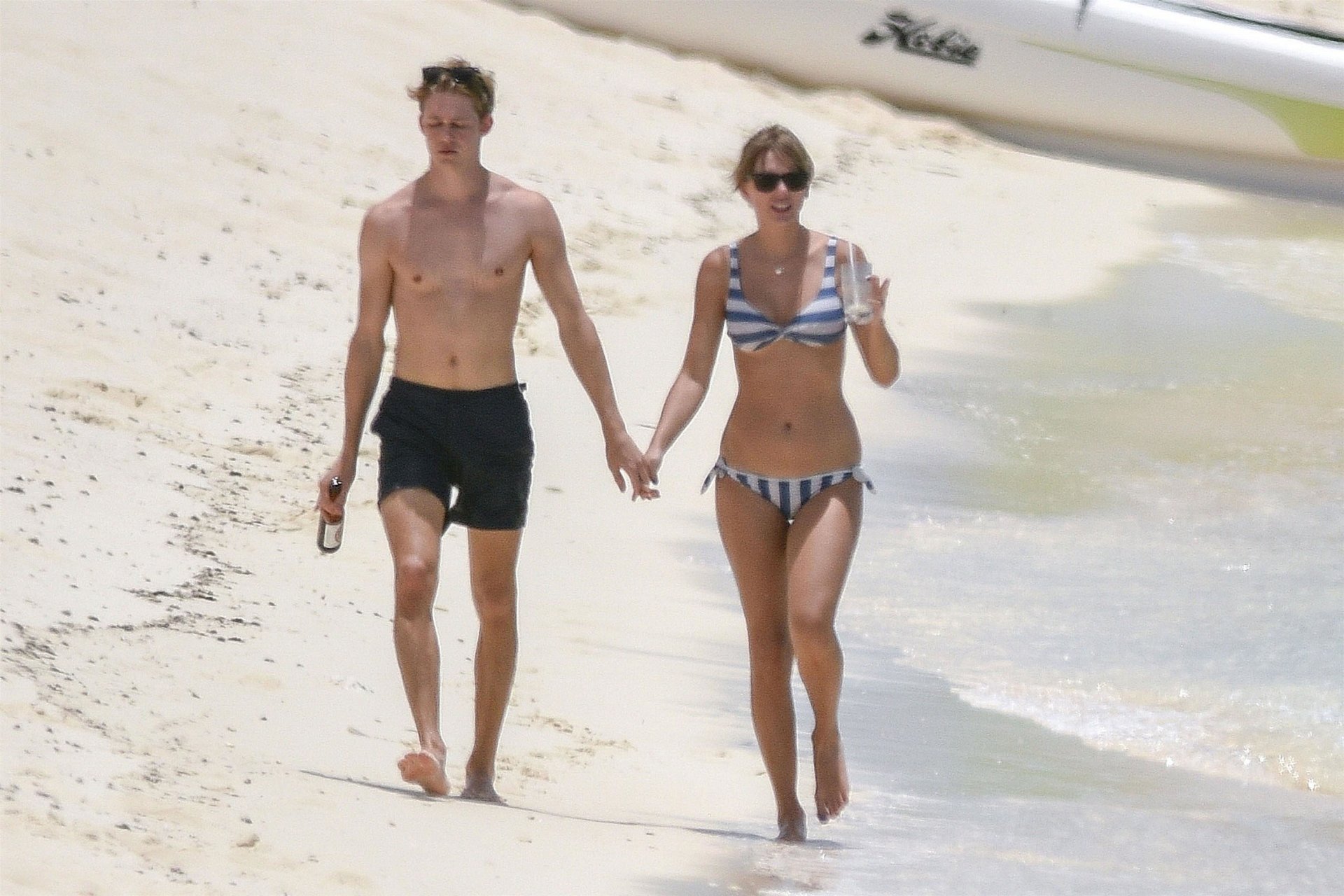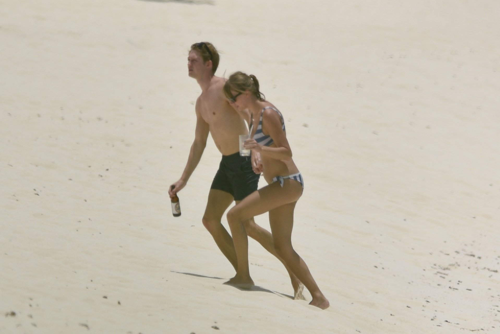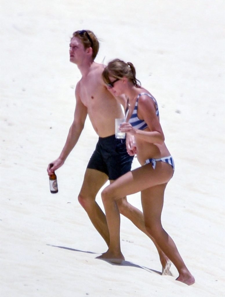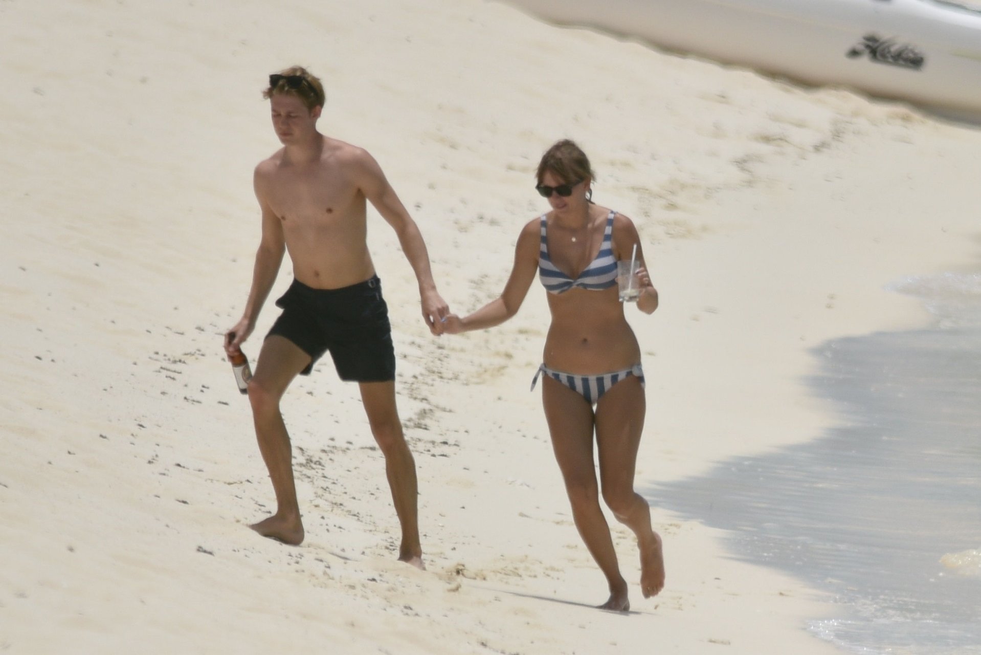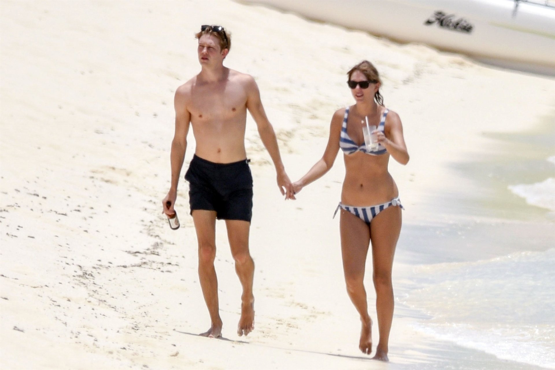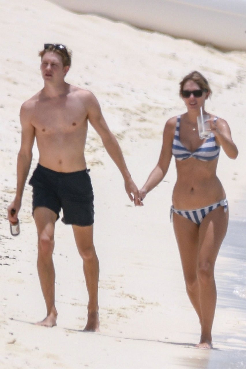 Taylor Swift e seu namorado Joe Alwyn continuam sua escapada romântica em um resort privado de luxo em Turks e Caicos, 05/07/2018. O casal aproveitou algumas bebidas na praia enquanto caminhavam de mãos dadas após um rápido mergulho no oceano. Taylor exibiu seu corpo tonificado em um biquíni listrado azul e branco.