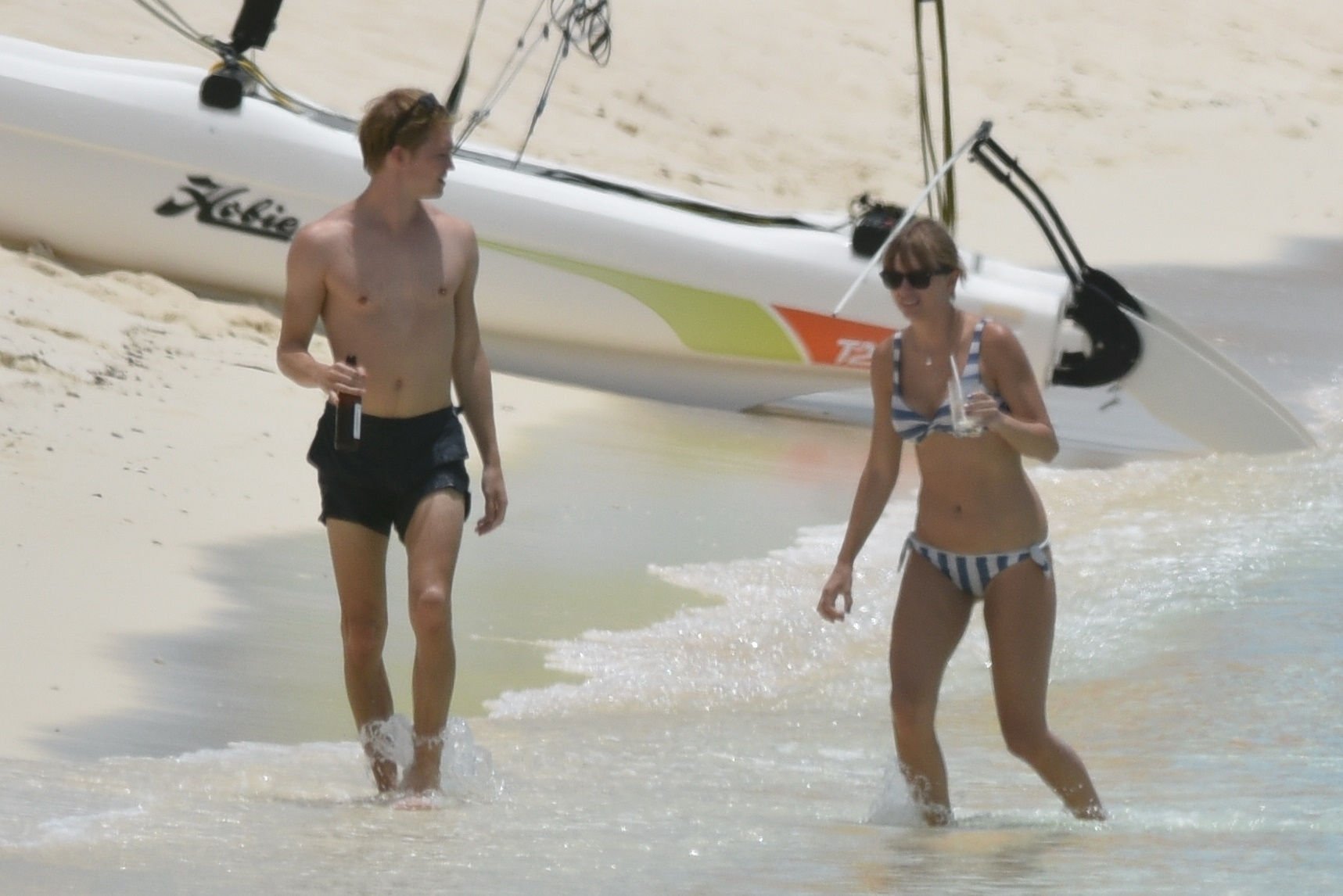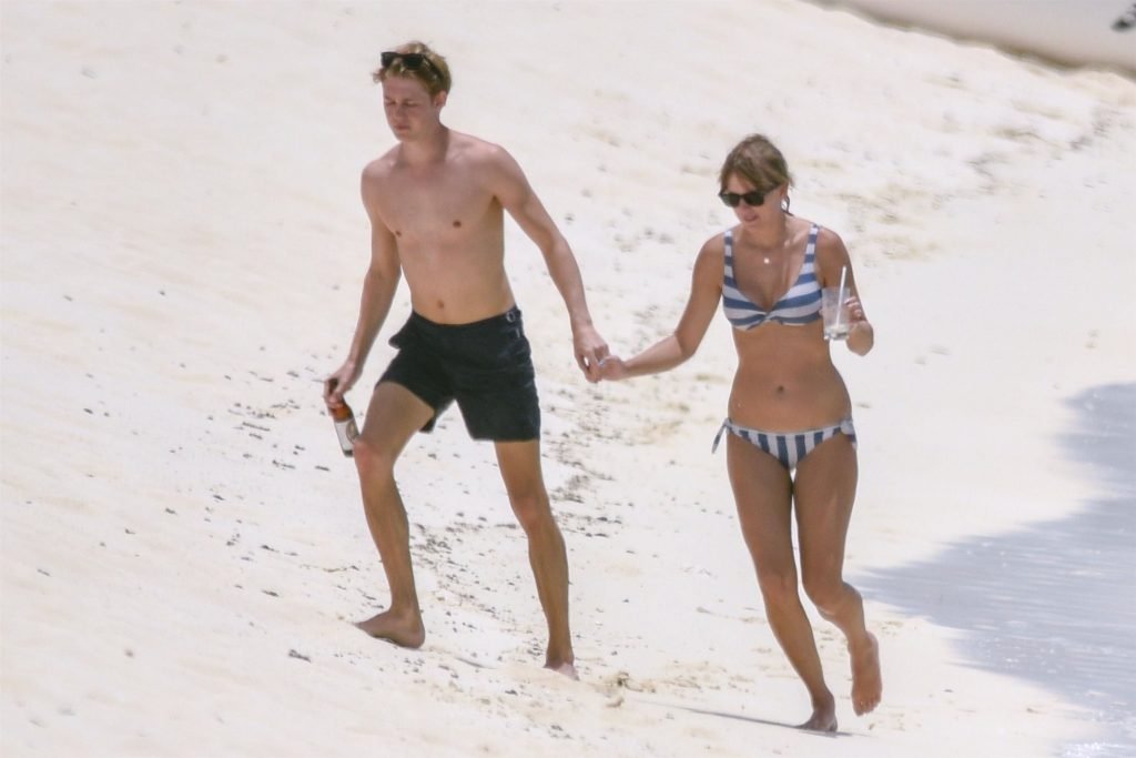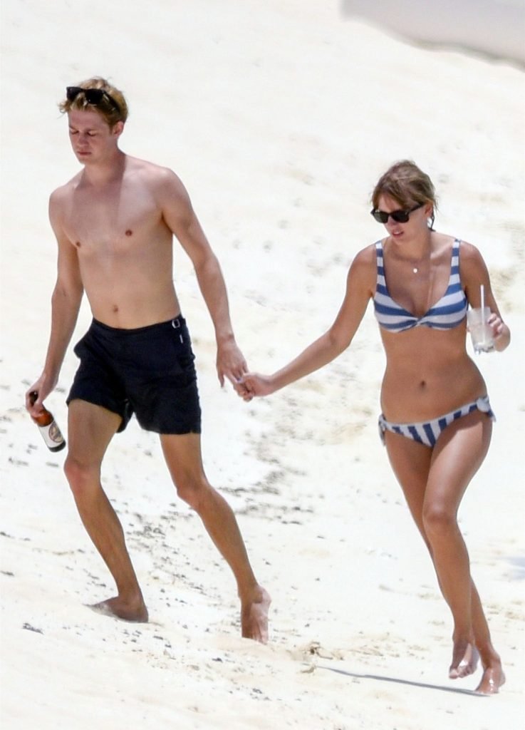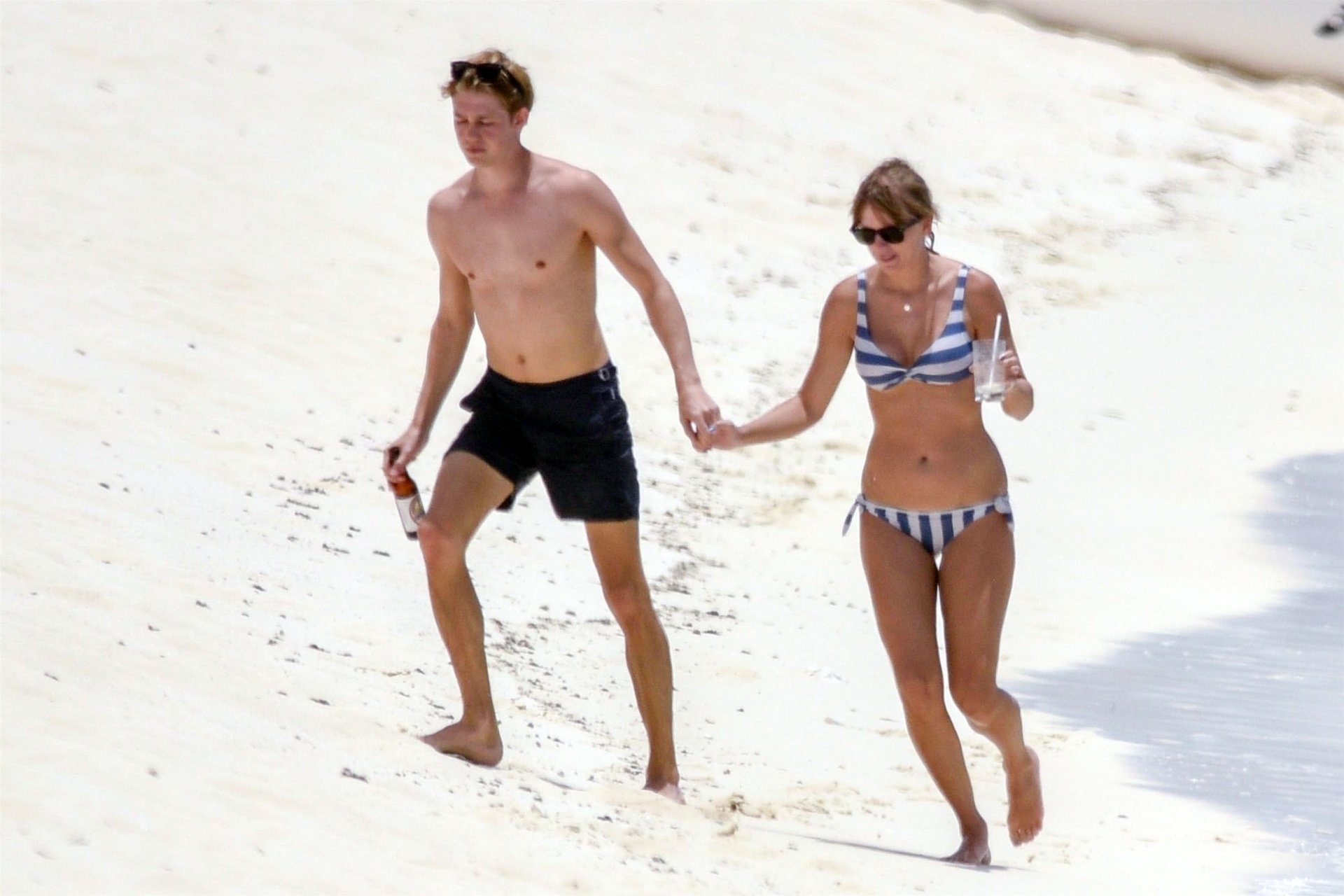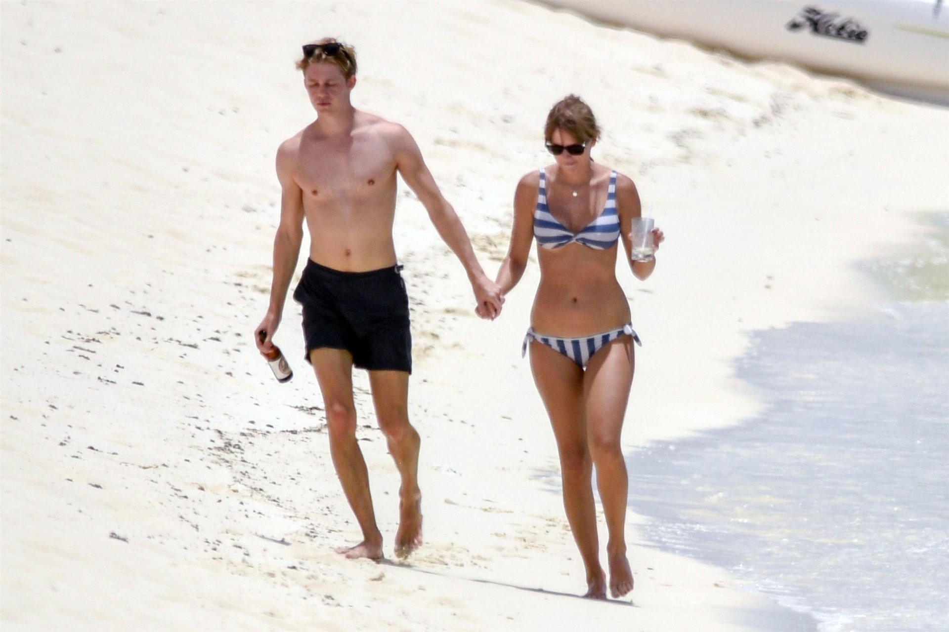 Taylor Swift e seu namorado Joe Alwyn continuam sua escapada romântica em um resort privado de luxo em Turks e Caicos, 05/07/2018. O casal aproveitou algumas bebidas na praia enquanto caminhavam de mãos dadas após um rápido mergulho no oceano. Taylor exibiu seu corpo tonificado em um biquíni listrado azul e branco.