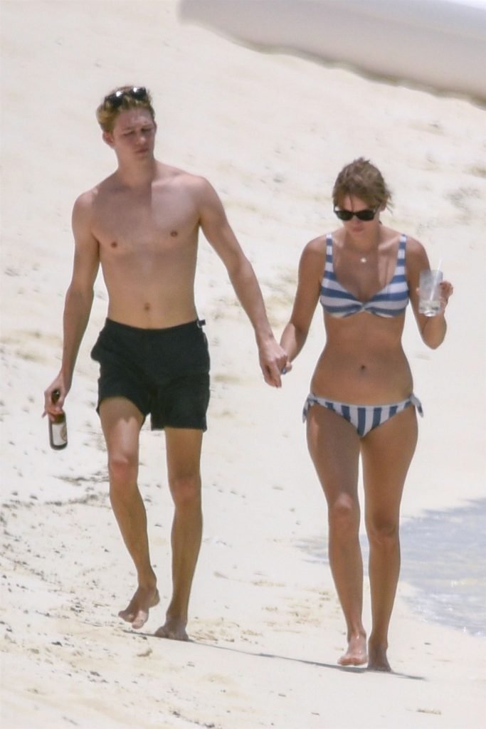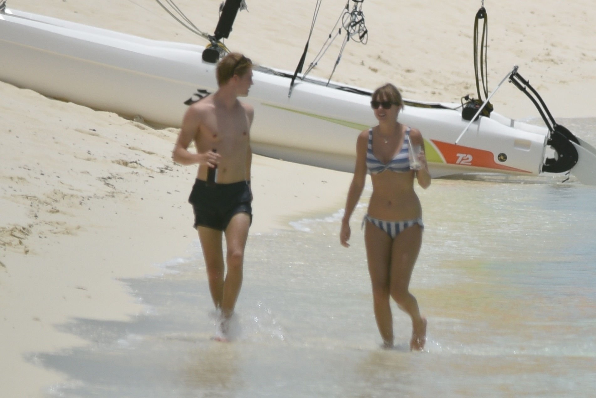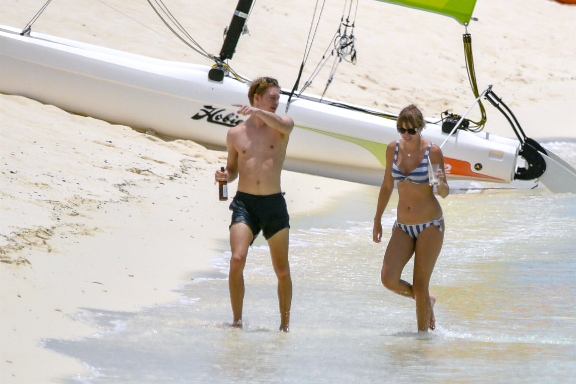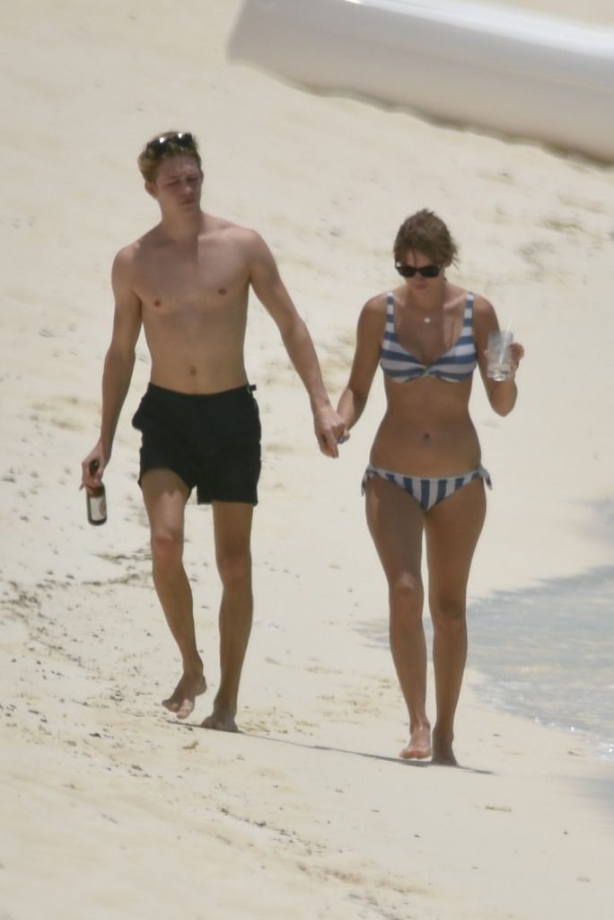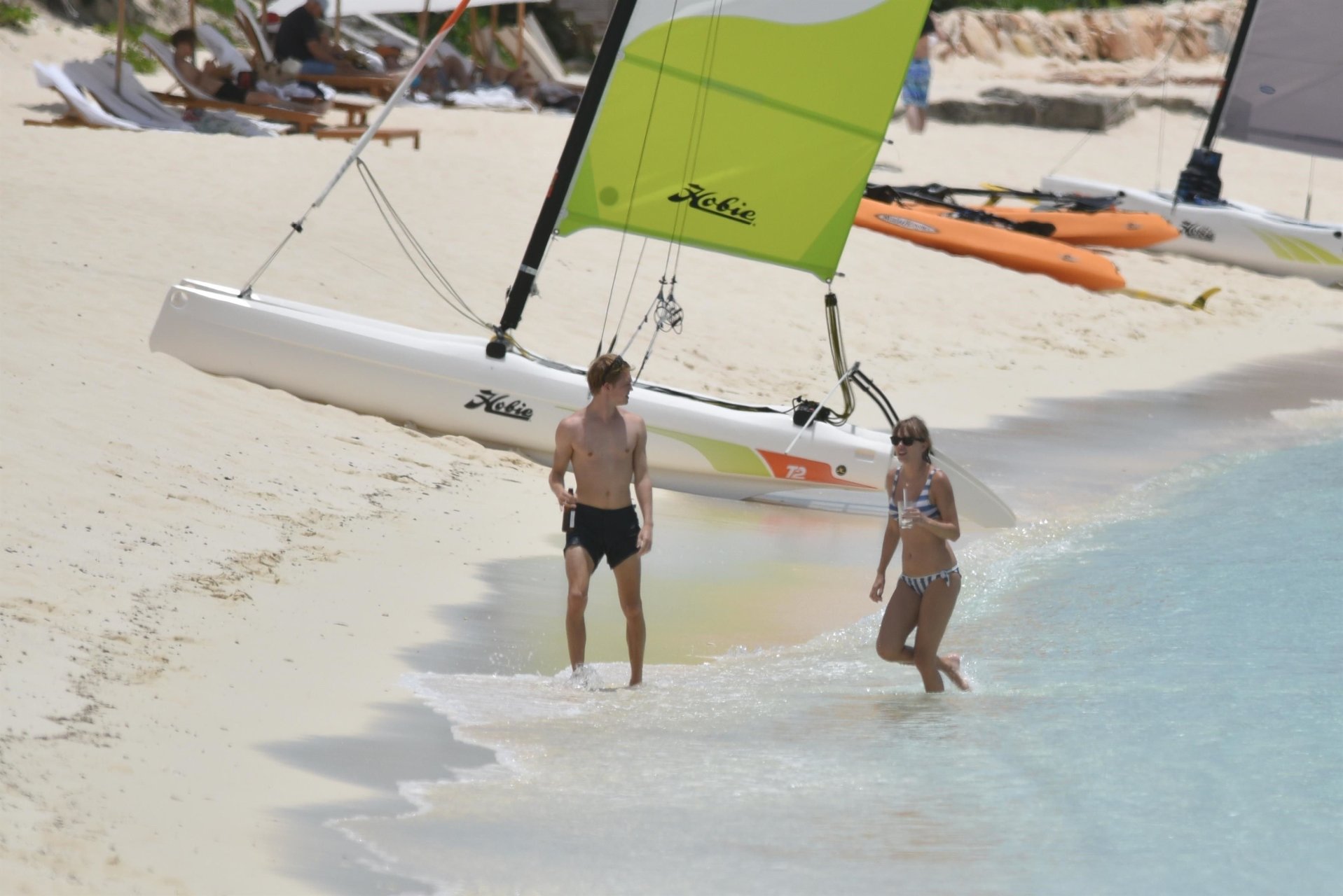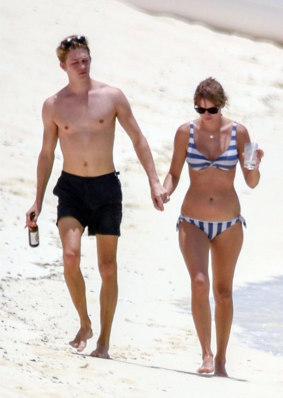 Taylor Swift e seu namorado Joe Alwyn continuam sua escapada romântica em um resort privado de luxo em Turks e Caicos, 05/07/2018. O casal aproveitou algumas bebidas na praia enquanto caminhavam de mãos dadas após um rápido mergulho no oceano. Taylor exibiu seu corpo tonificado em um biquíni listrado azul e branco.