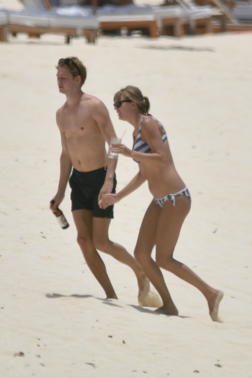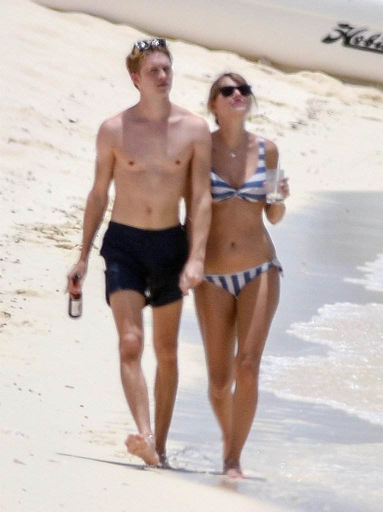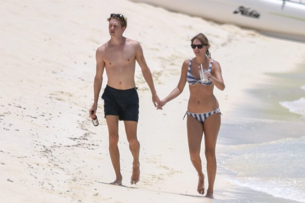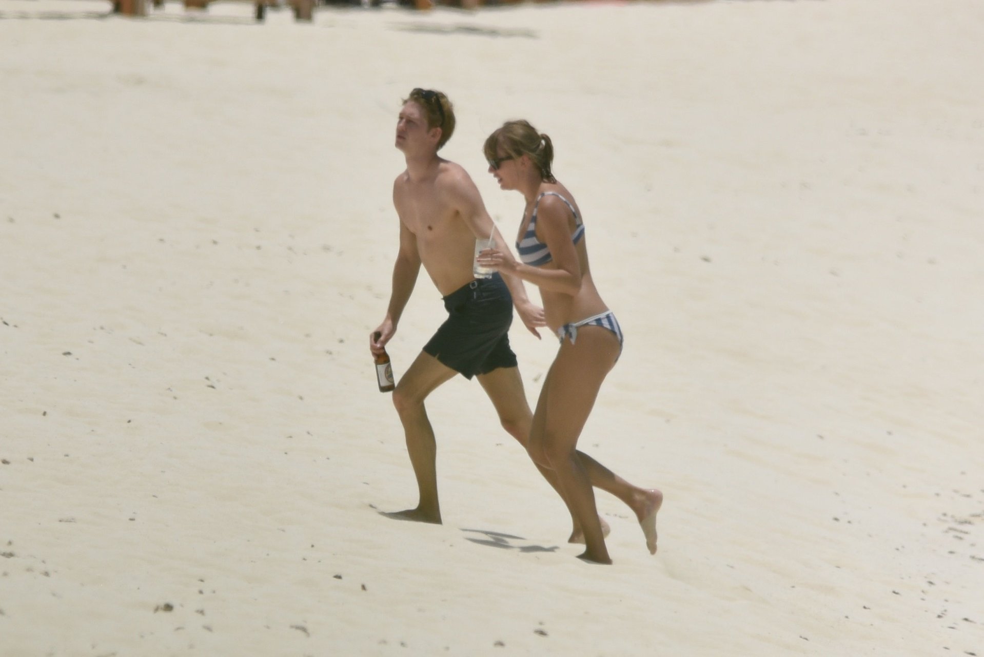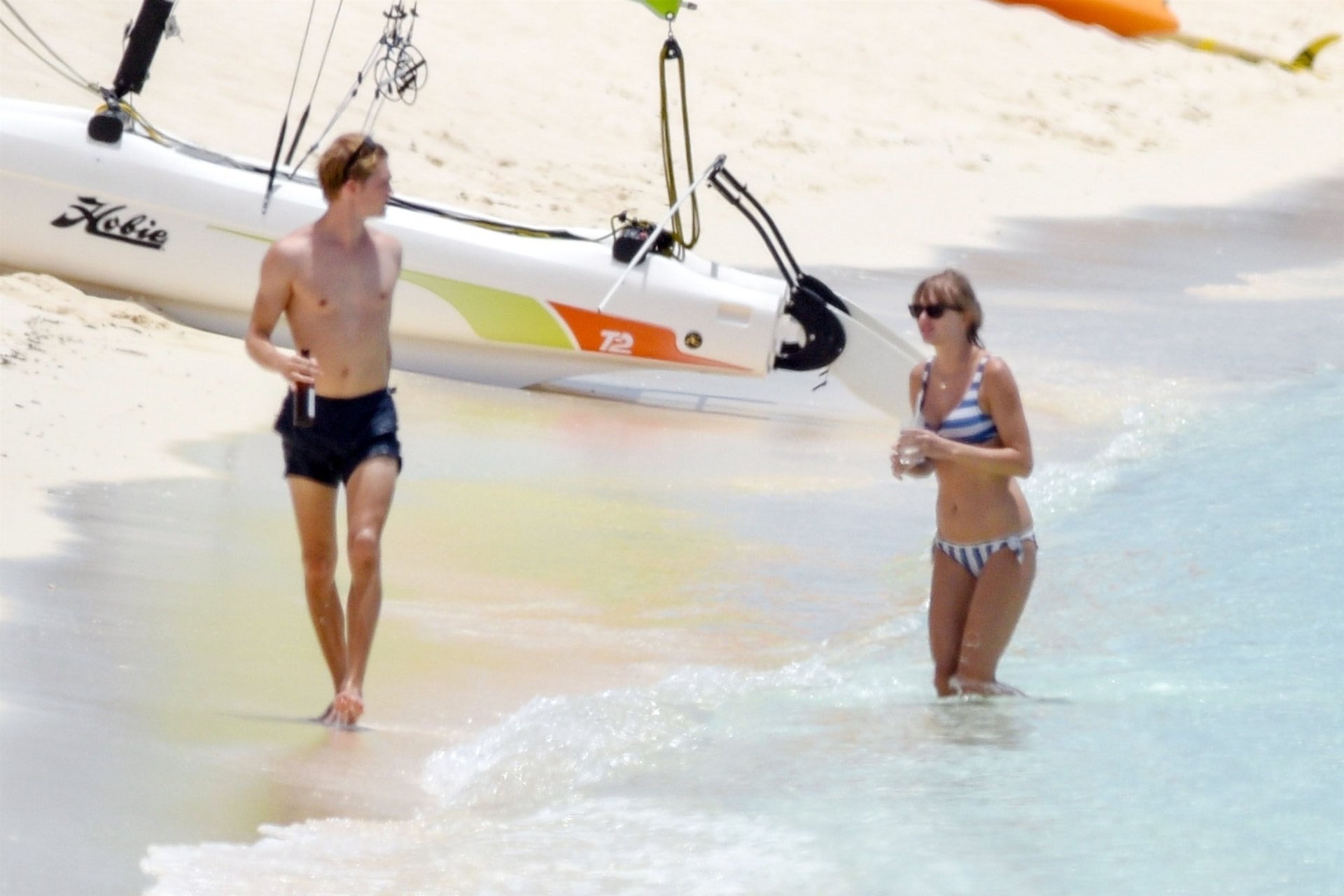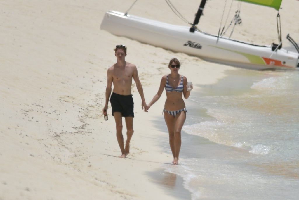 Taylor Swift e seu namorado Joe Alwyn continuam sua escapada romântica em um resort privado de luxo em Turks e Caicos, 05/07/2018. O casal aproveitou algumas bebidas na praia enquanto caminhavam de mãos dadas após um rápido mergulho no oceano. Taylor exibiu seu corpo tonificado em um biquíni listrado azul e branco.