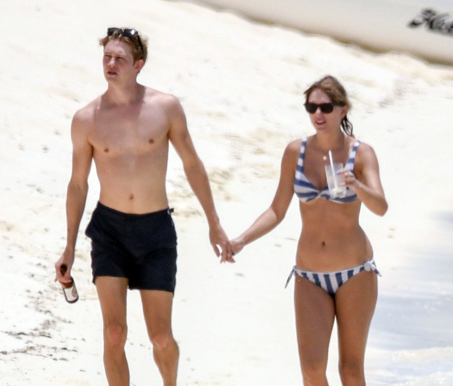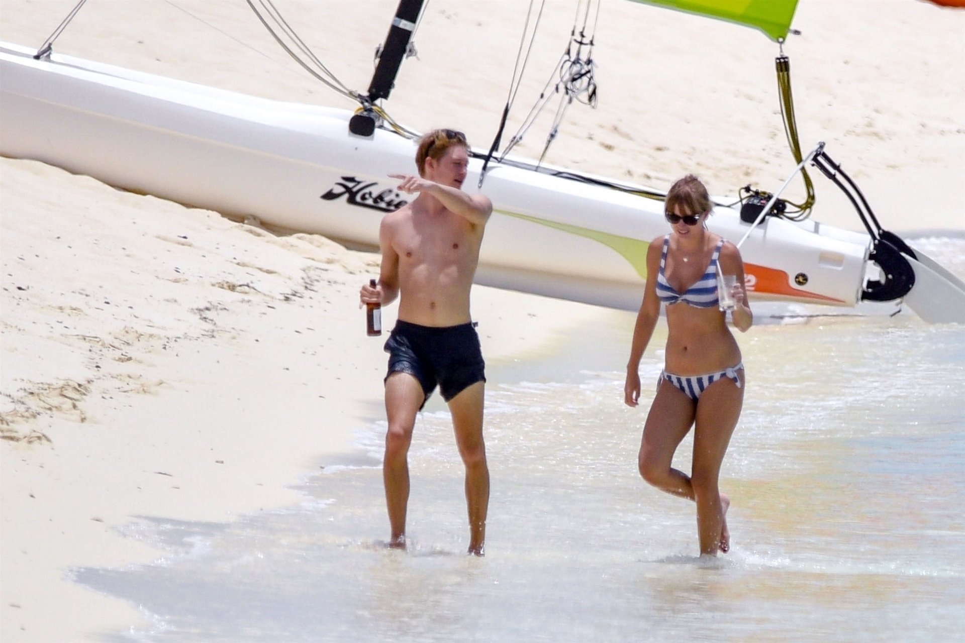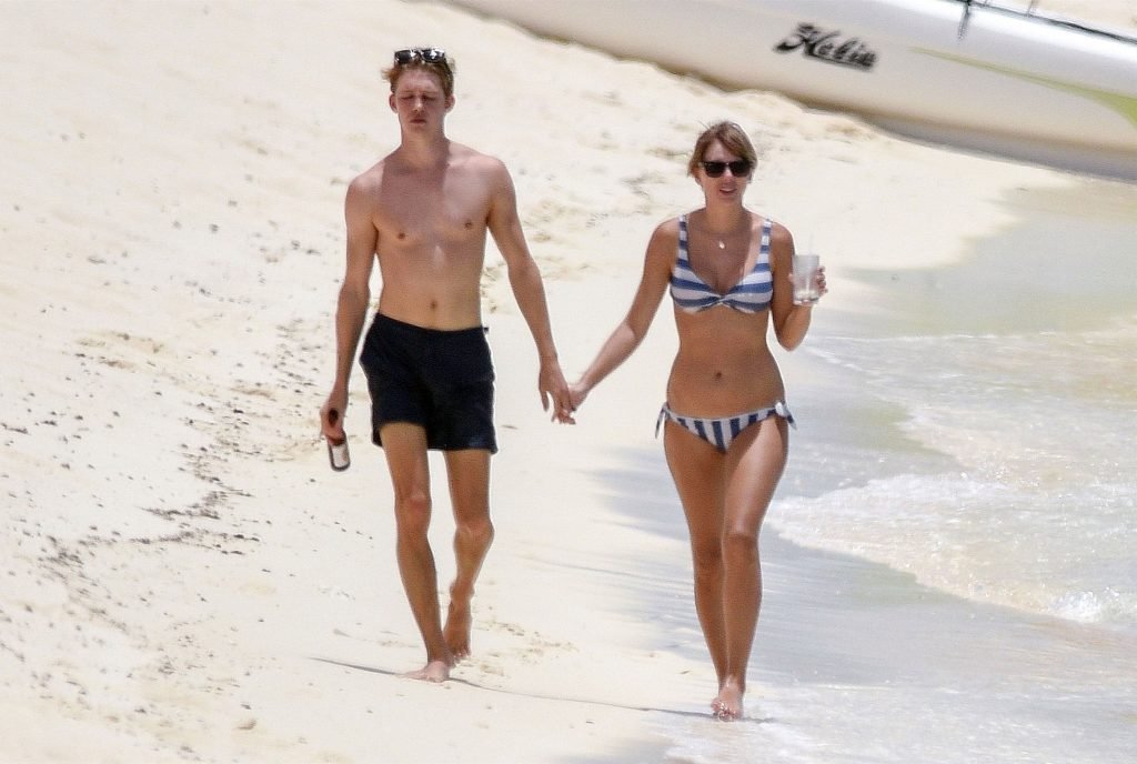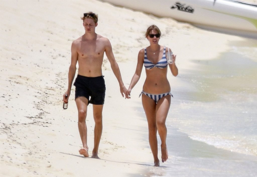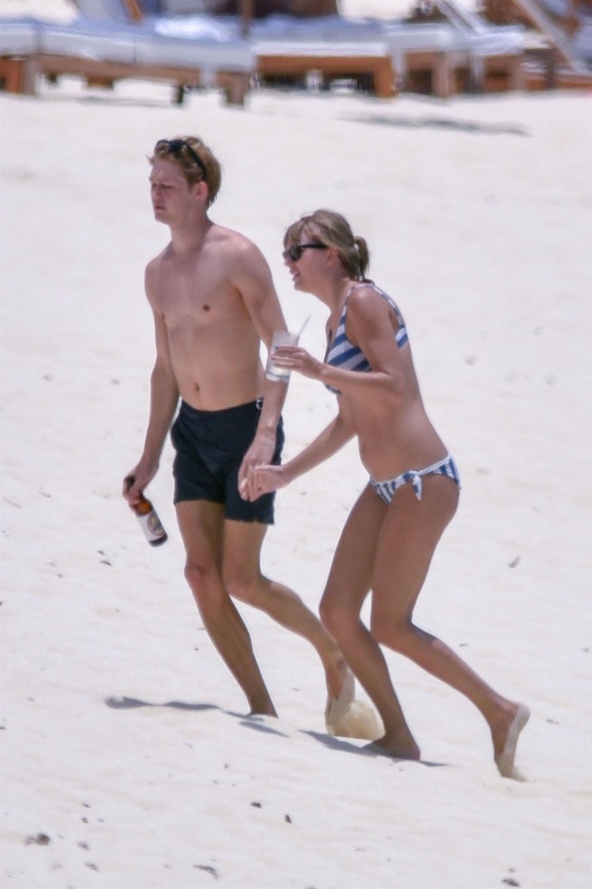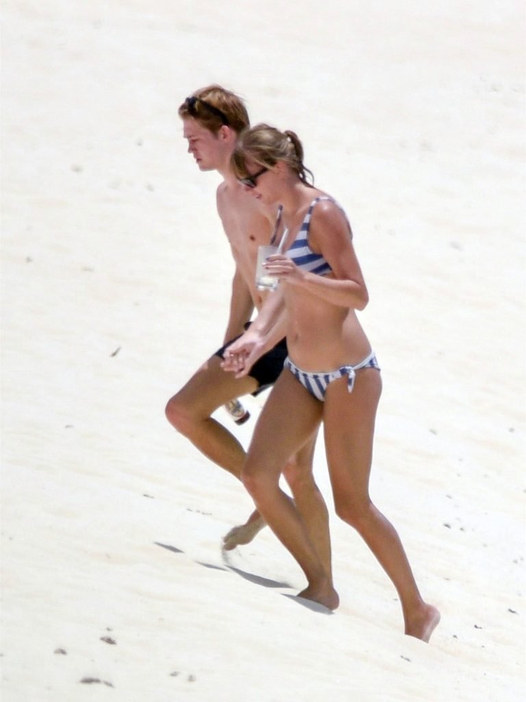 Taylor Swift e seu namorado Joe Alwyn continuam sua escapada romântica em um resort privado de luxo em Turks e Caicos, 05/07/2018. O casal aproveitou algumas bebidas na praia enquanto caminhavam de mãos dadas após um rápido mergulho no oceano. Taylor exibiu seu corpo tonificado em um biquíni listrado azul e branco.