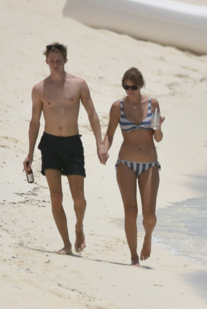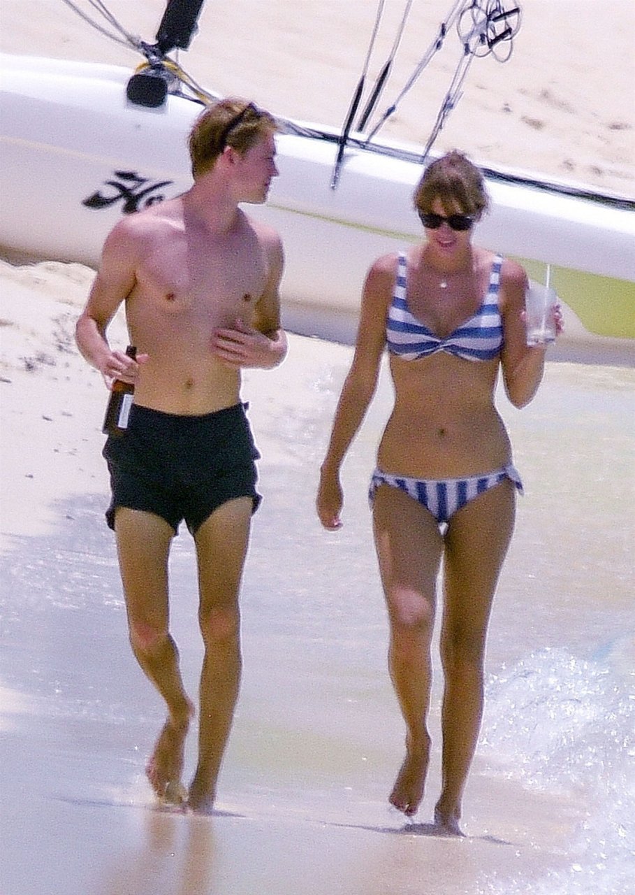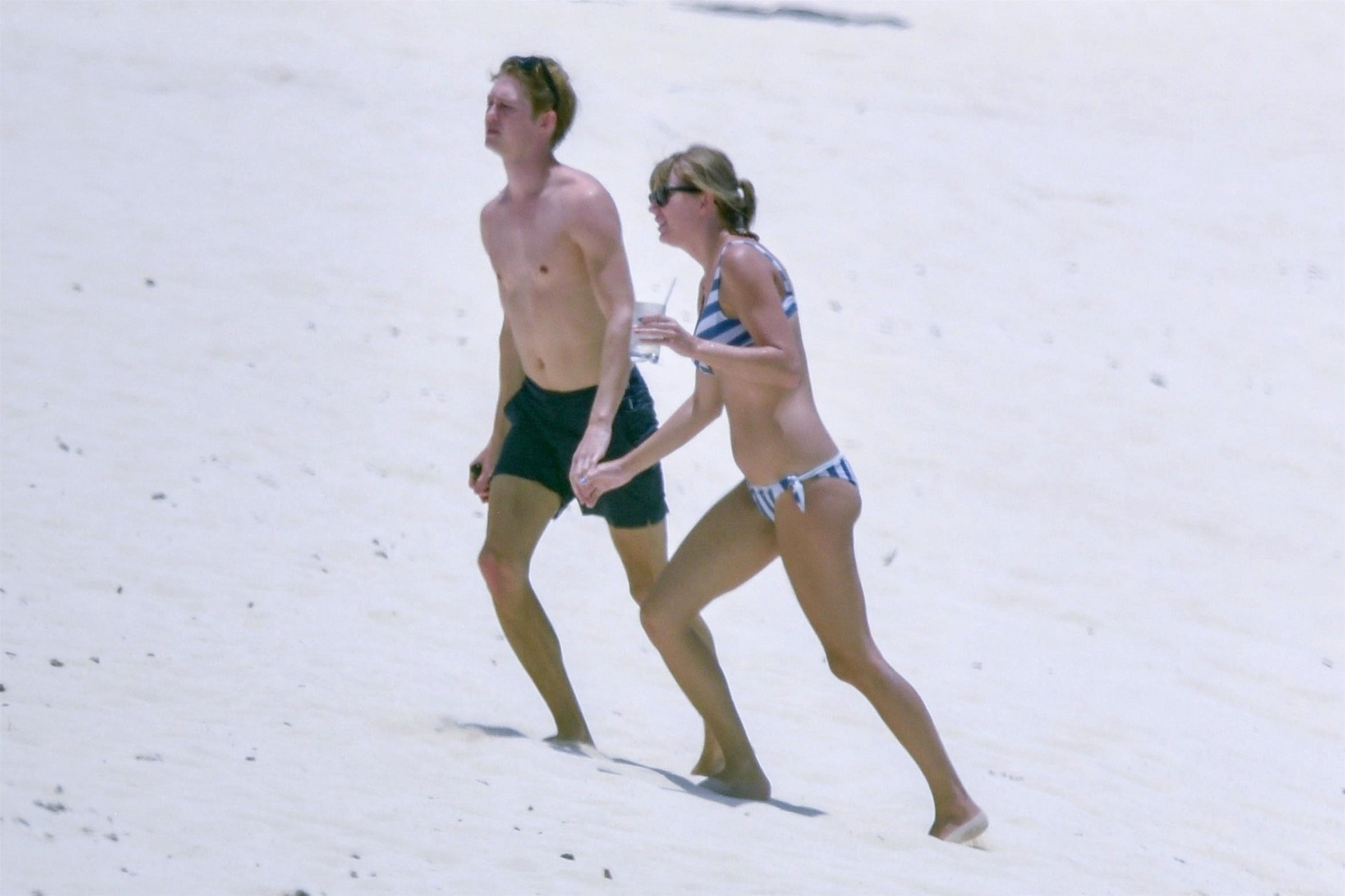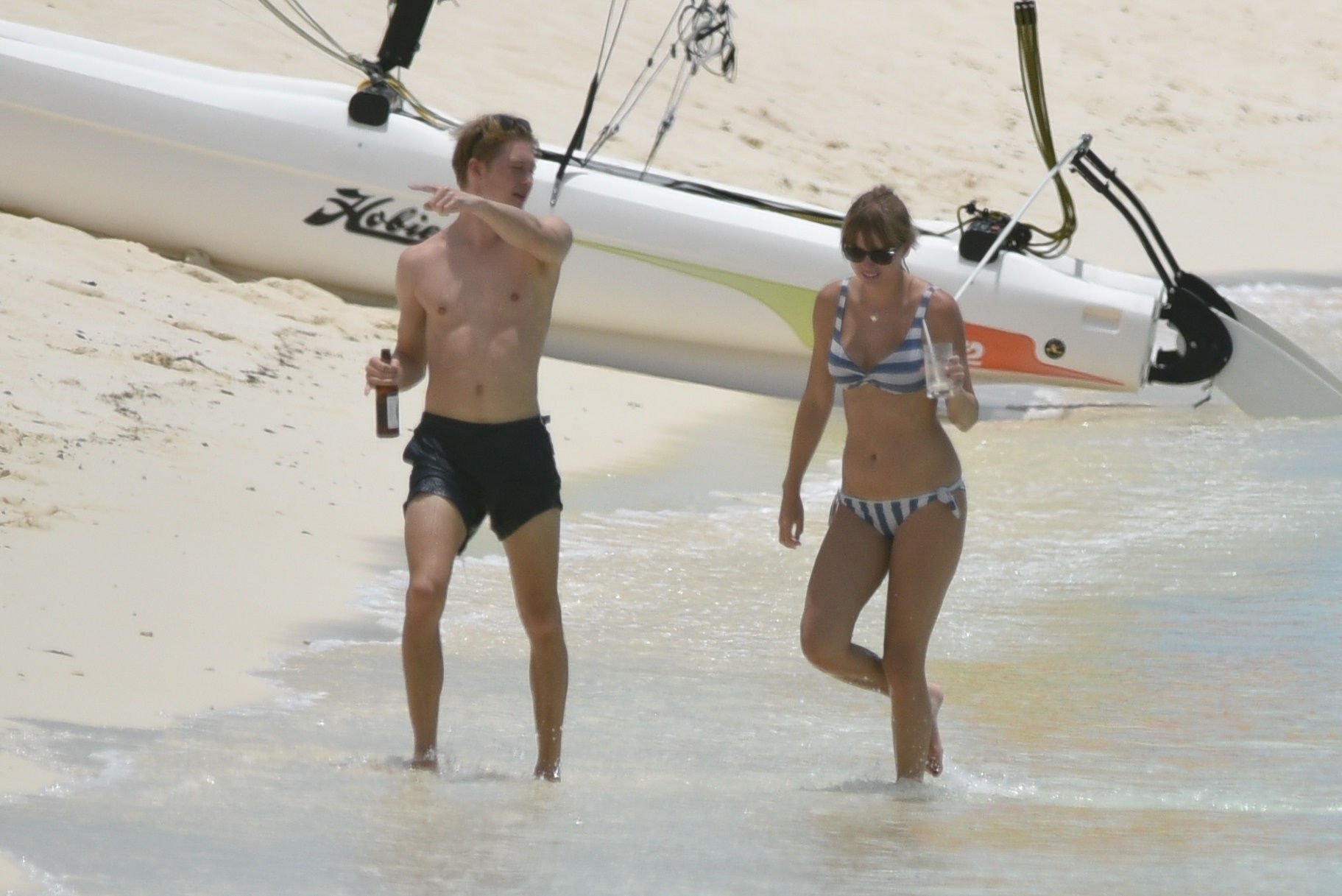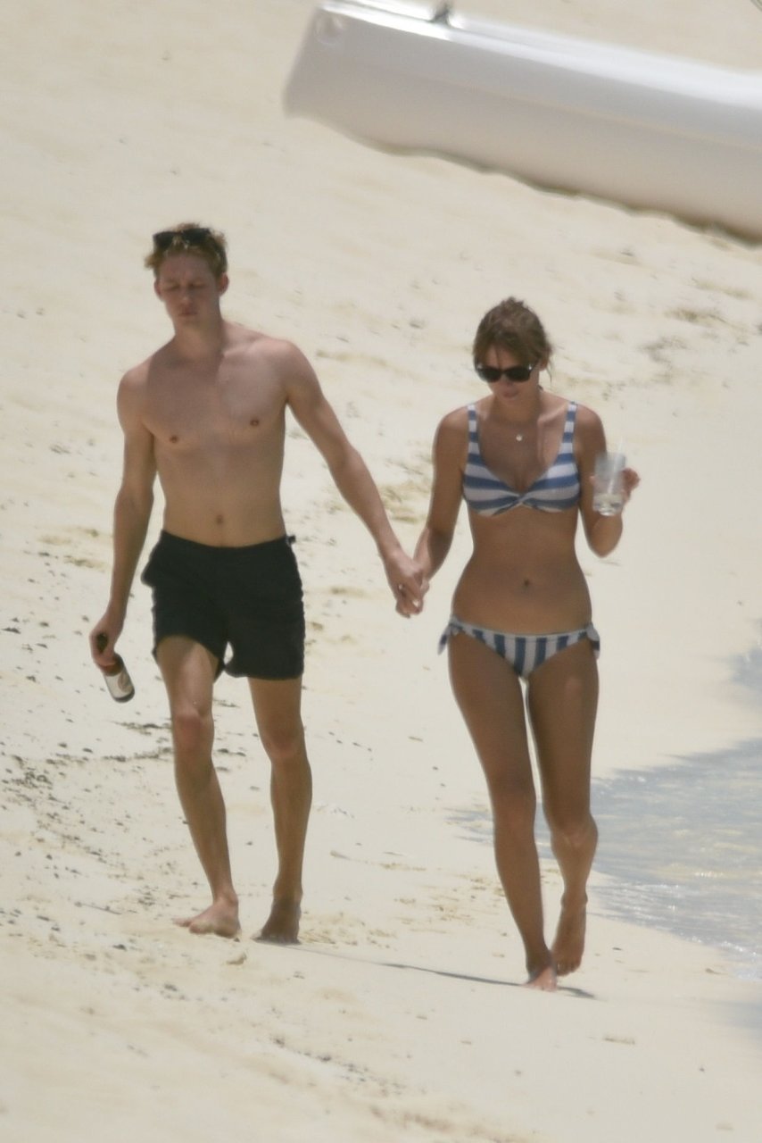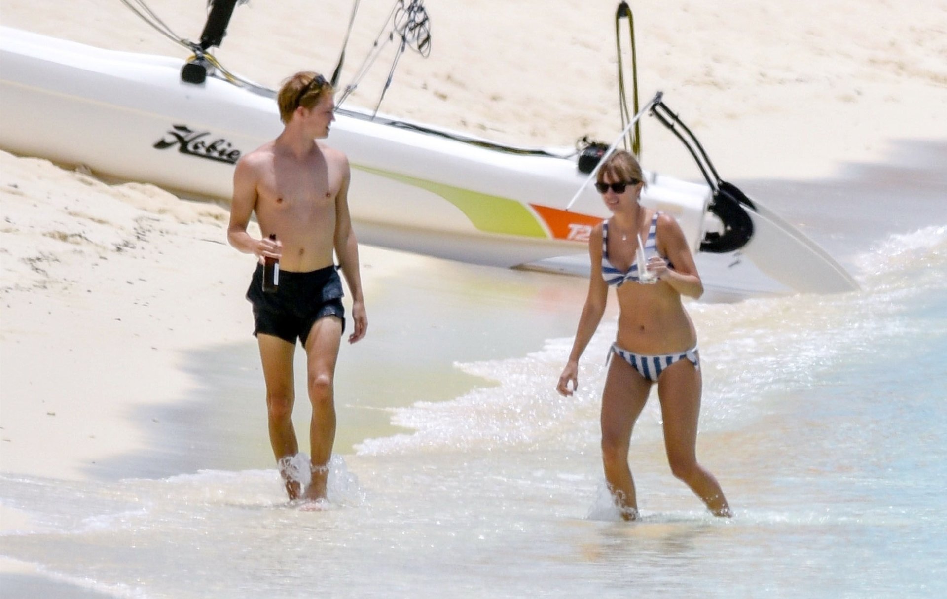 Taylor Swift e seu namorado Joe Alwyn continuam sua escapada romântica em um resort privado de luxo em Turks e Caicos, 05/07/2018. O casal aproveitou algumas bebidas na praia enquanto caminhavam de mãos dadas após um rápido mergulho no oceano. Taylor exibiu seu corpo tonificado em um biquíni listrado azul e branco.
