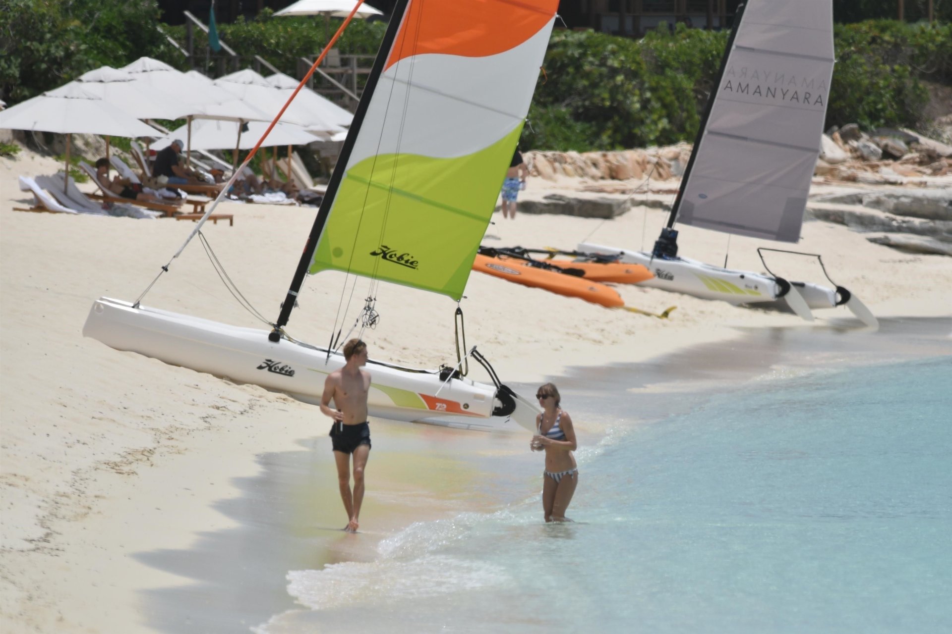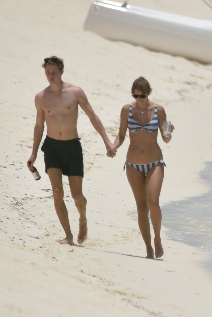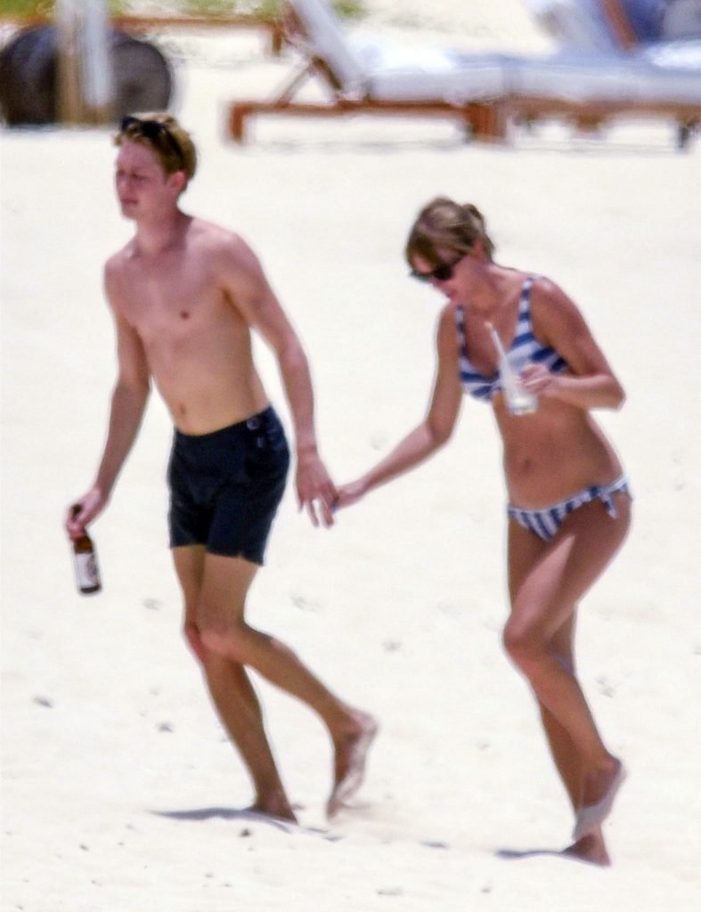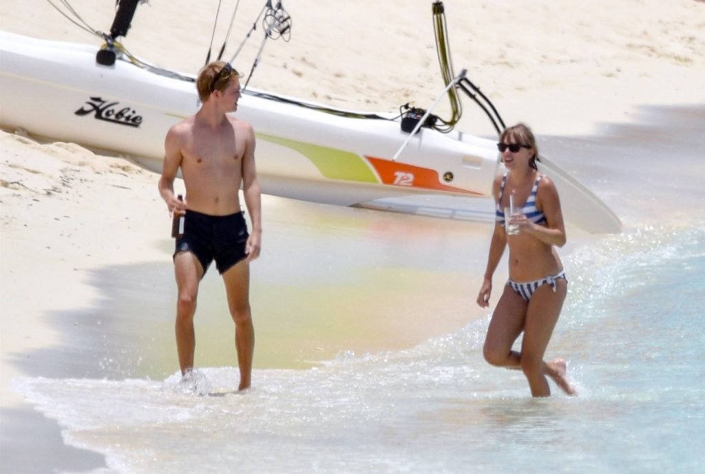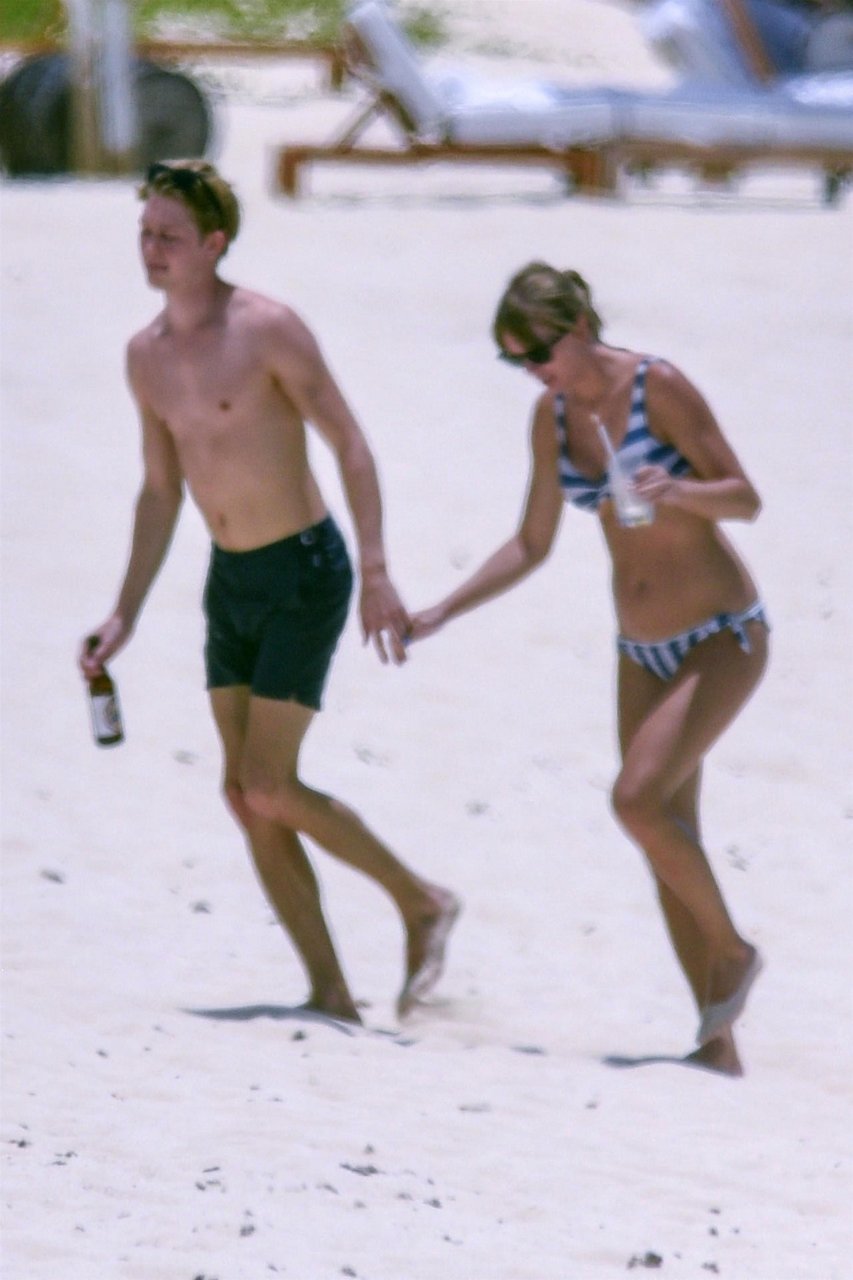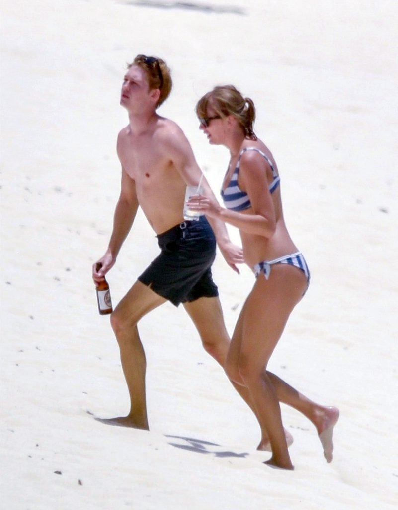 Taylor Swift e seu namorado Joe Alwyn continuam sua escapada romântica em um resort privado de luxo em Turks e Caicos, 05/07/2018. O casal aproveitou algumas bebidas na praia enquanto caminhavam de mãos dadas após um rápido mergulho no oceano. Taylor exibiu seu corpo tonificado em um biquíni listrado azul e branco.