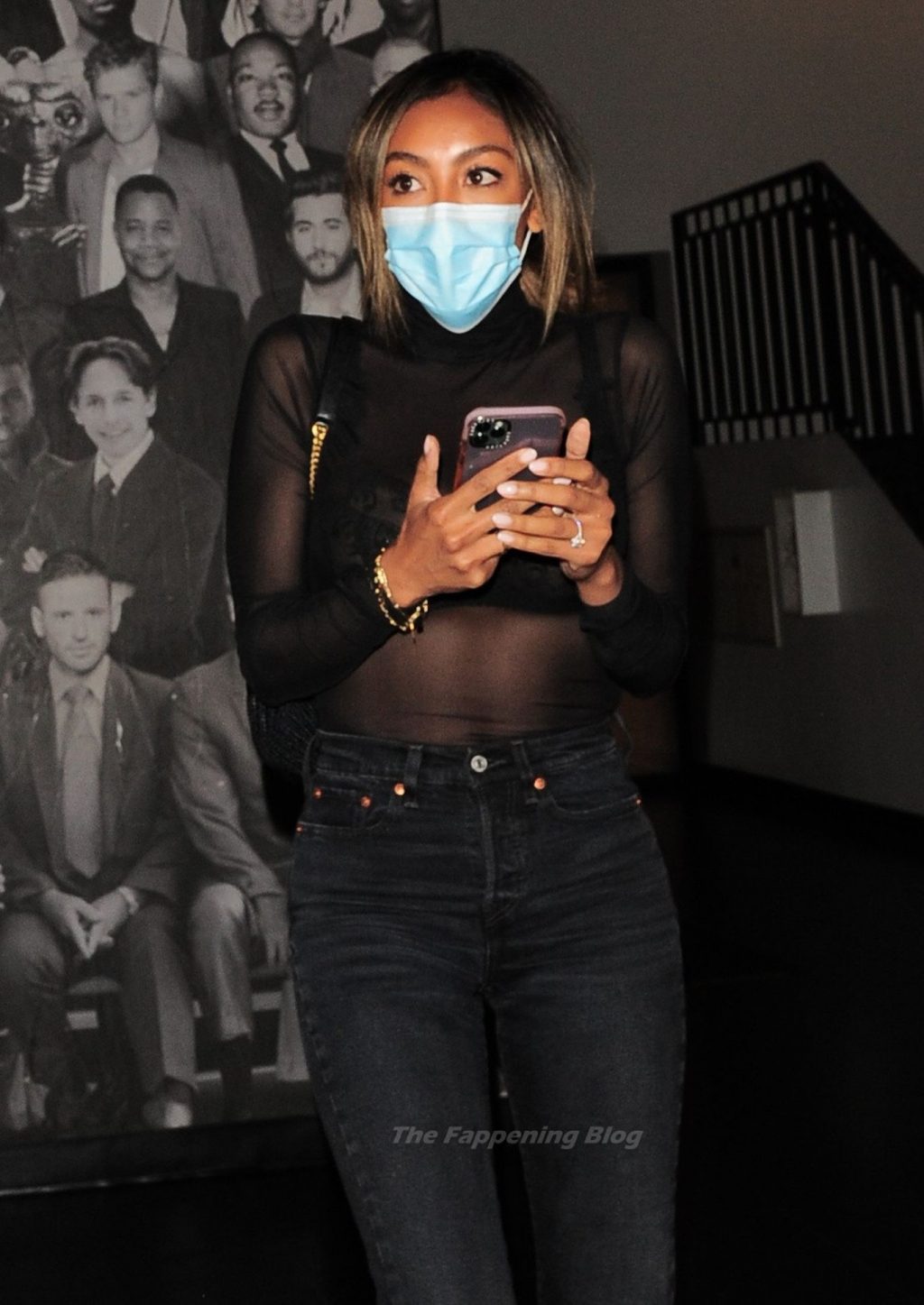 Bachelorette estrela Tayshia Adams é vista com um look fashion usando uma blusa transparente ao chegar no Catch Restaurant em West Hollywood, 26/04/2021.
