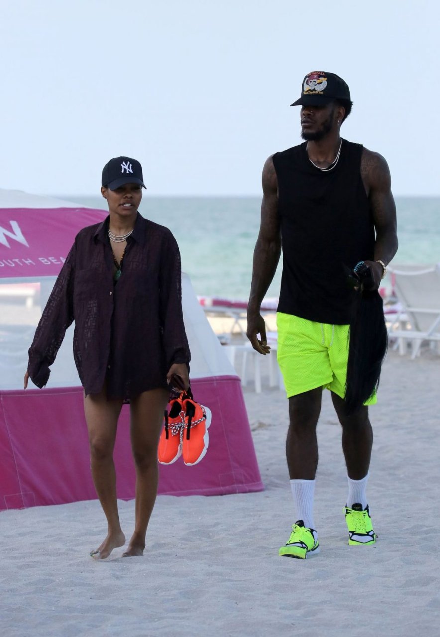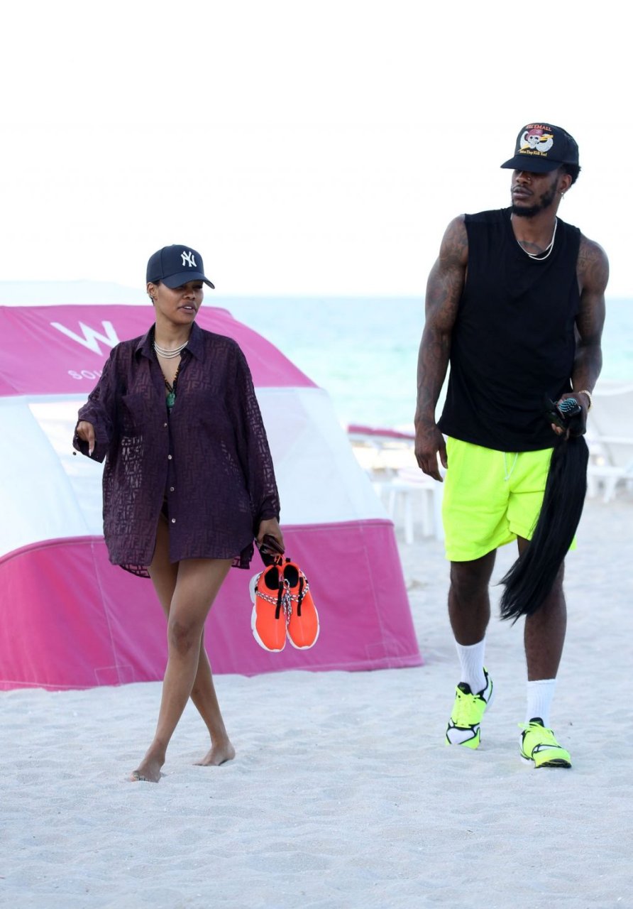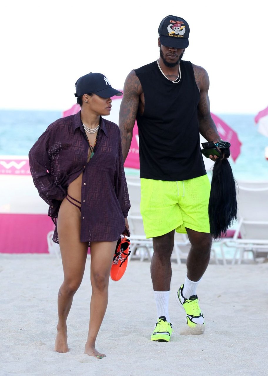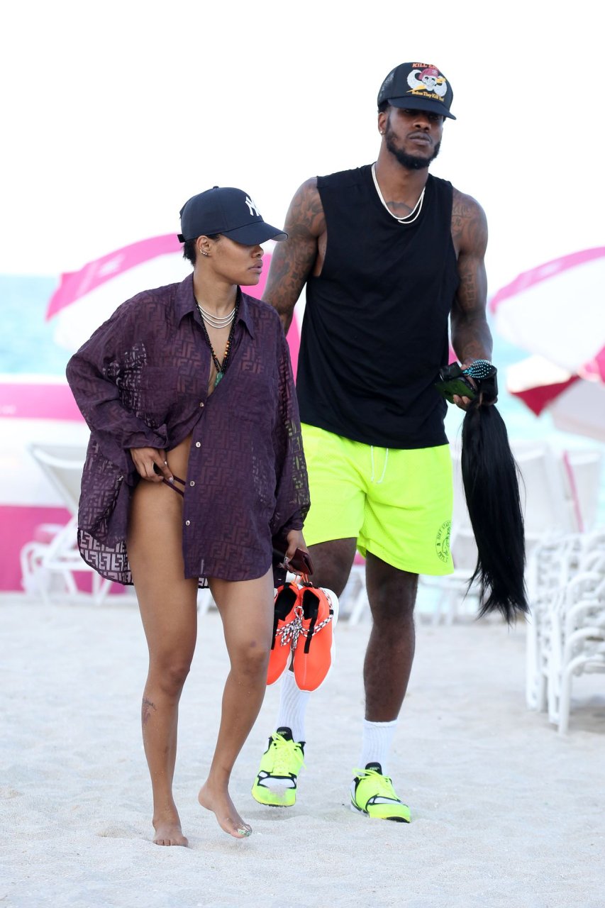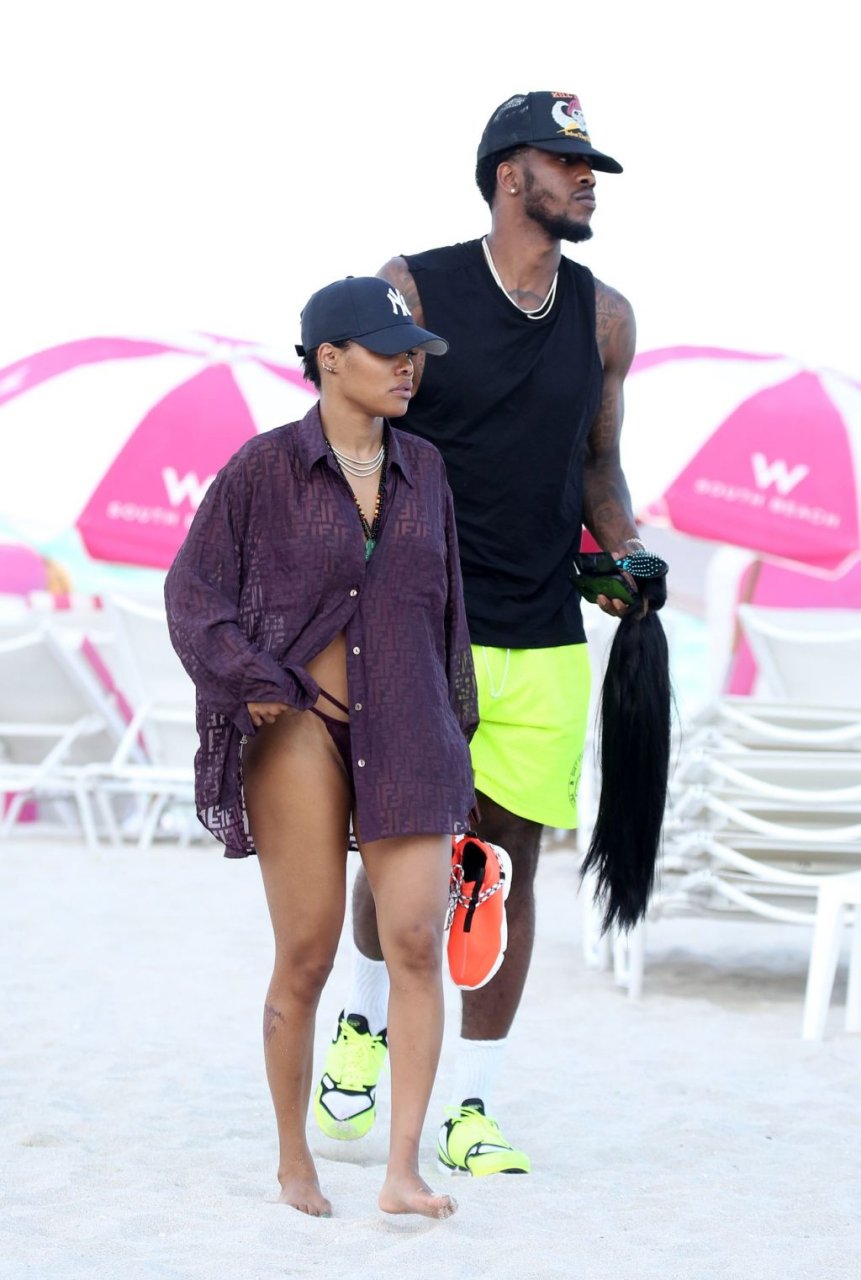Singer Teyana Taylor (28) passa um dia de praia em família com o marido, jogador da NBA Houston Rockets Iman Shumpert, e a filha em Miami Beach, Flórida, 02/07/2019.