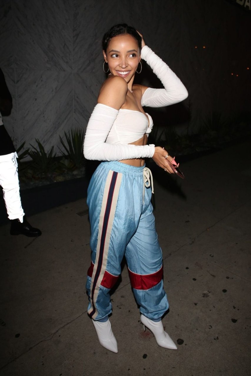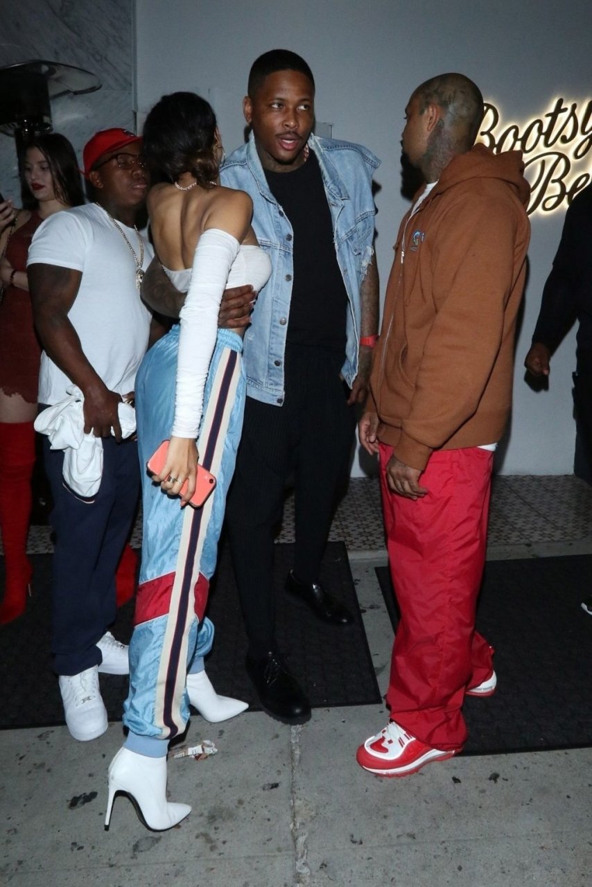 Keenon Daequan Ray Jackson (YG) e Tinashe aproveitam uma noite juntos durante uma festa em West Hollywood, 07/06/2019. YG e Tinashe parecem próximos enquanto compartilham um beijo antes de se despedirem.
