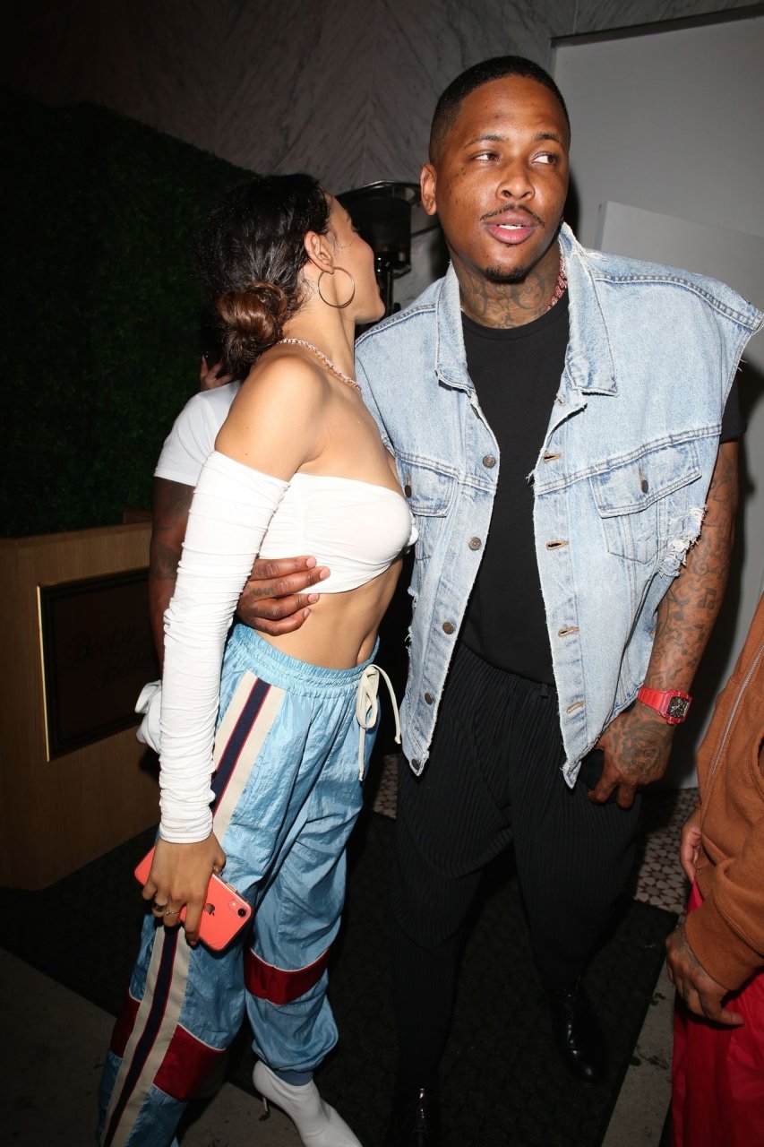 Keenon Daequan Ray Jackson (YG) e Tinashe aproveitam uma noite juntos durante uma festa em West Hollywood, 07/06/2019. YG e Tinashe parecem próximos enquanto compartilham um beijo antes de se despedirem.