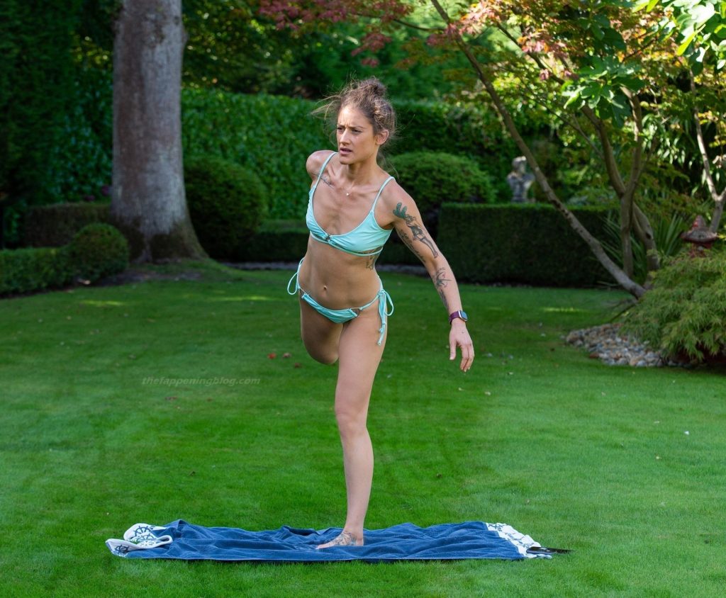 A personal trainer qualificada lançará seu site de fitness no início do próximo ano. Katie está usando um biquíni azul e é vista em várias posições de yoga.