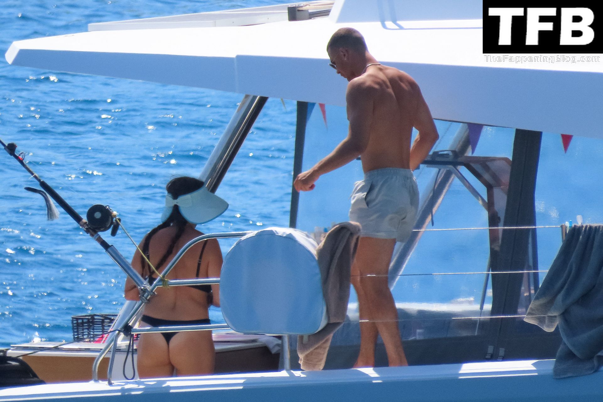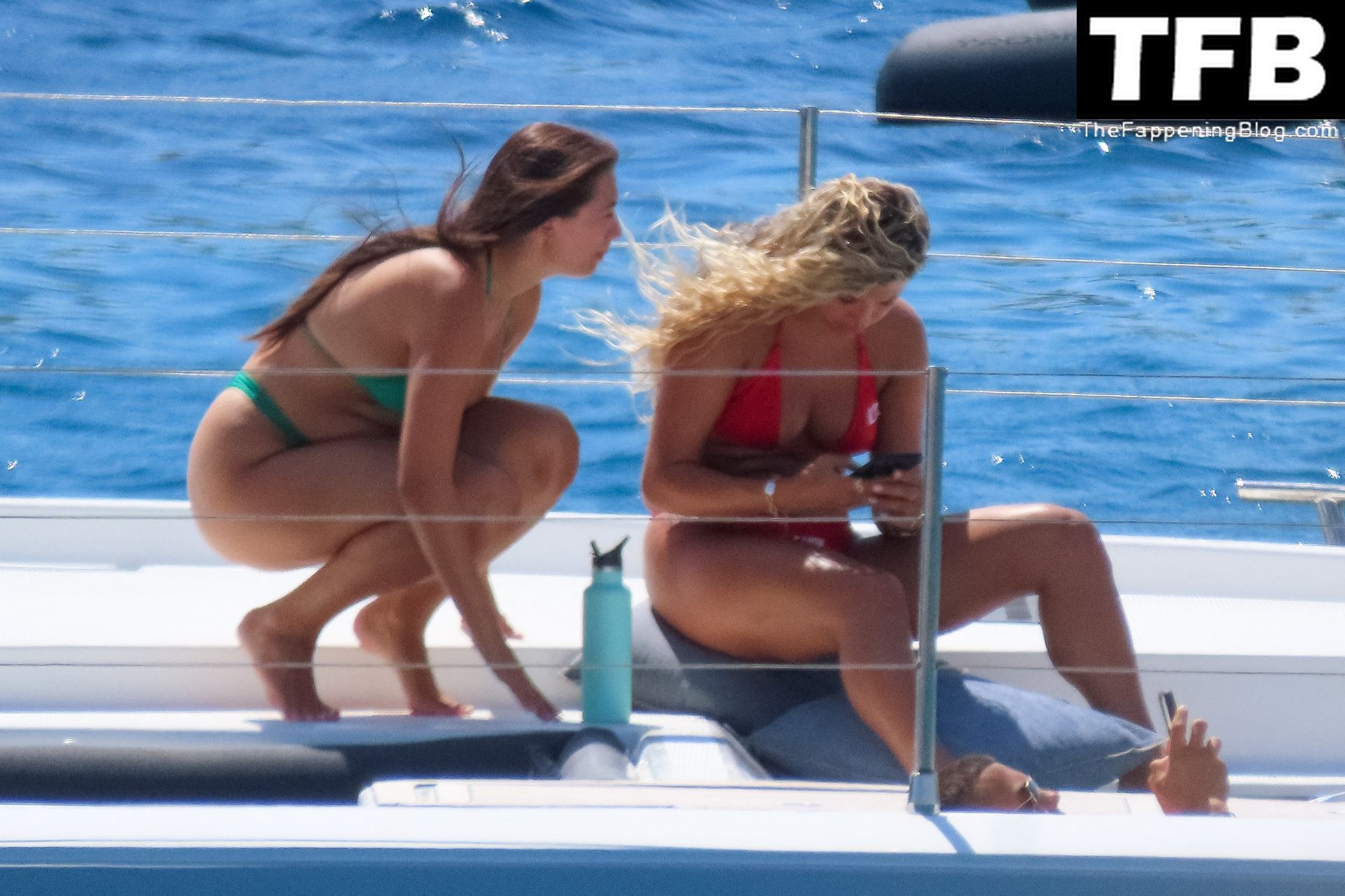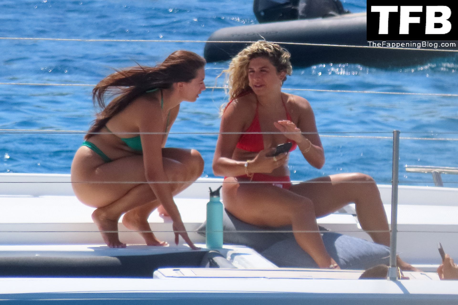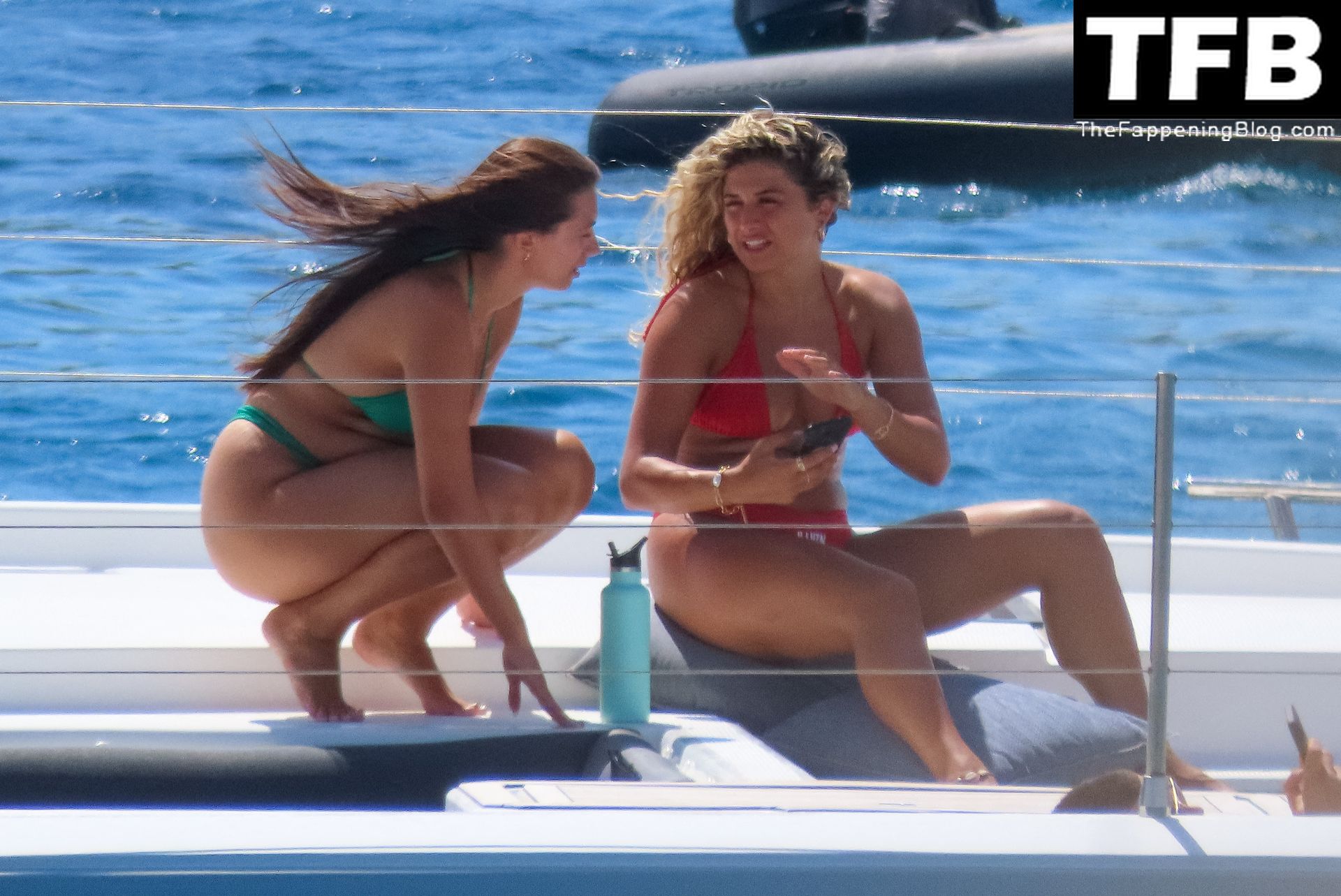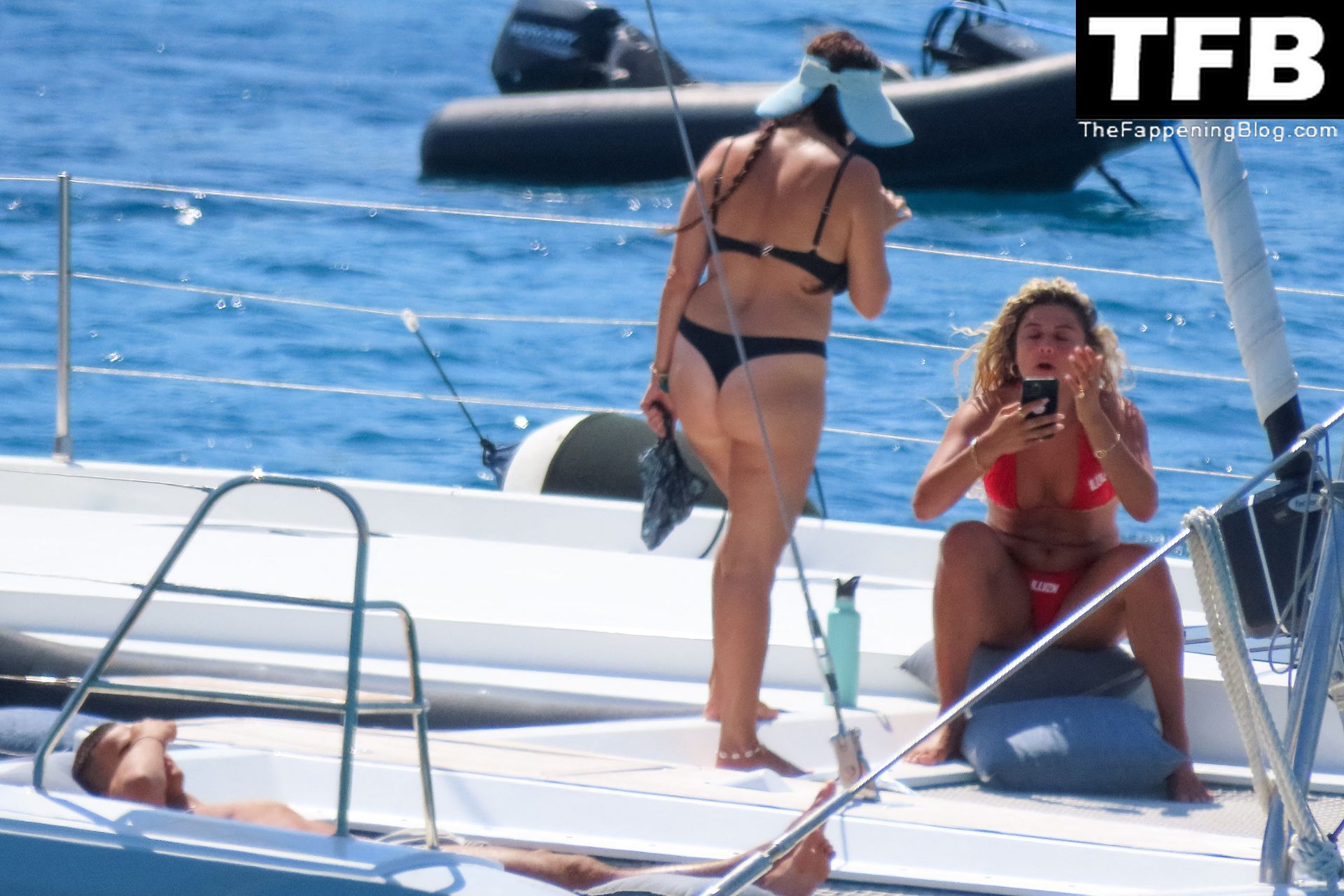 Um dia de catamarã em Mykonos! Tonia Buxton é vista de biquíni preto no catamarã com Antigoni Buxton, 21/08/2022.