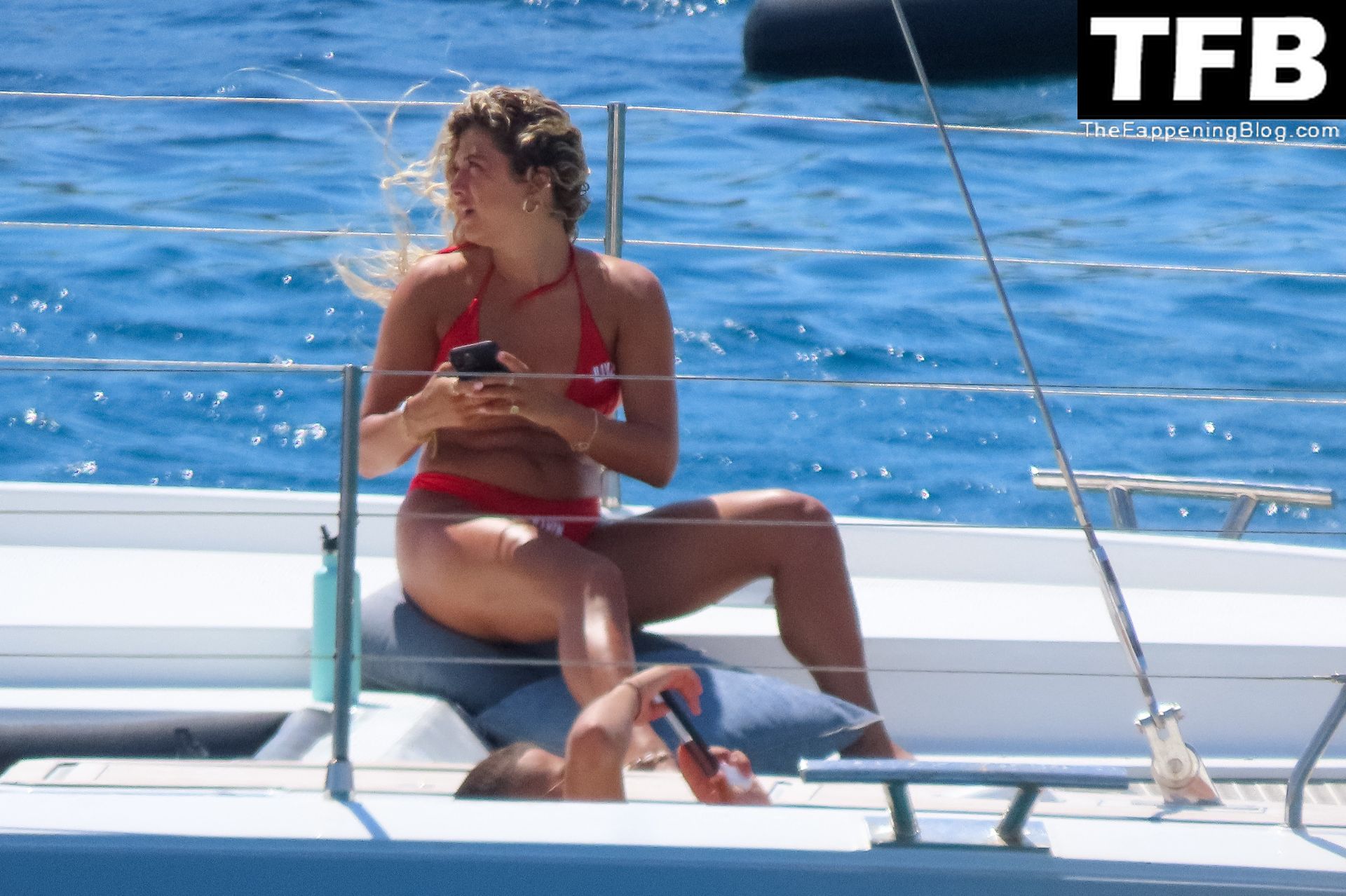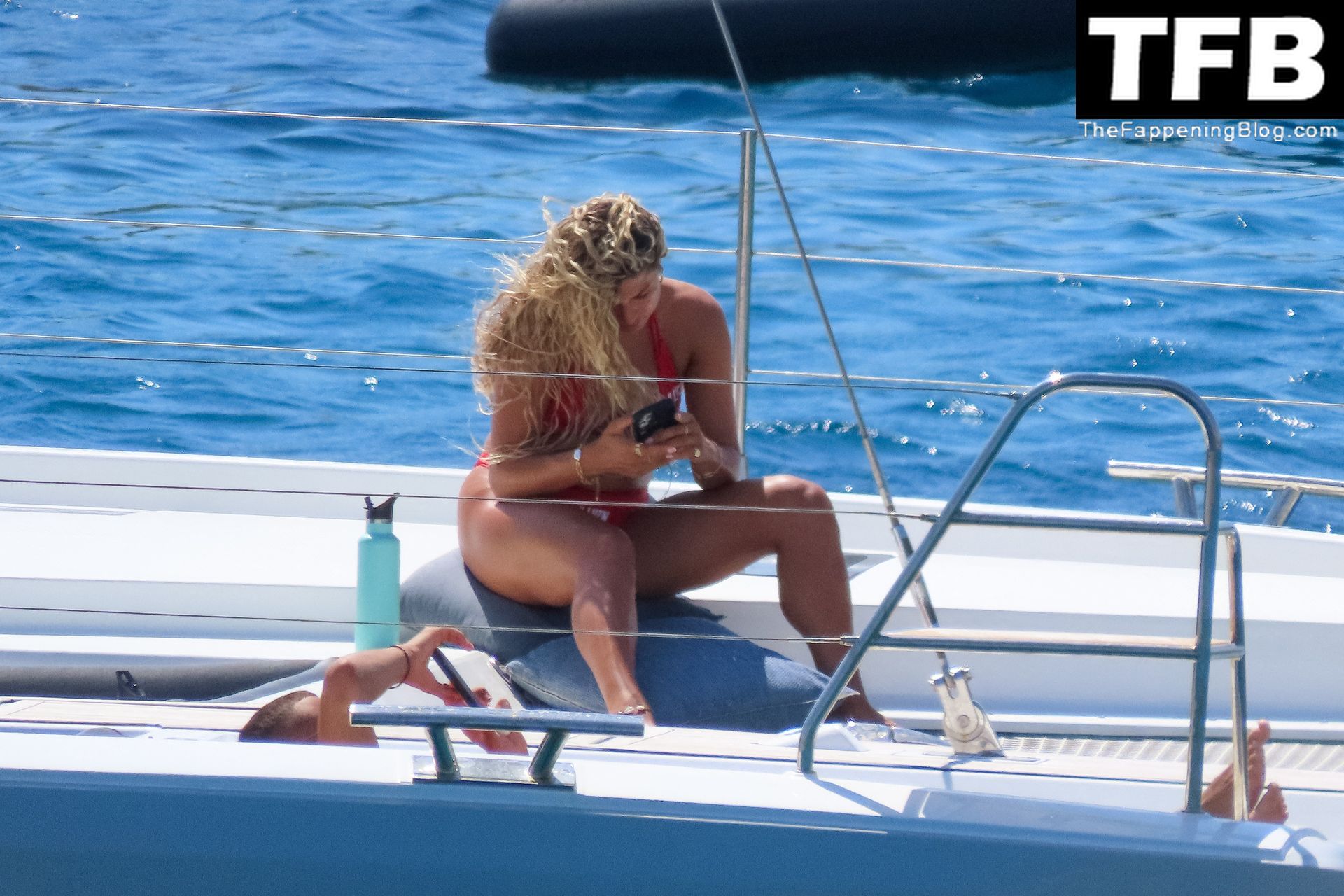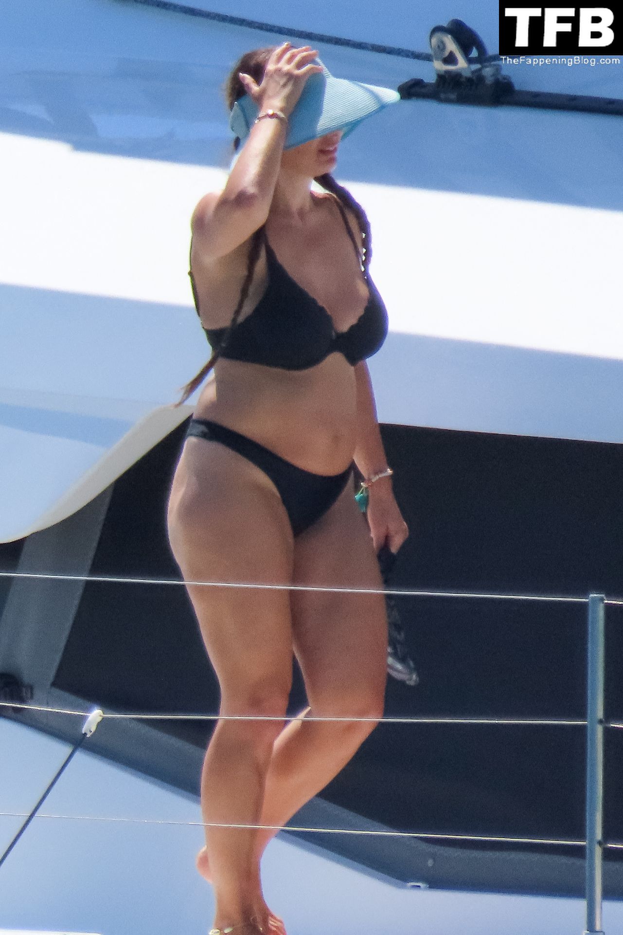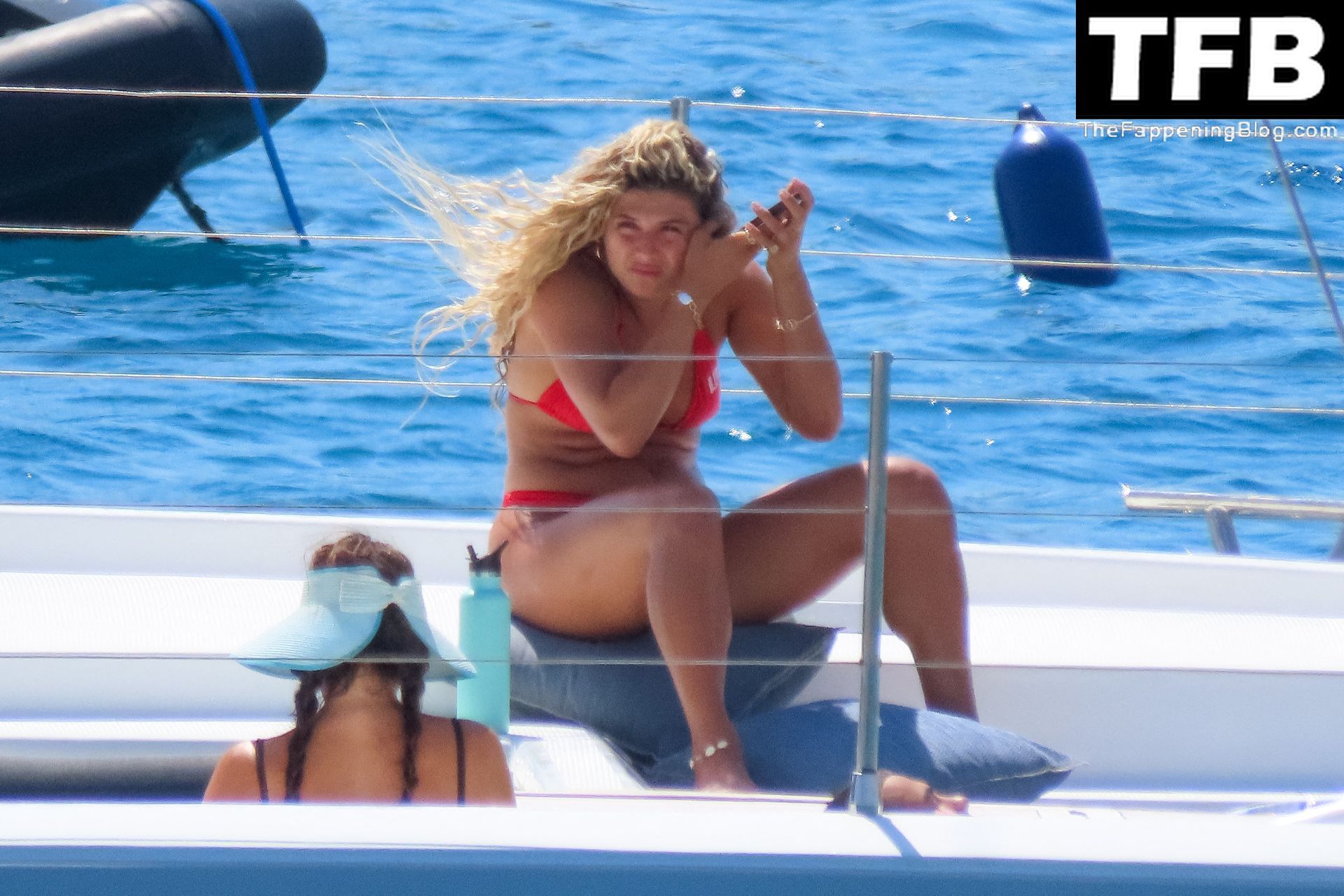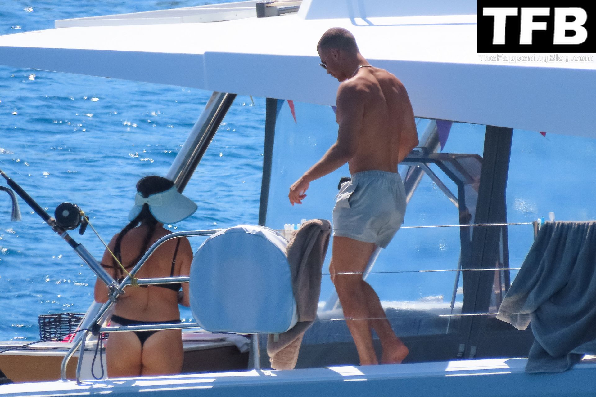 Um dia de catamarã em Mykonos! Tonia Buxton é vista de biquíni preto no catamarã com Antigoni Buxton, 21/08/2022.