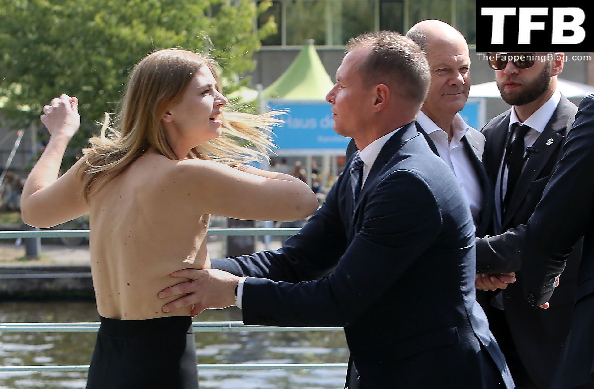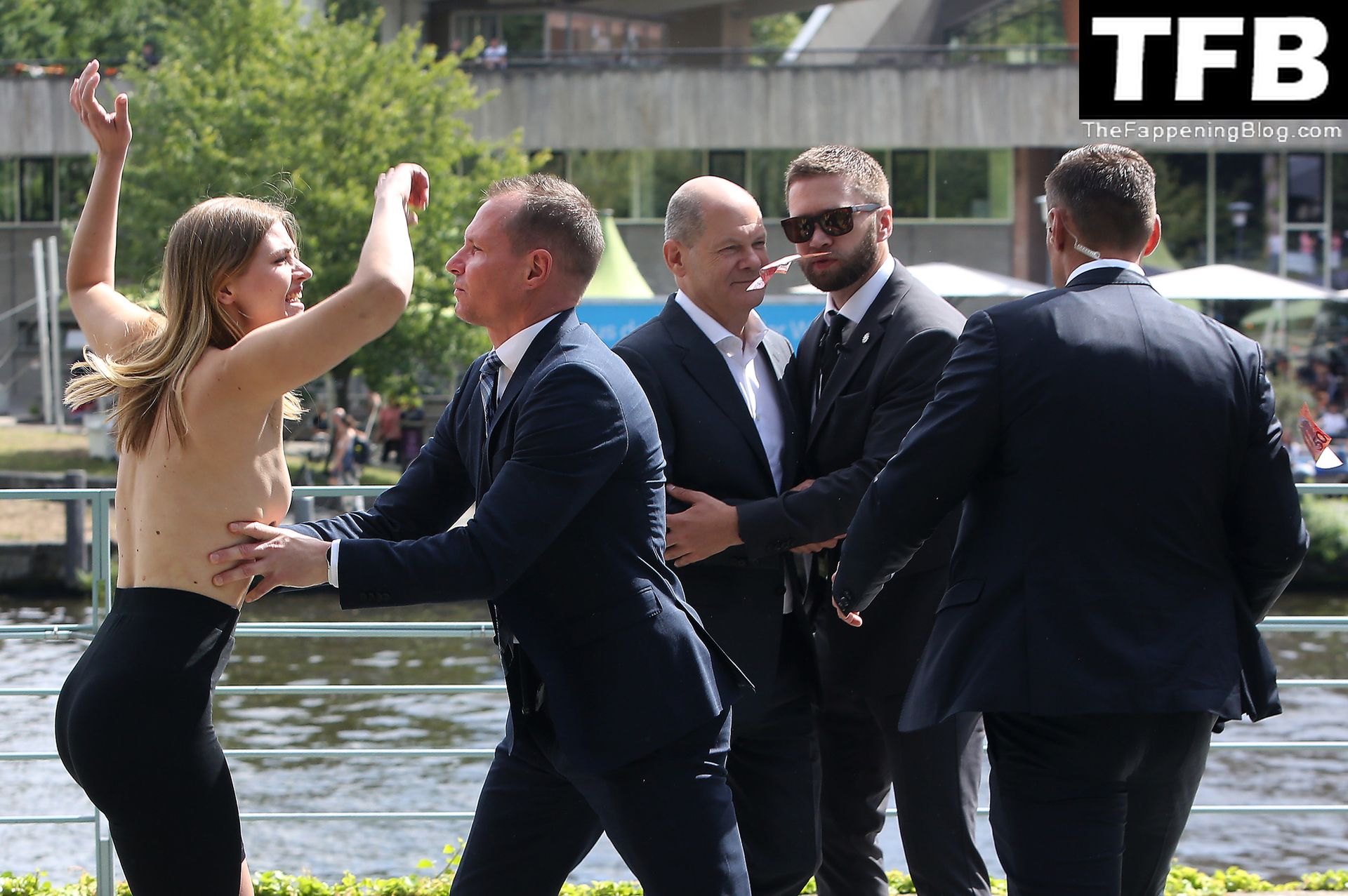 Manifestantes tiram as camisas para protestar de topless com o slogan “EMBARGO DE GÁS AGORA” pintado na pele, ao lado do Chanceler Alemão Olaf Scholz durante o evento do Dia Aberto do Governo Federal na Chancelaria em Berlim, 21/08/2022.
