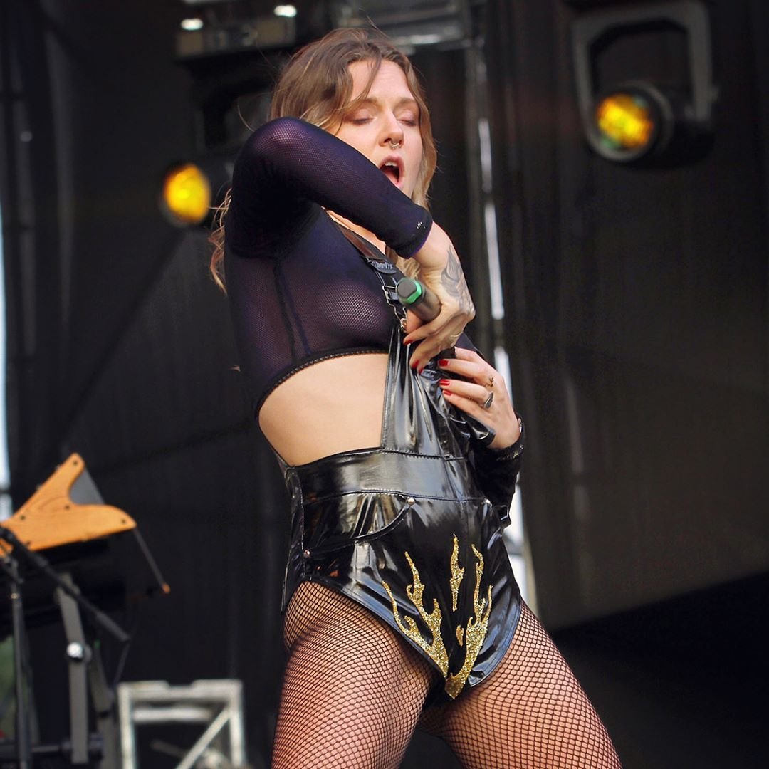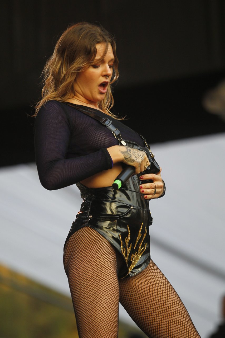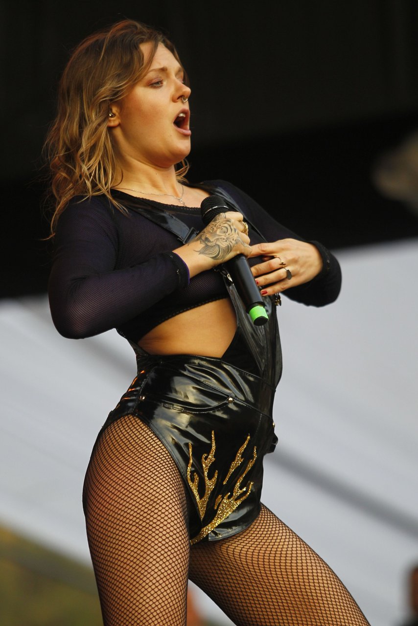 Tove Lo sem sutiã se apresentou no Lollapalooza Chile (abril de 2017). Tove Lo é uma cantora e compositora sueca. Idade – 29 anos (nascida em 29 de outubro de 1987).