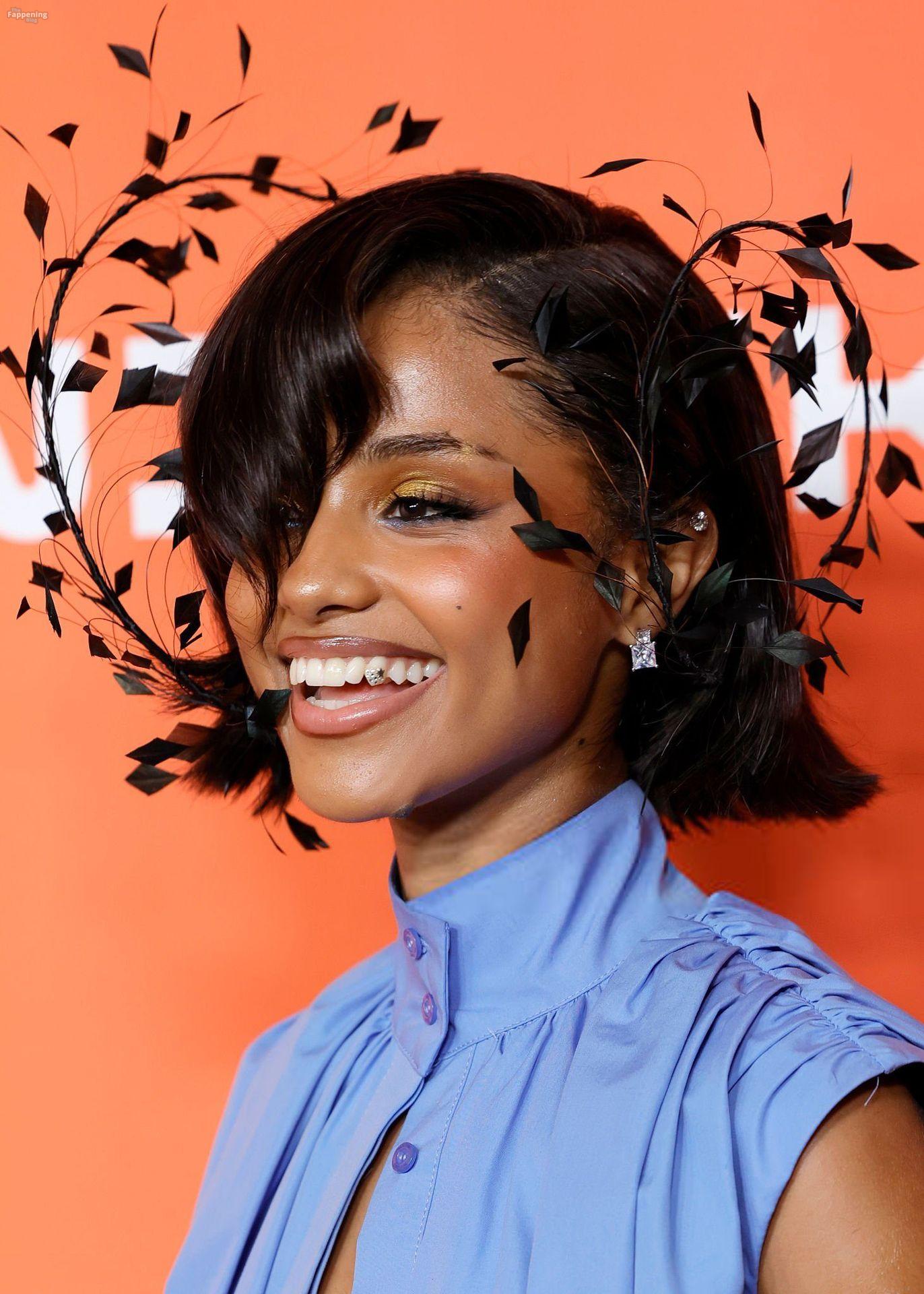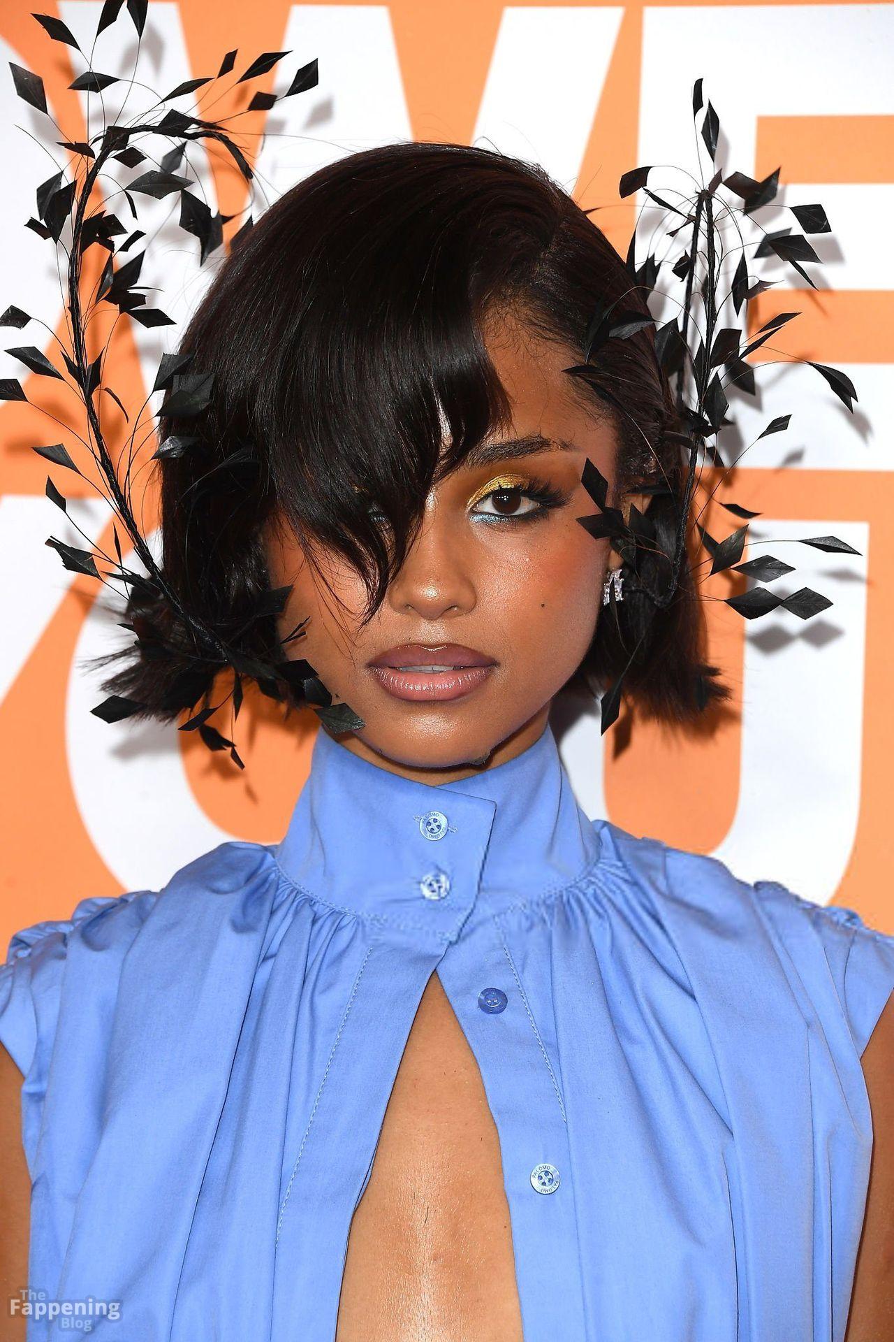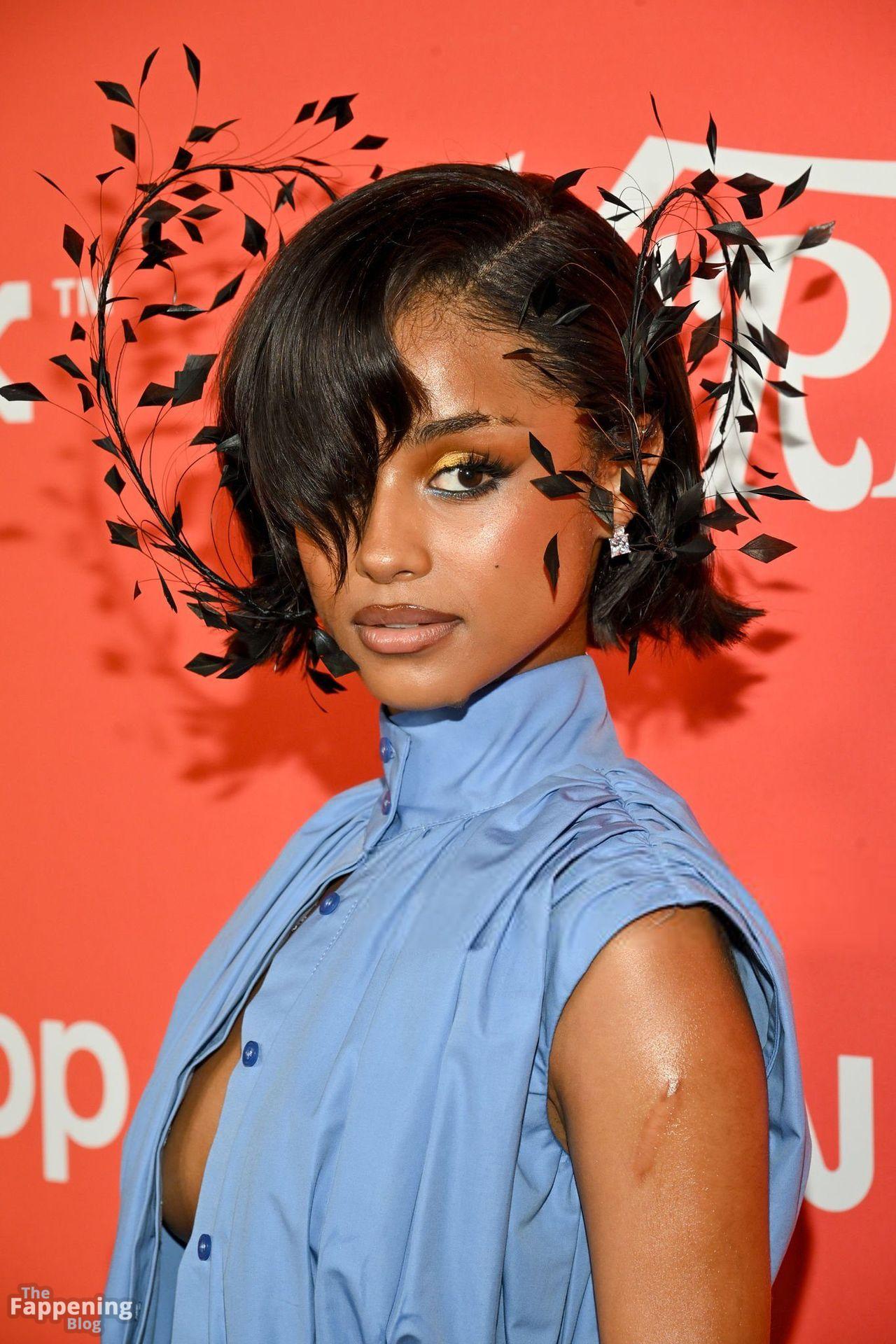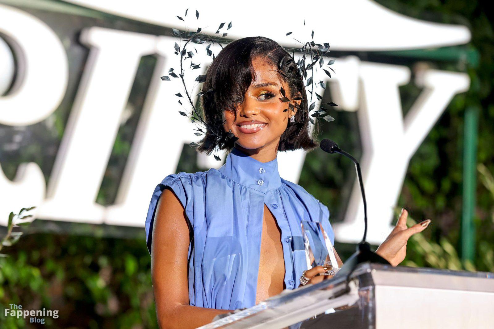 Tyla foi fotografada no evento Variety Power Of Young Hollywood 2025 no Four Seasons em Beverly Hills, usando um top azul sem sutiã com um flex de seios, uma minissaia.