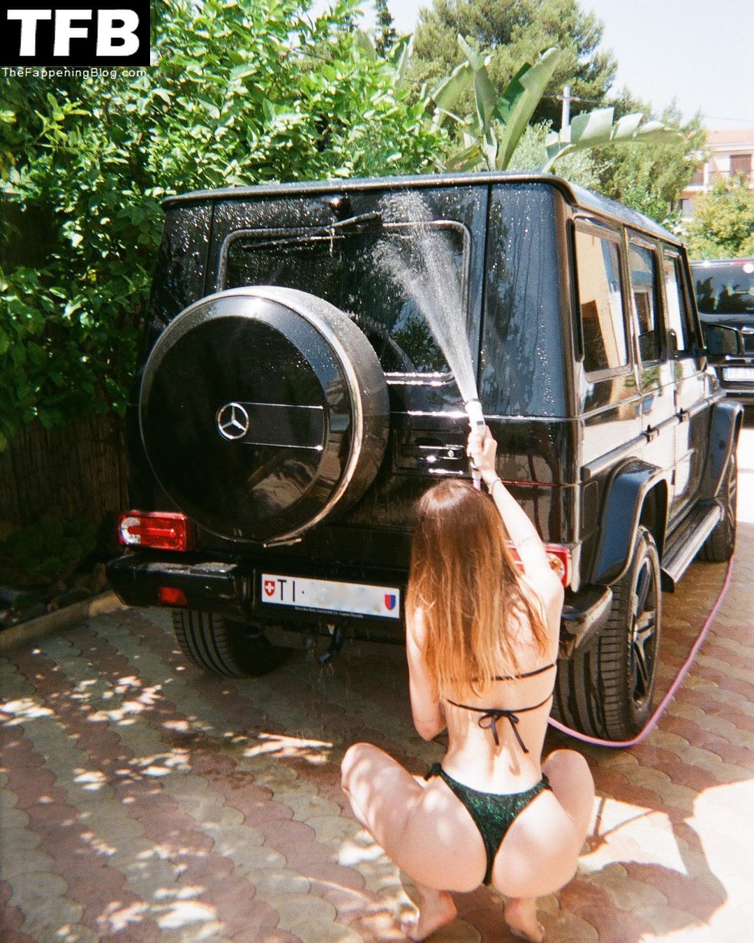 Modelo e estilista de moda praia Valentina Fradegrada lava seu carro posando com um biquíni minúsculo e sexy – Instagram, 24/10/2021.