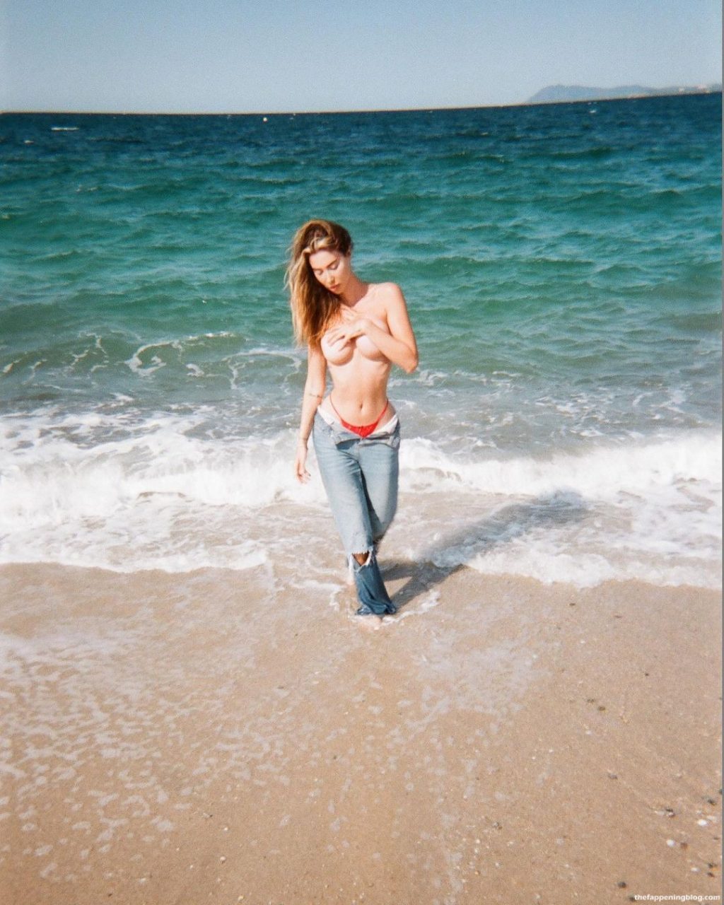 A modelo Valentina Fradegrada posa topless e de calcinha vermelha na praia, cobrindo seus seios falsos em um ensaio fotográfico no seu aniversário – Instagram, 09/02/2021.