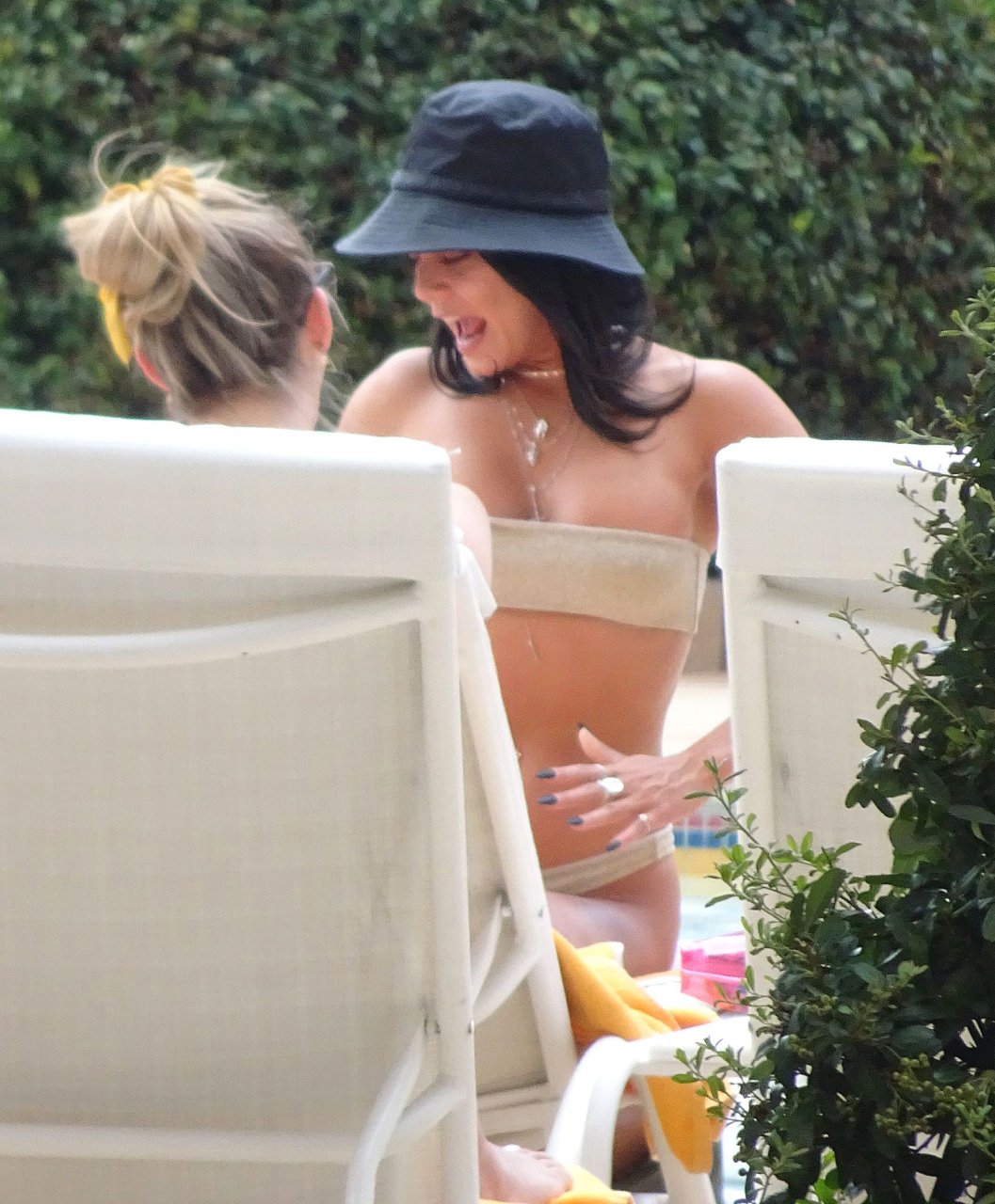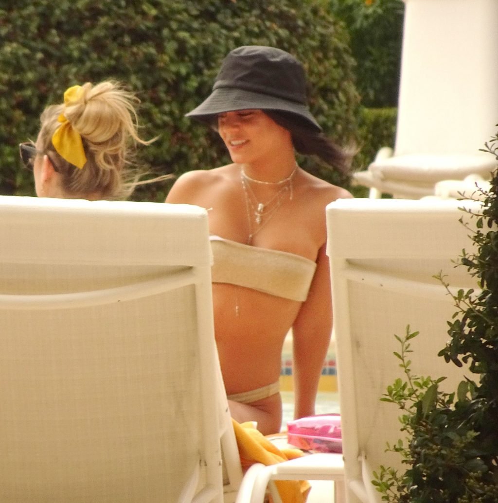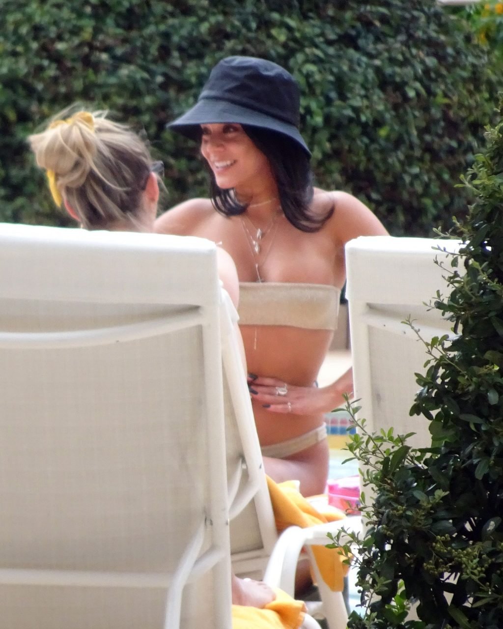 Vanessa Hudgens está toda sorrisos e sem maquiagem enquanto exibe seu corpo de biquíni sob o sol quente com suas amigas enquanto relaxam na piscina de luxo em Las Vegas, 17/09/2019.