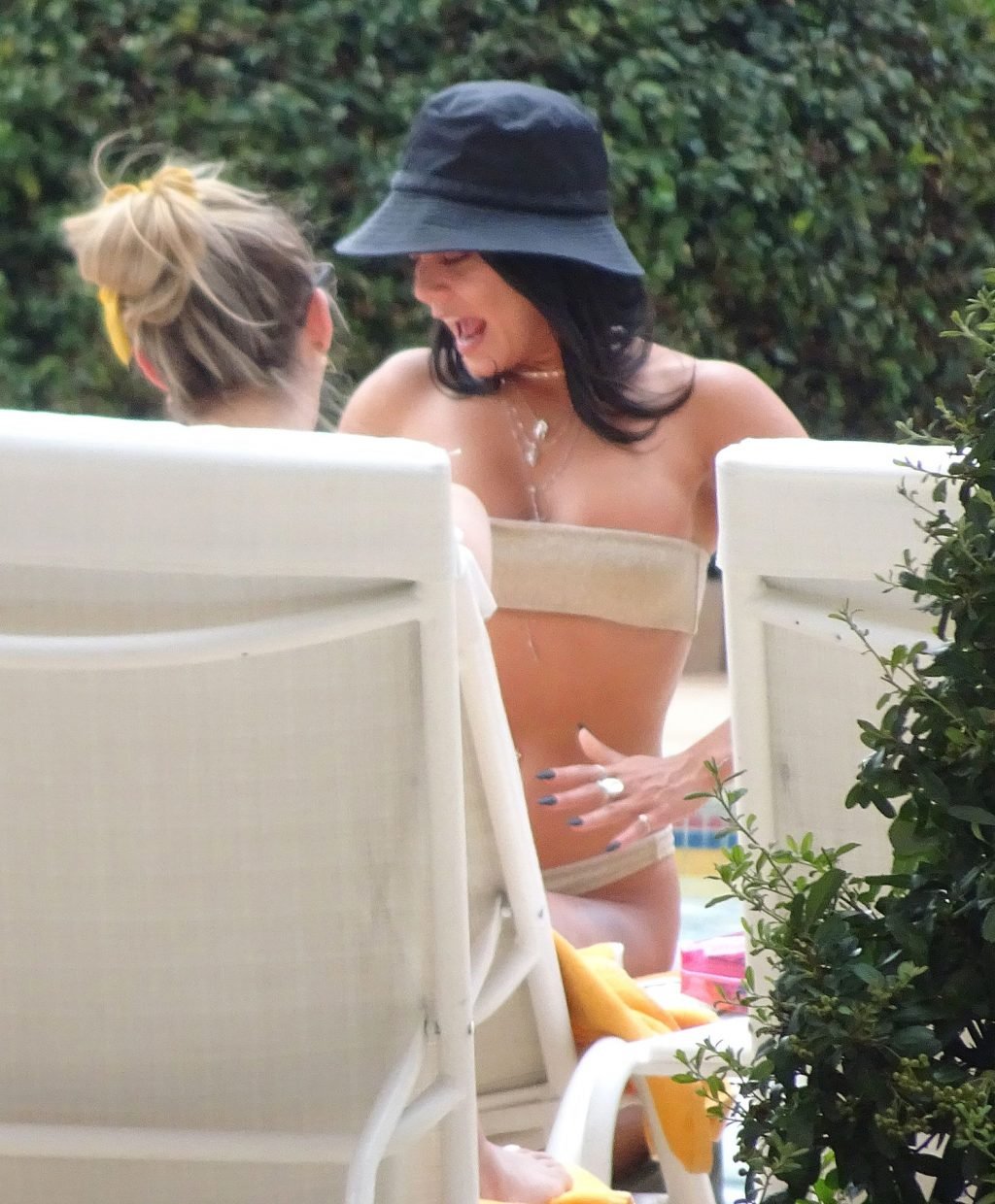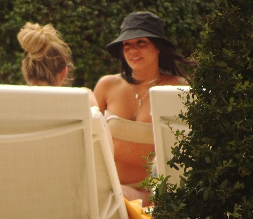 As garotas sentaram-se ao redor da movimentada área da piscina enquanto Vanessa afrouxava uma das alças do biquíni antes de voltar para o cassino mais tarde usando um chapéu preto floppy e saia na Cidade do Pecado.