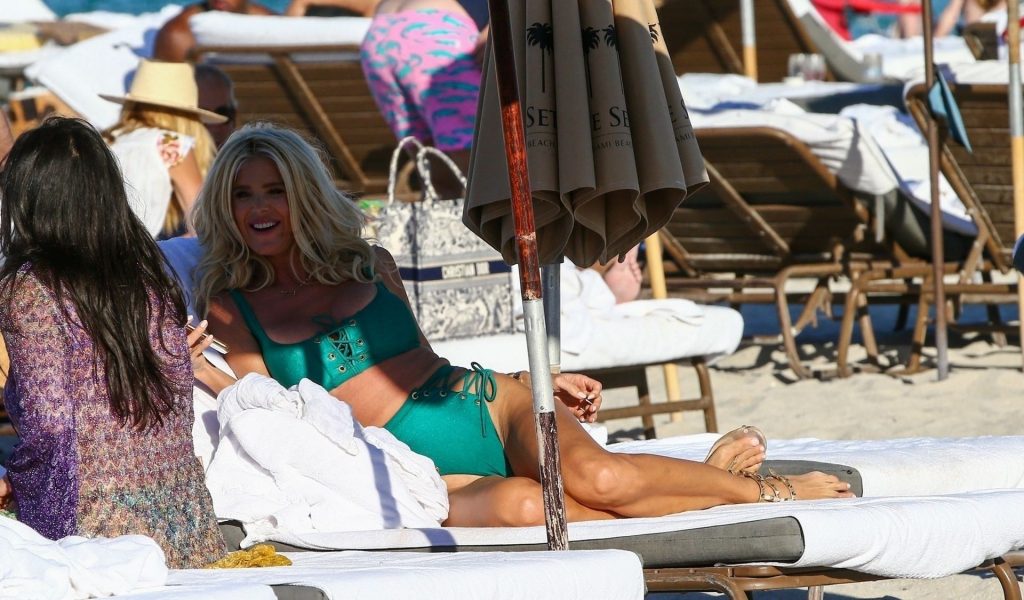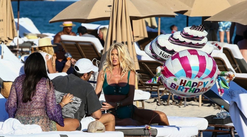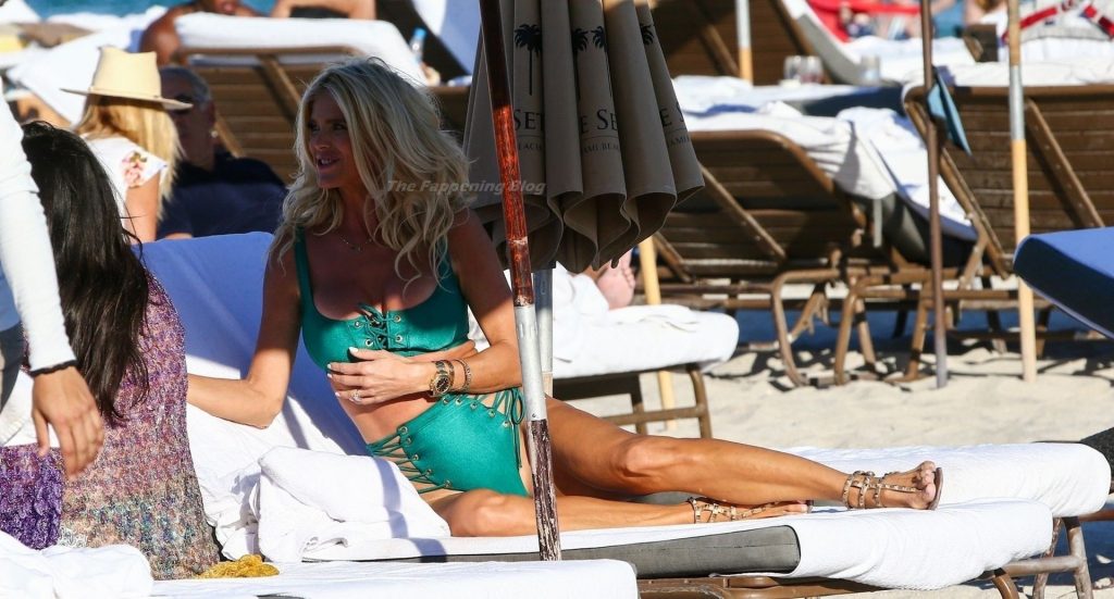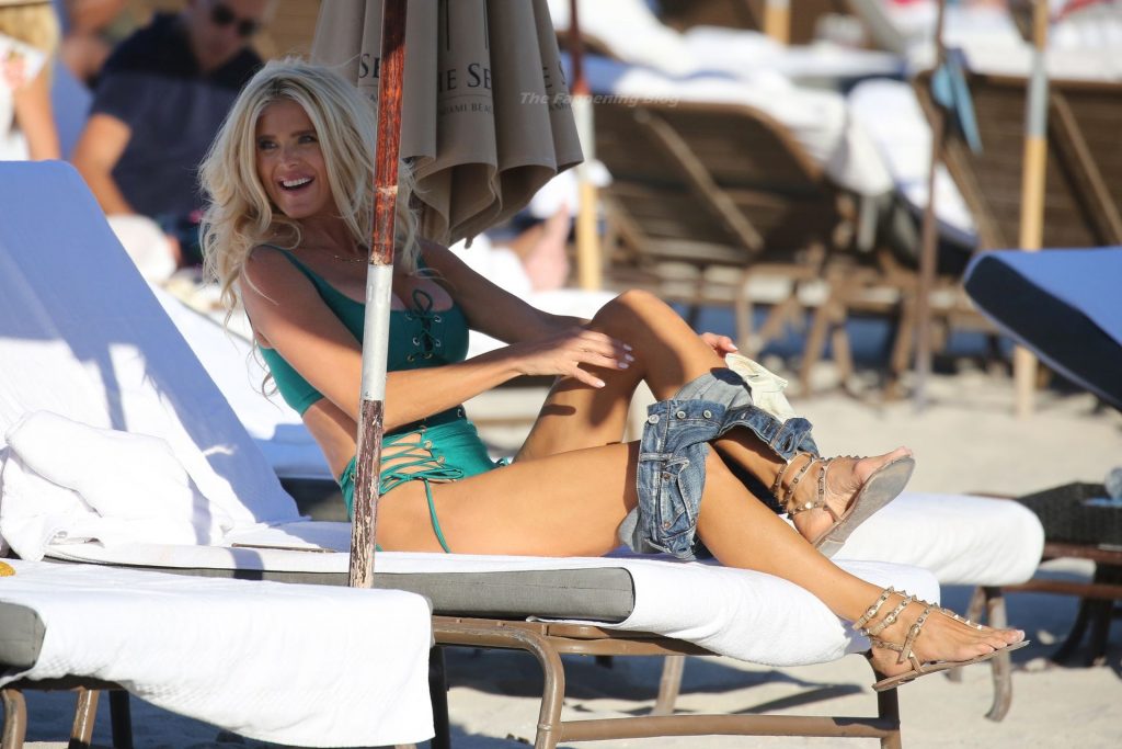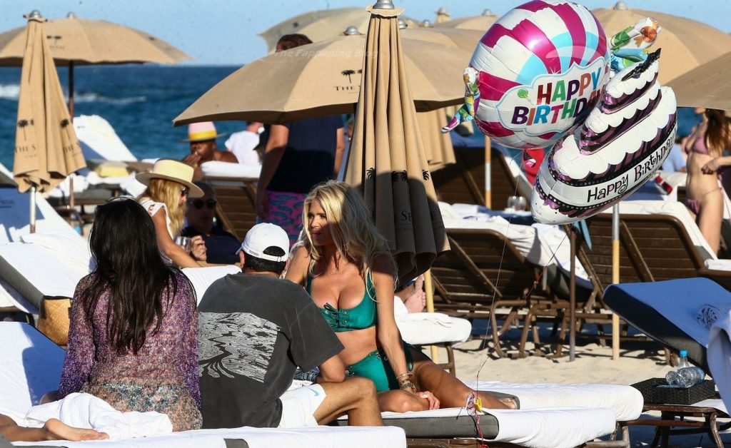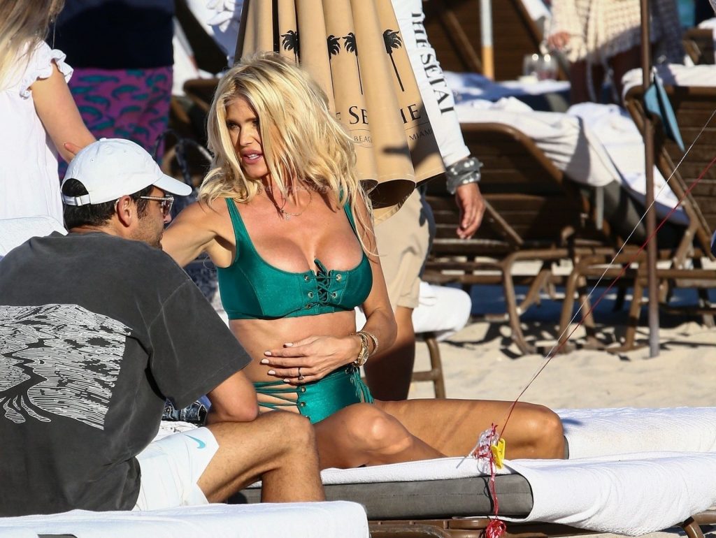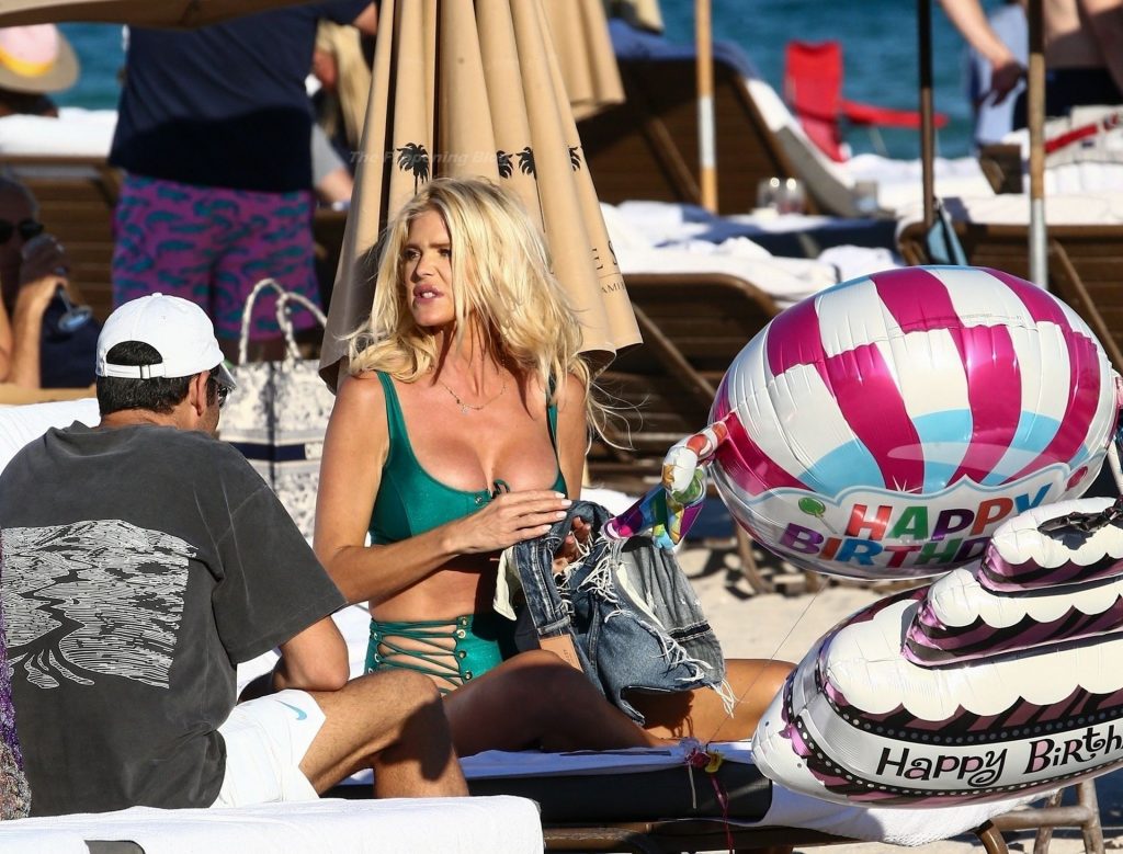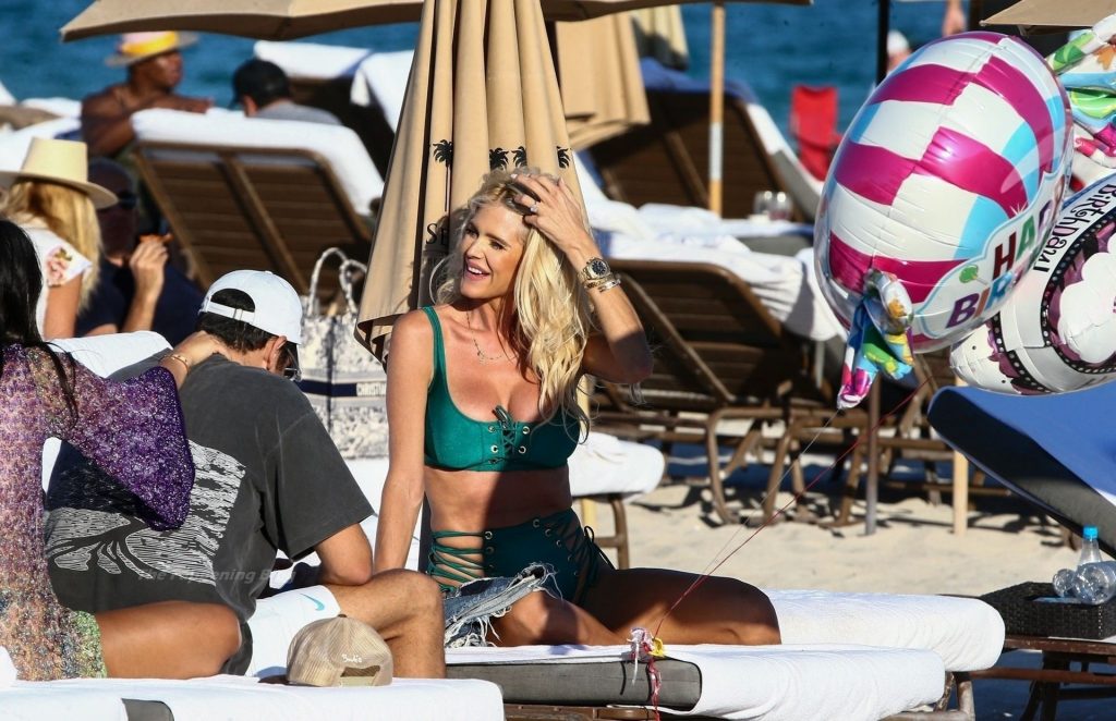 A modelo sueca Victoria Silvstedt exibe sua figura bronzeada em um biquíni verde sexy enquanto relaxa na praia celebrando o aniversário de uma amiga em Miami Beach, 23/01/2021.