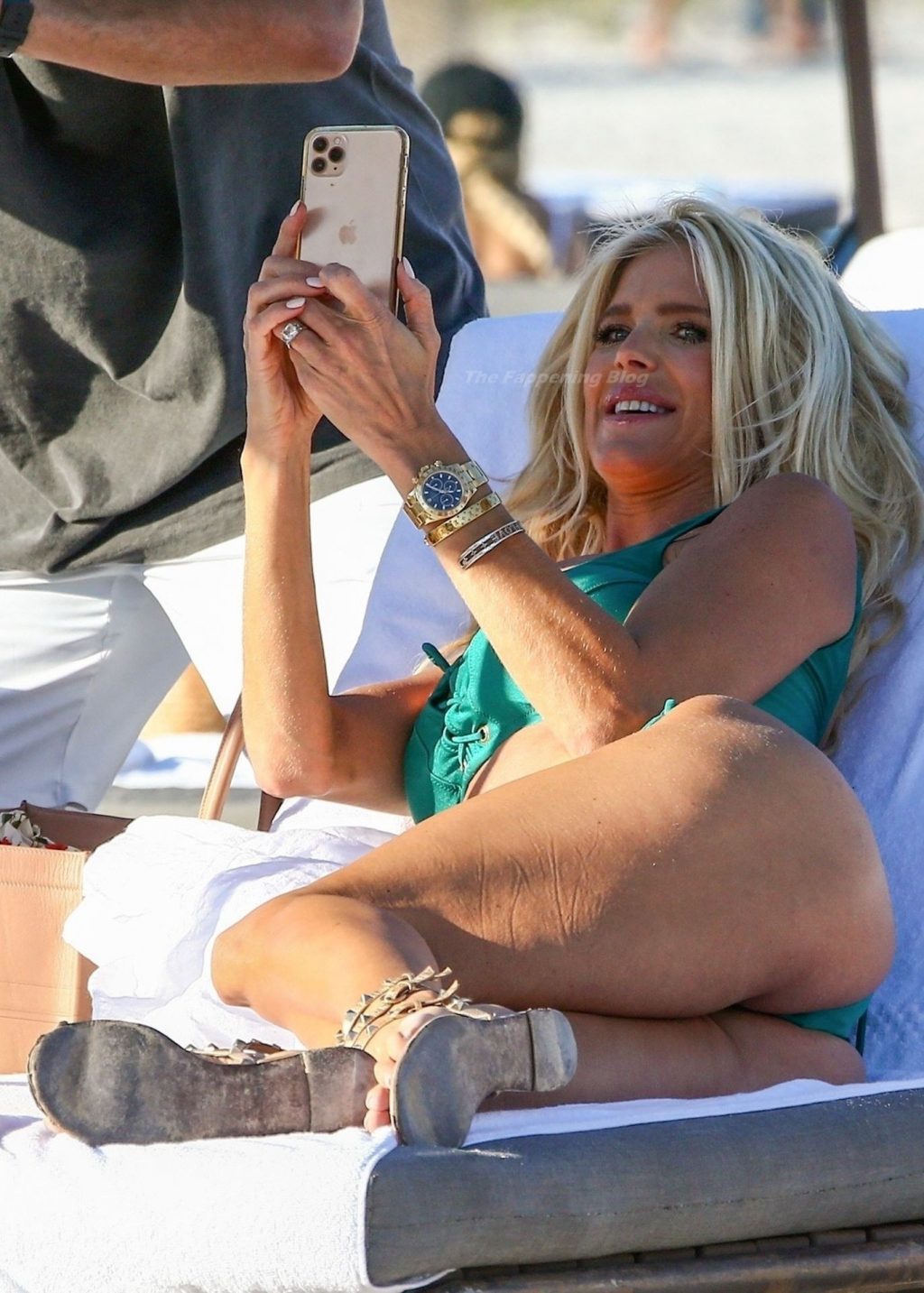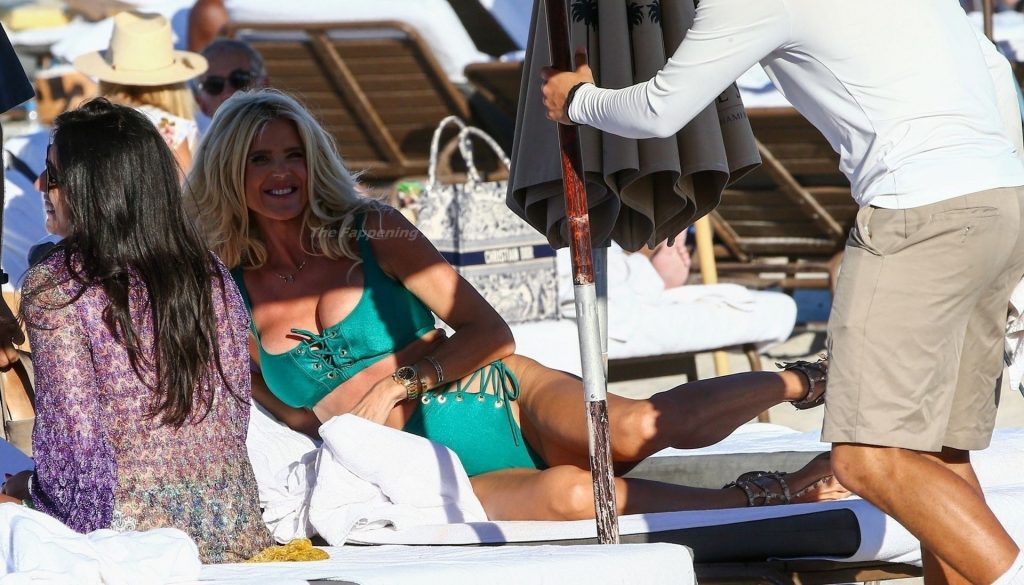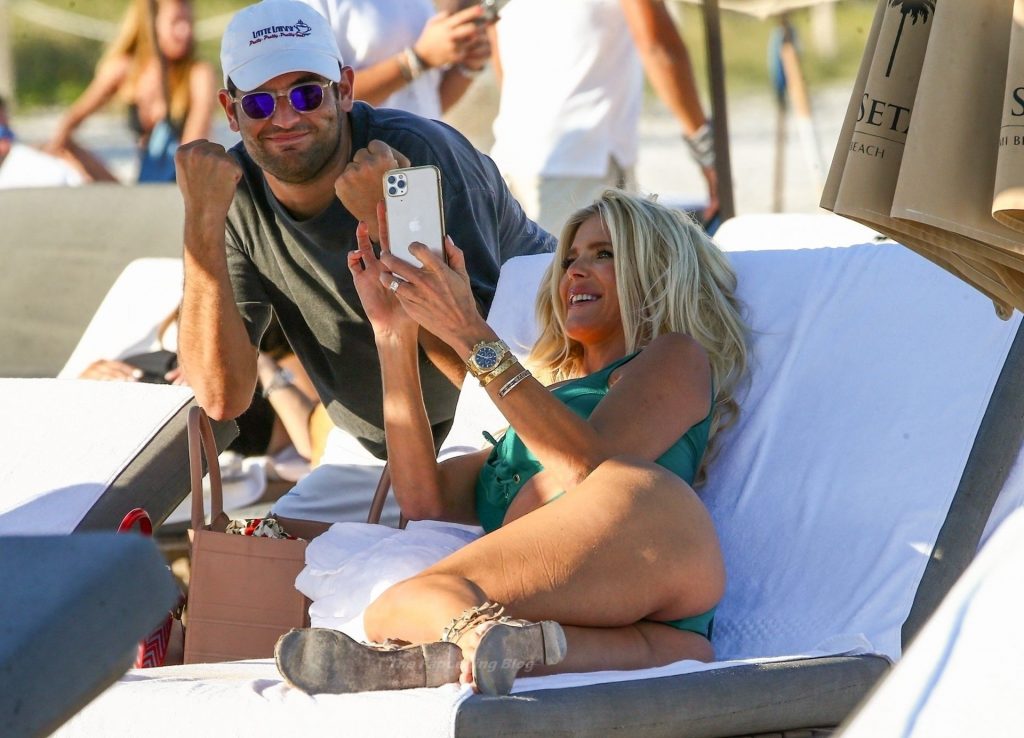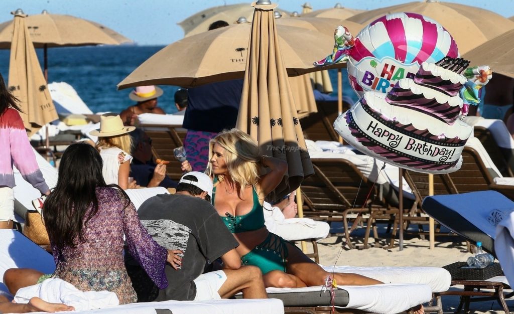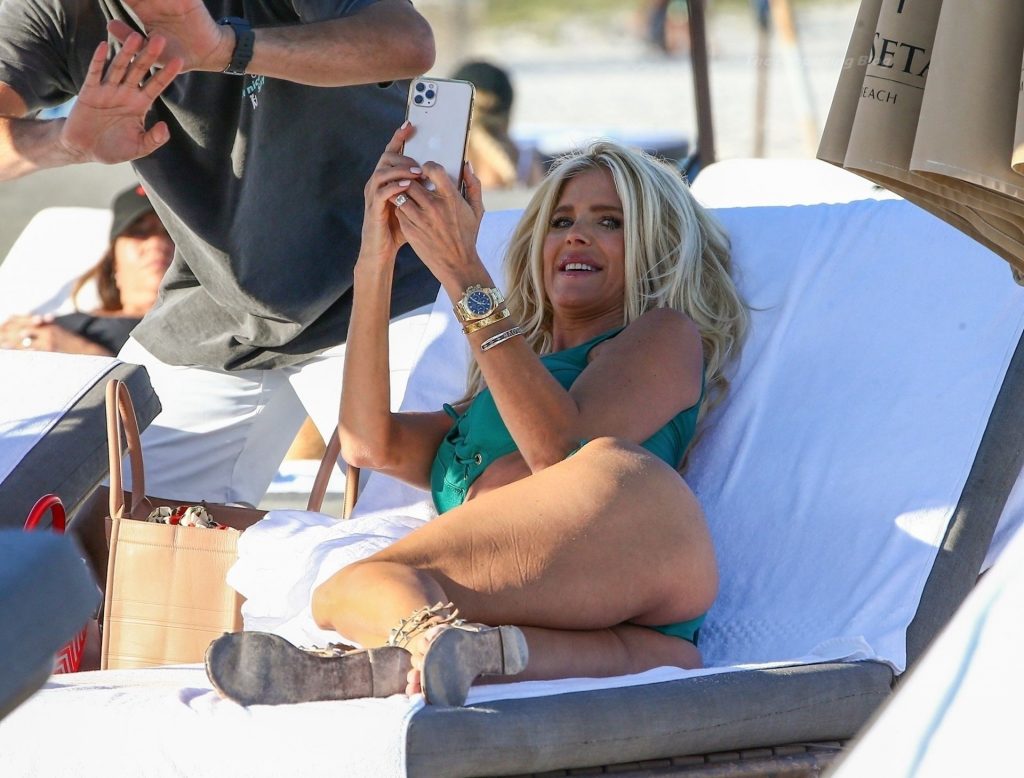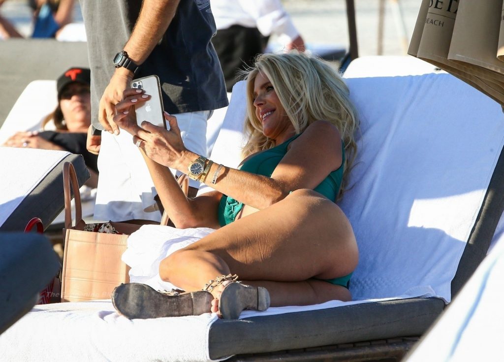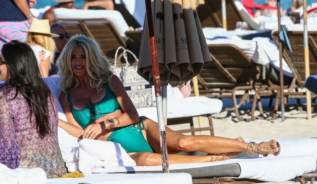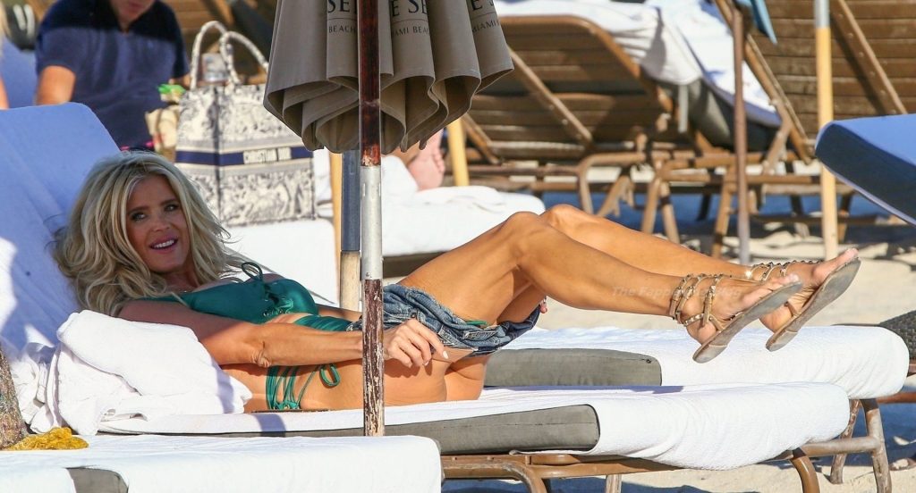 A modelo sueca Victoria Silvstedt exibe sua figura bronzeada em um biquíni verde sexy enquanto relaxa na praia celebrando o aniversário de uma amiga em Miami Beach, 23/01/2021.