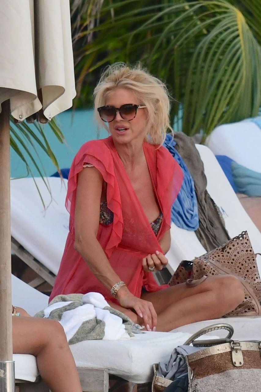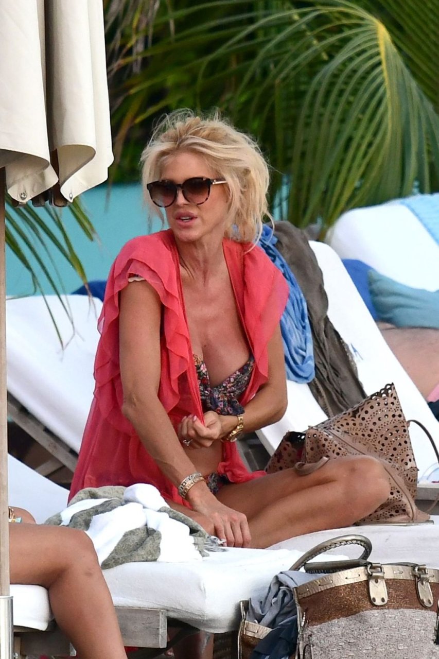 A modelo sueca de pernas longas Victoria Silvstedt e o namorado Maurice Dabbah foram vistos de férias em St. Barts, 22/12/2018. A modelo escolheu um maiô sexy para as férias na praia, que enfatizou a magnífica forma da mulher de 44 anos.