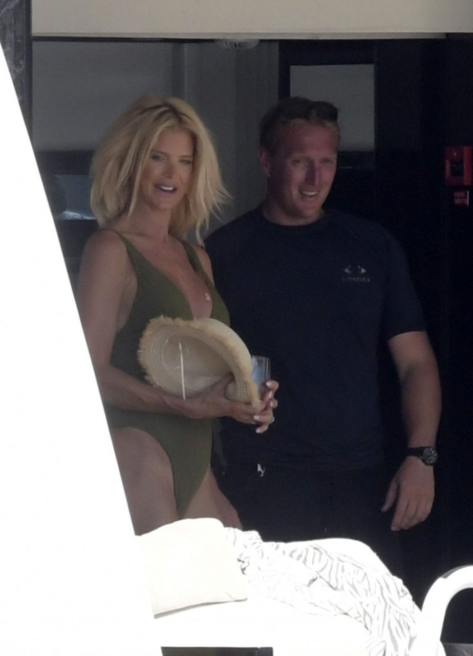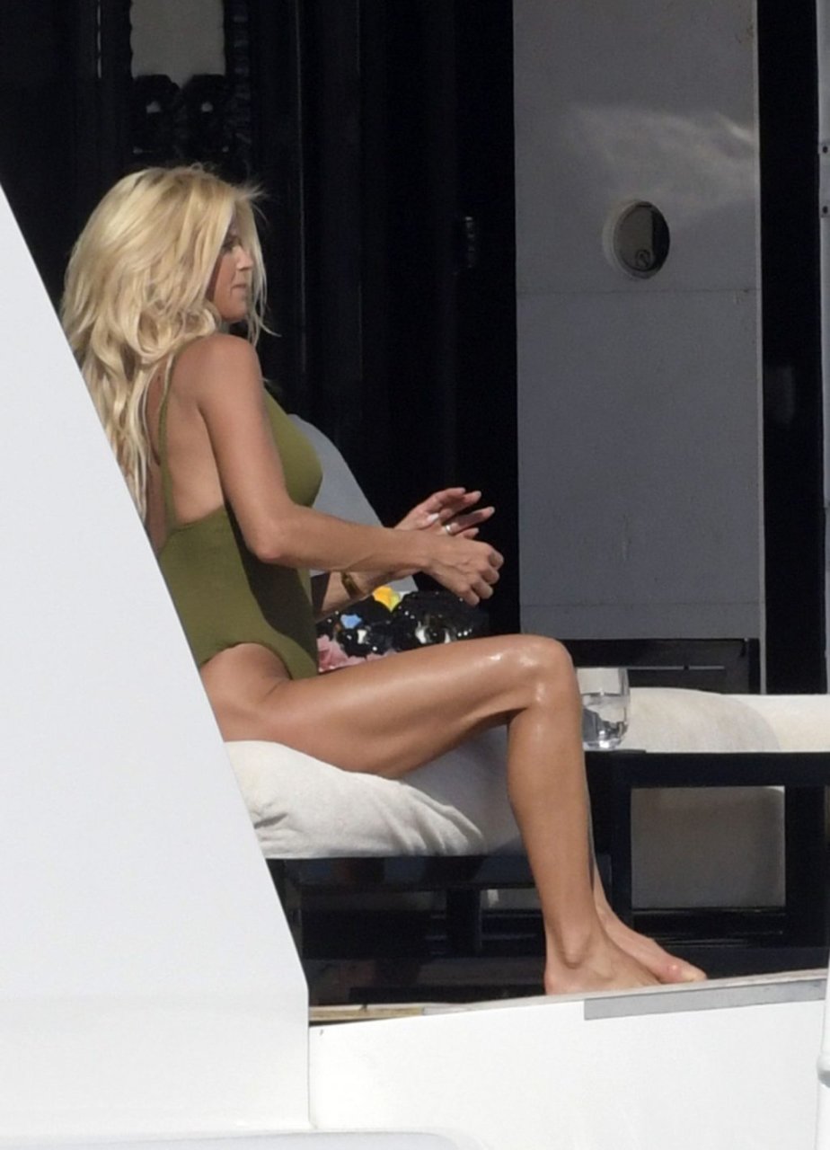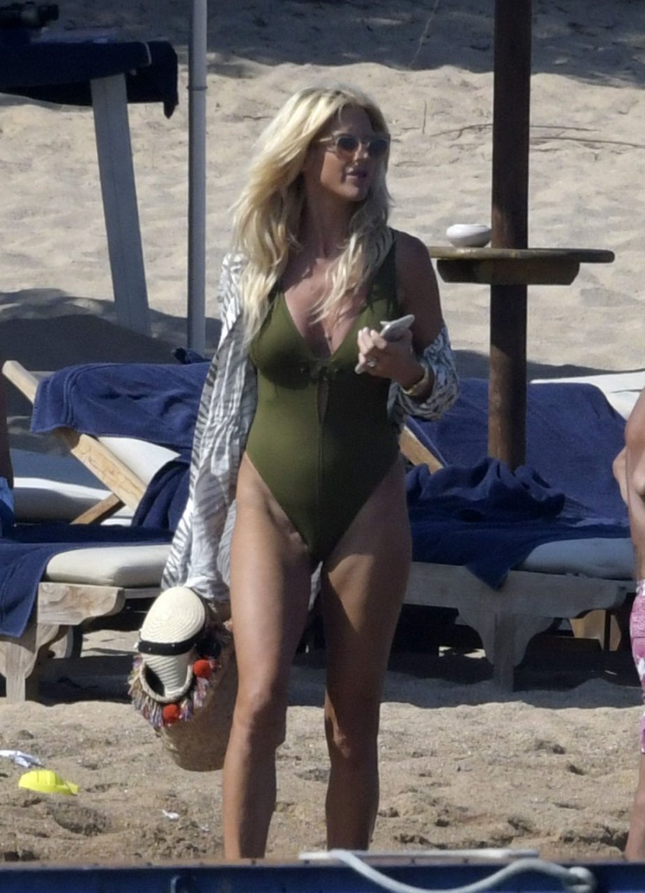 Victoria Silvstedt (43) foi vista usando um maiô verde super sexy na praia da Sardenha, 06/08/2018. A figura da celebridade é incrível: pernas longas, barriga lisa e seios fartos.
