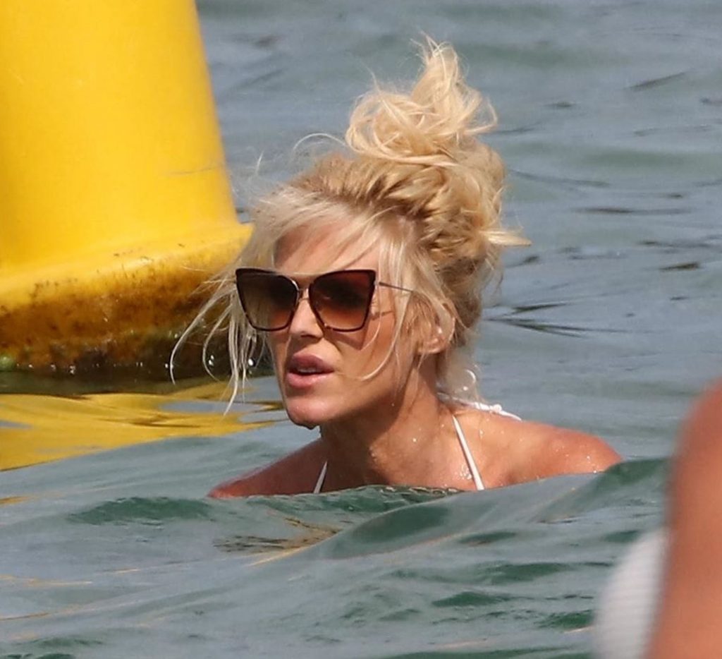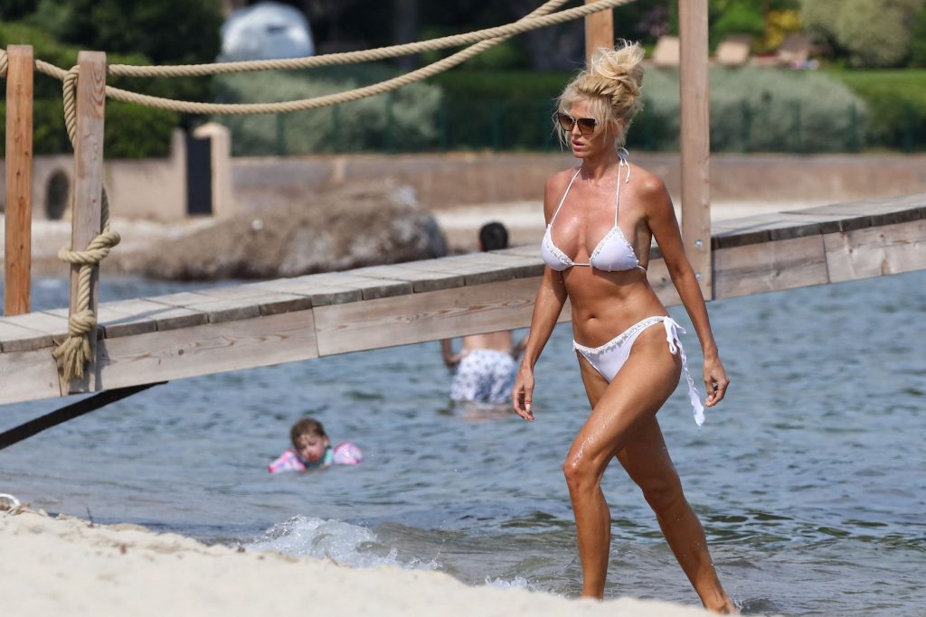Modelo suíça Victoria Silvstedt está nadando usando um biquíni branco minúsculo na praia do Jardin Tropezina em Saint-Tropez, 28/07/2020.