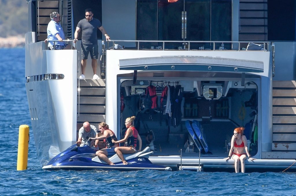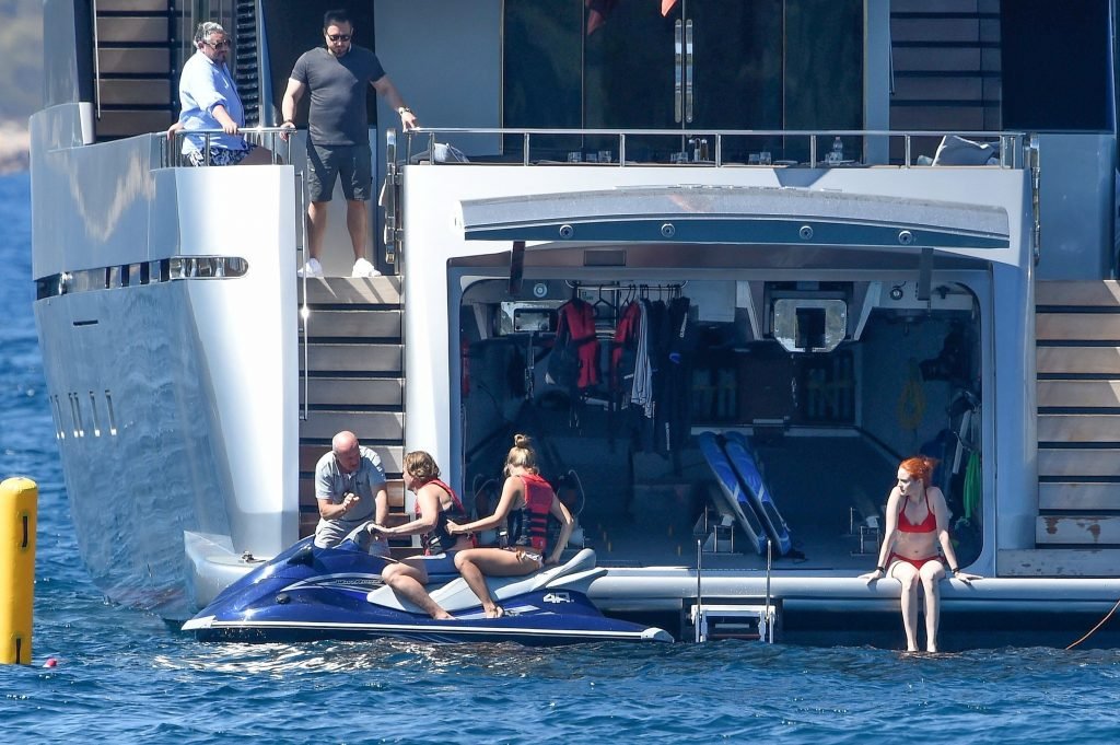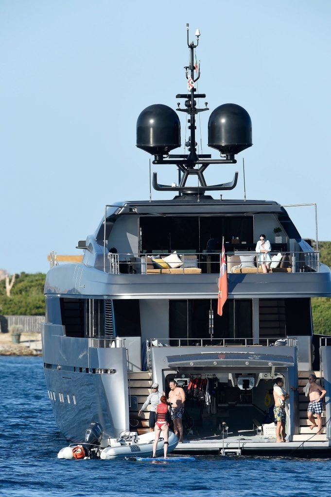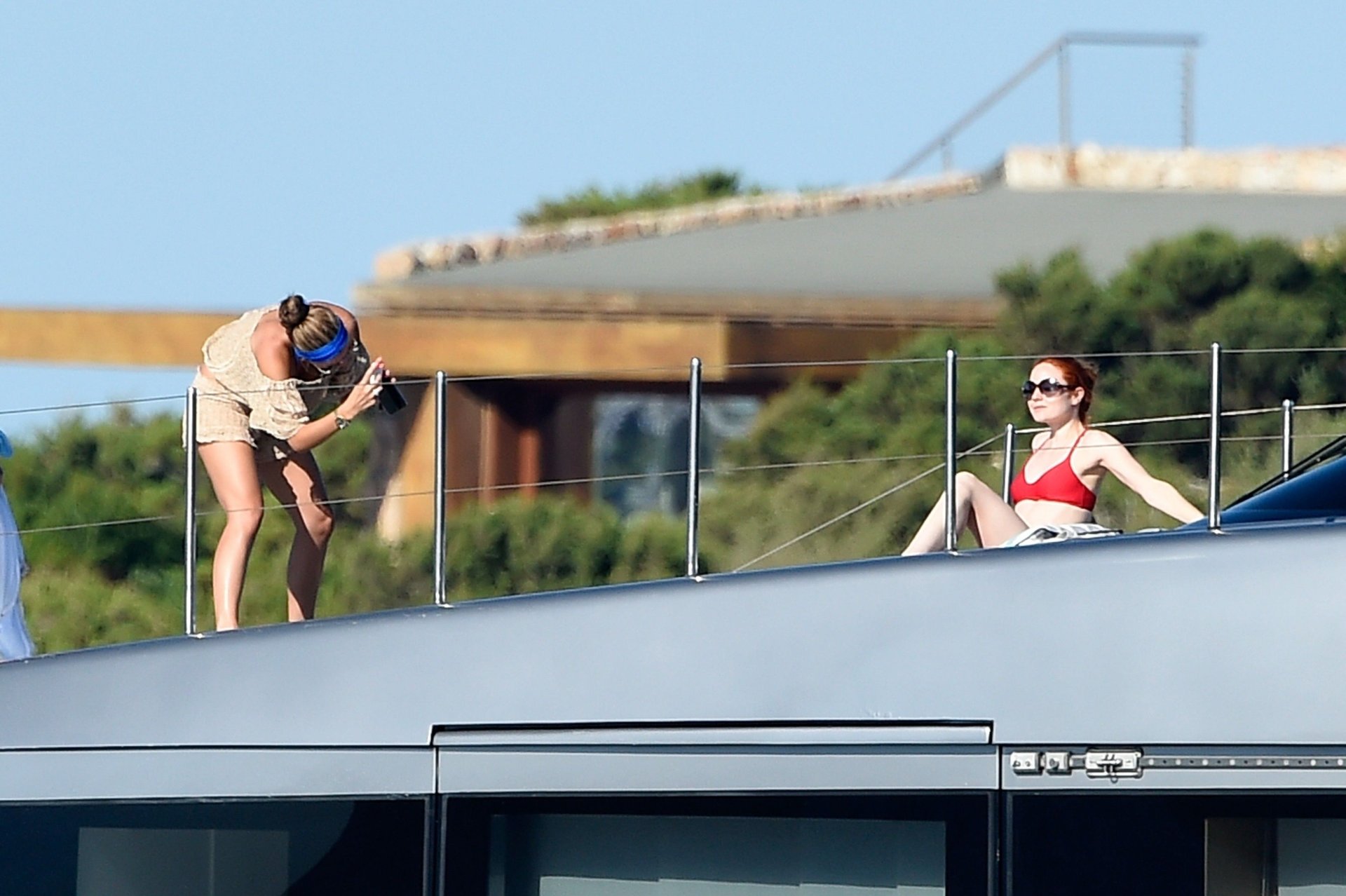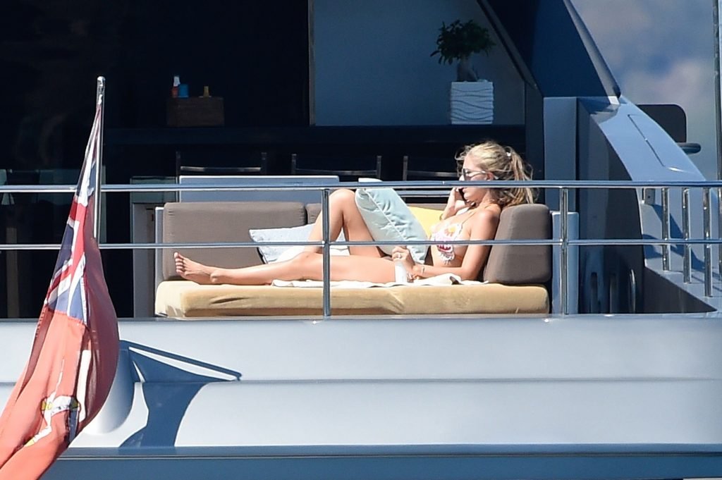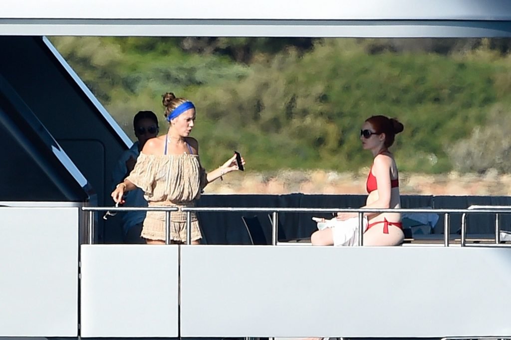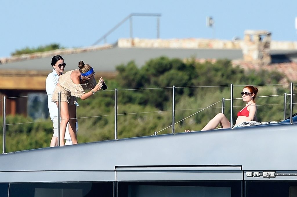 Herdeira milionária Swarovski Victoria Swarovski e a vencedora do concurso de top model alemã Barbara Meier aproveitando a vida de ricos e famosos em um iate na Sardenha, 24/08/2017.