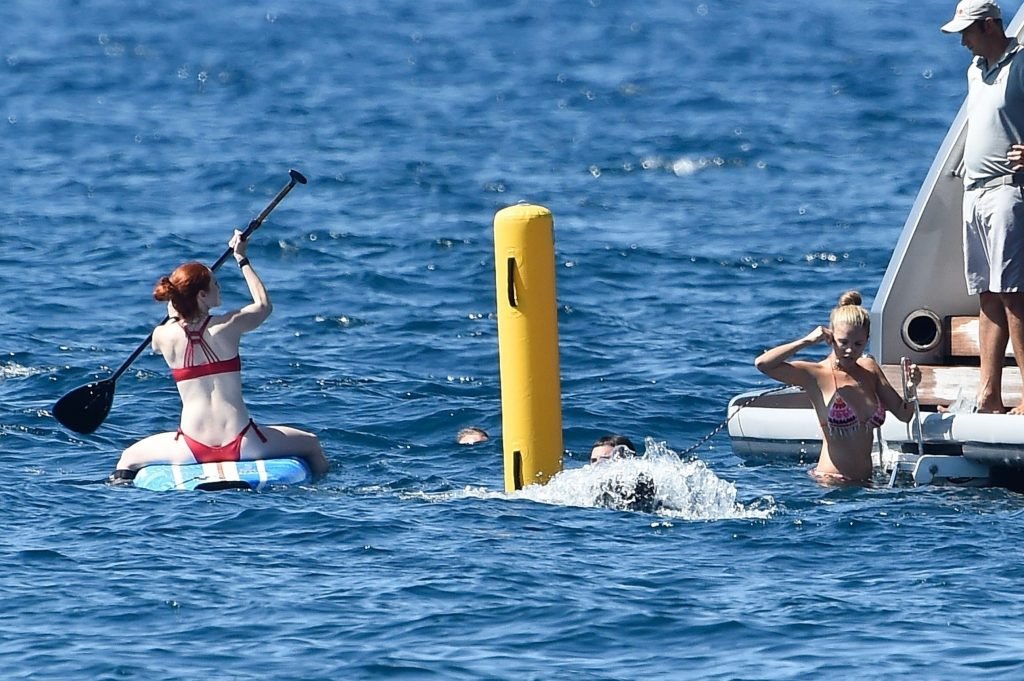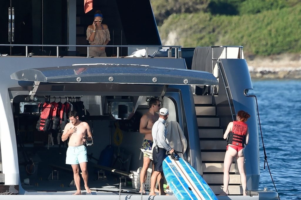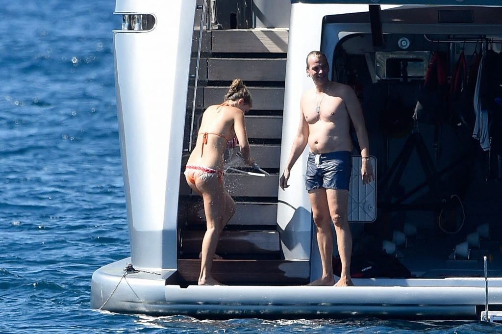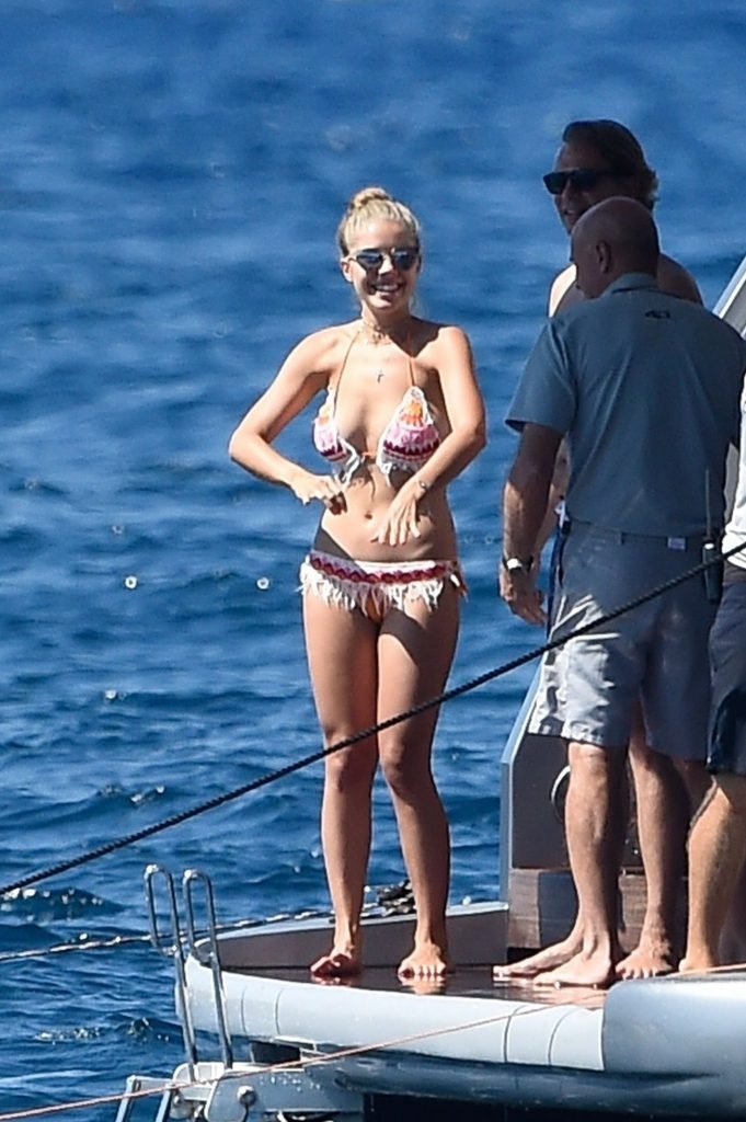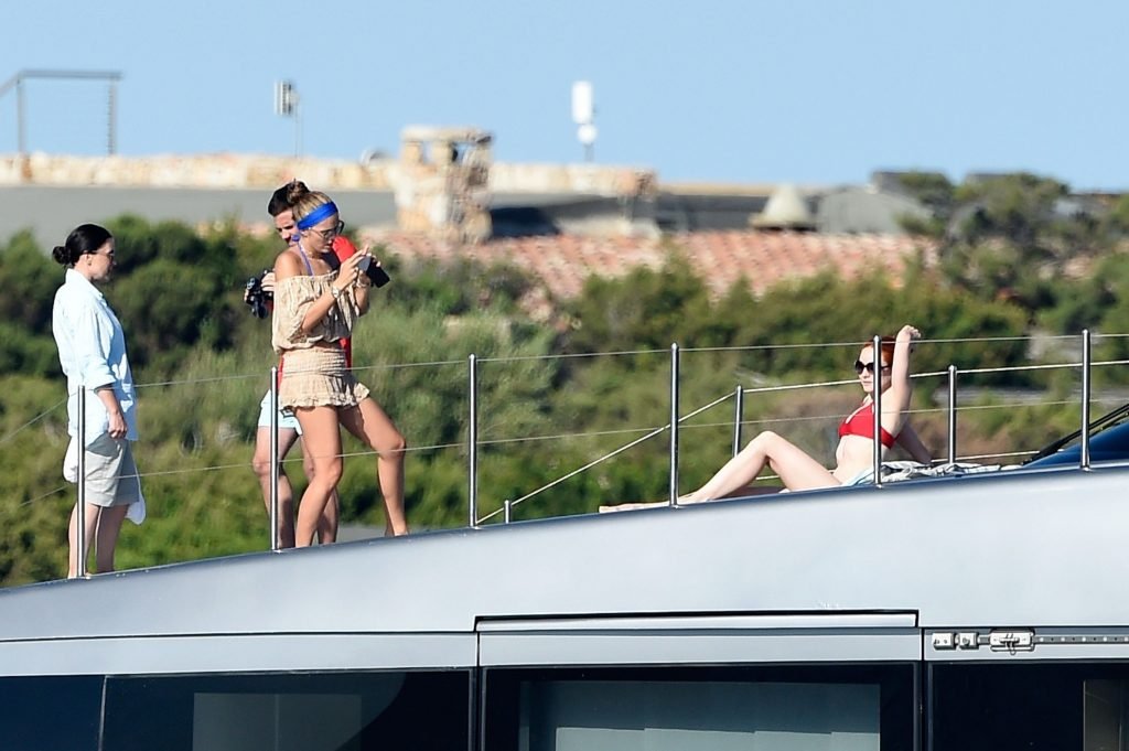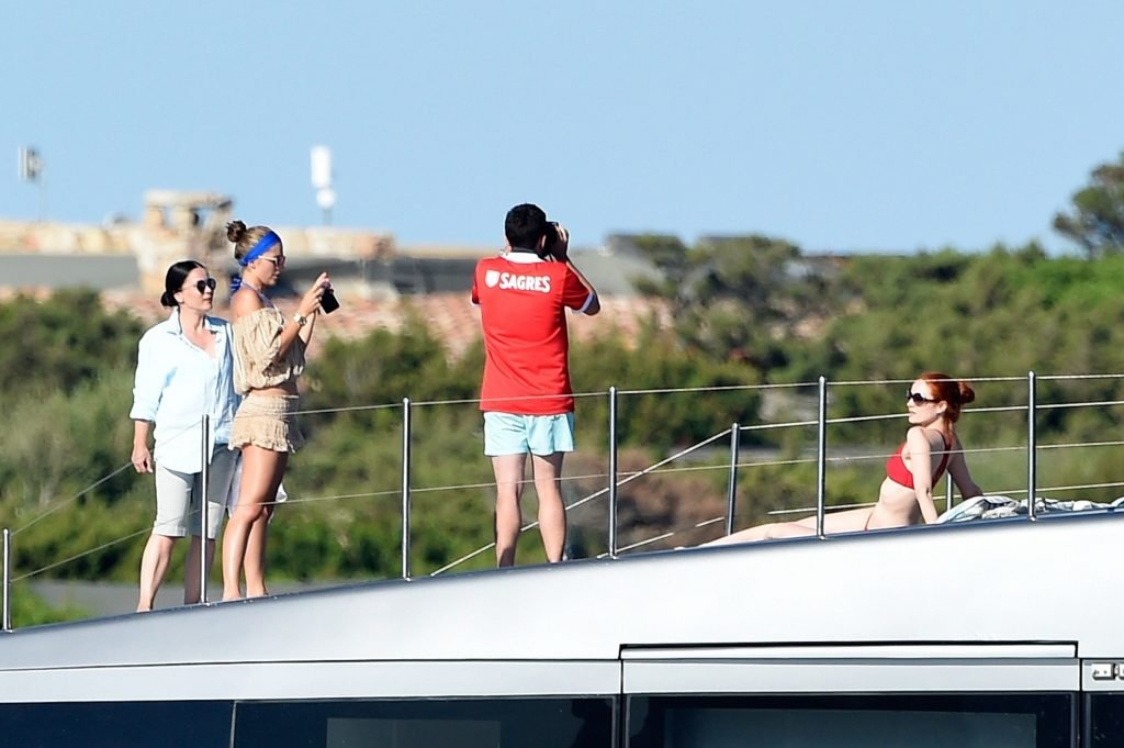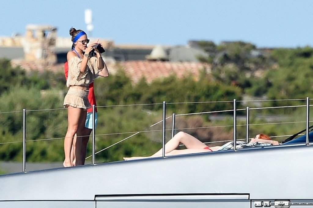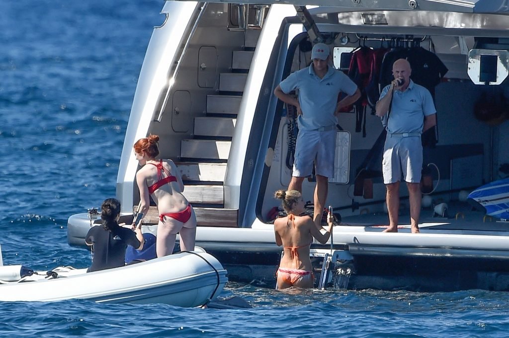 Herdeira milionária Swarovski Victoria Swarovski e a vencedora do concurso de top model alemã Barbara Meier aproveitando a vida de ricos e famosos em um iate na Sardenha, 24/08/2017.