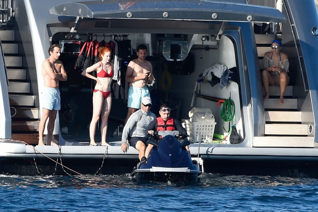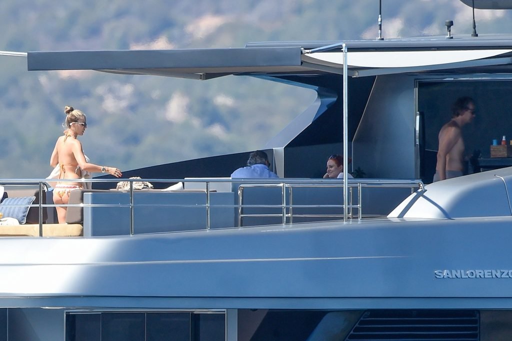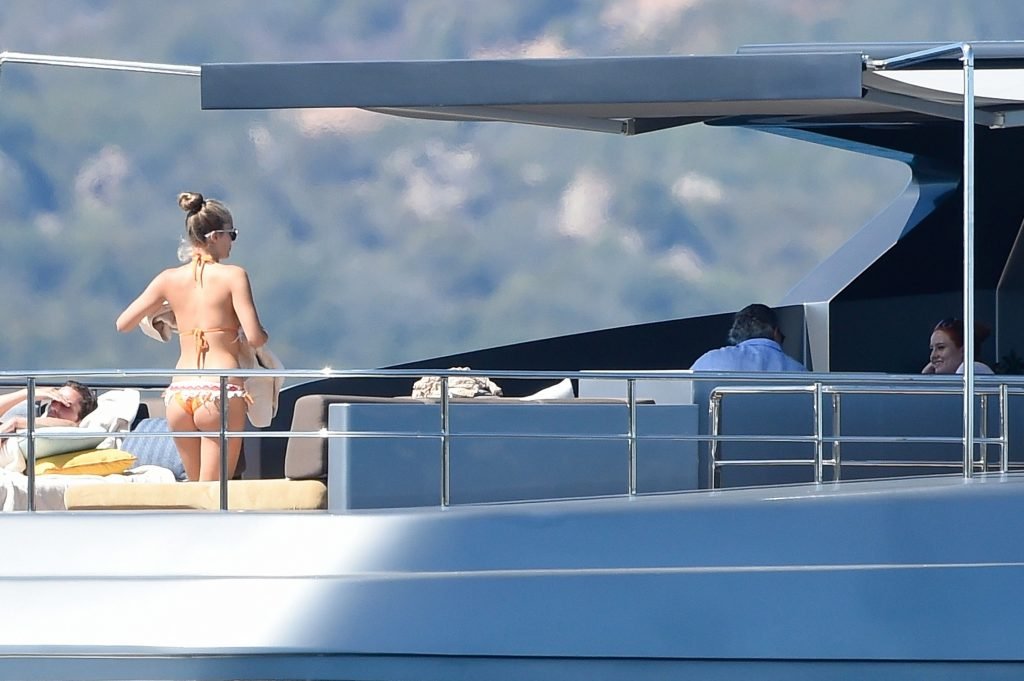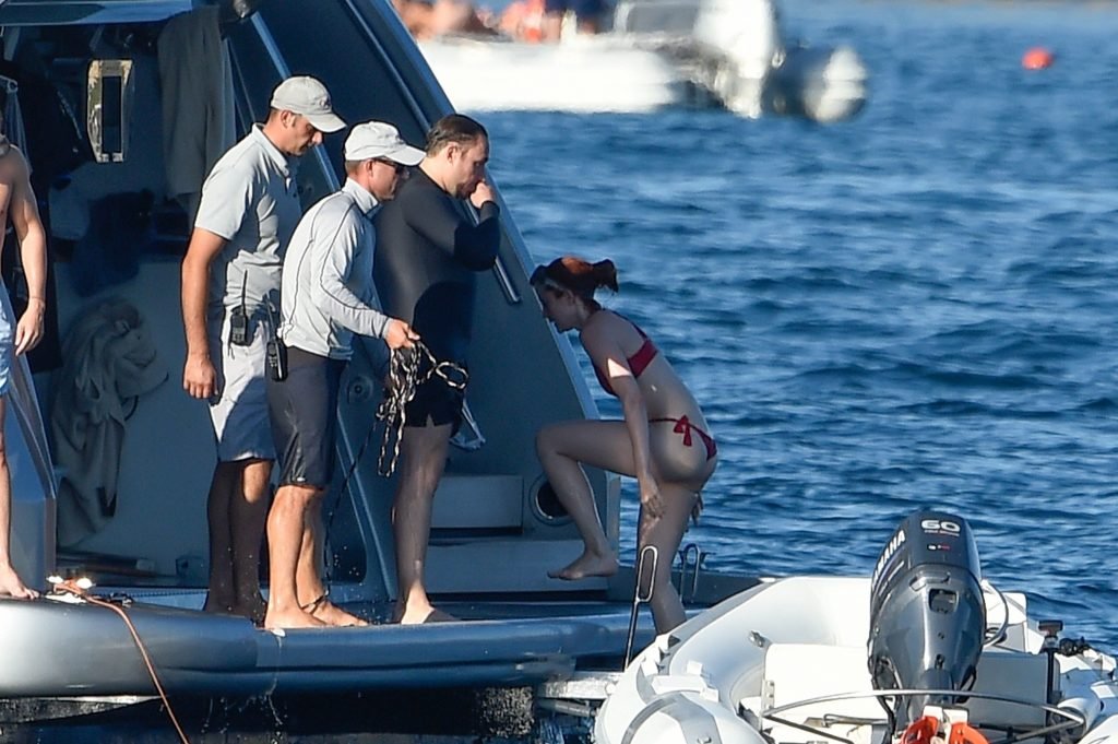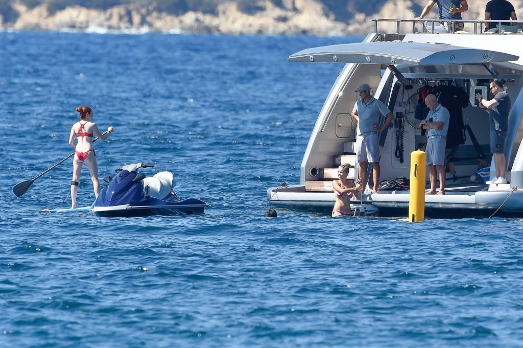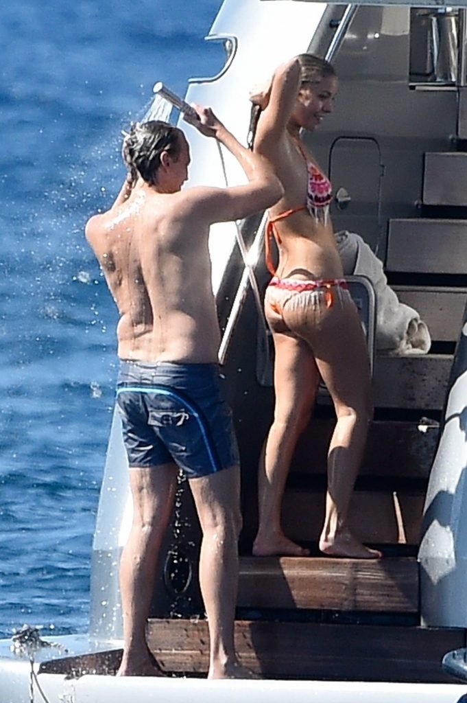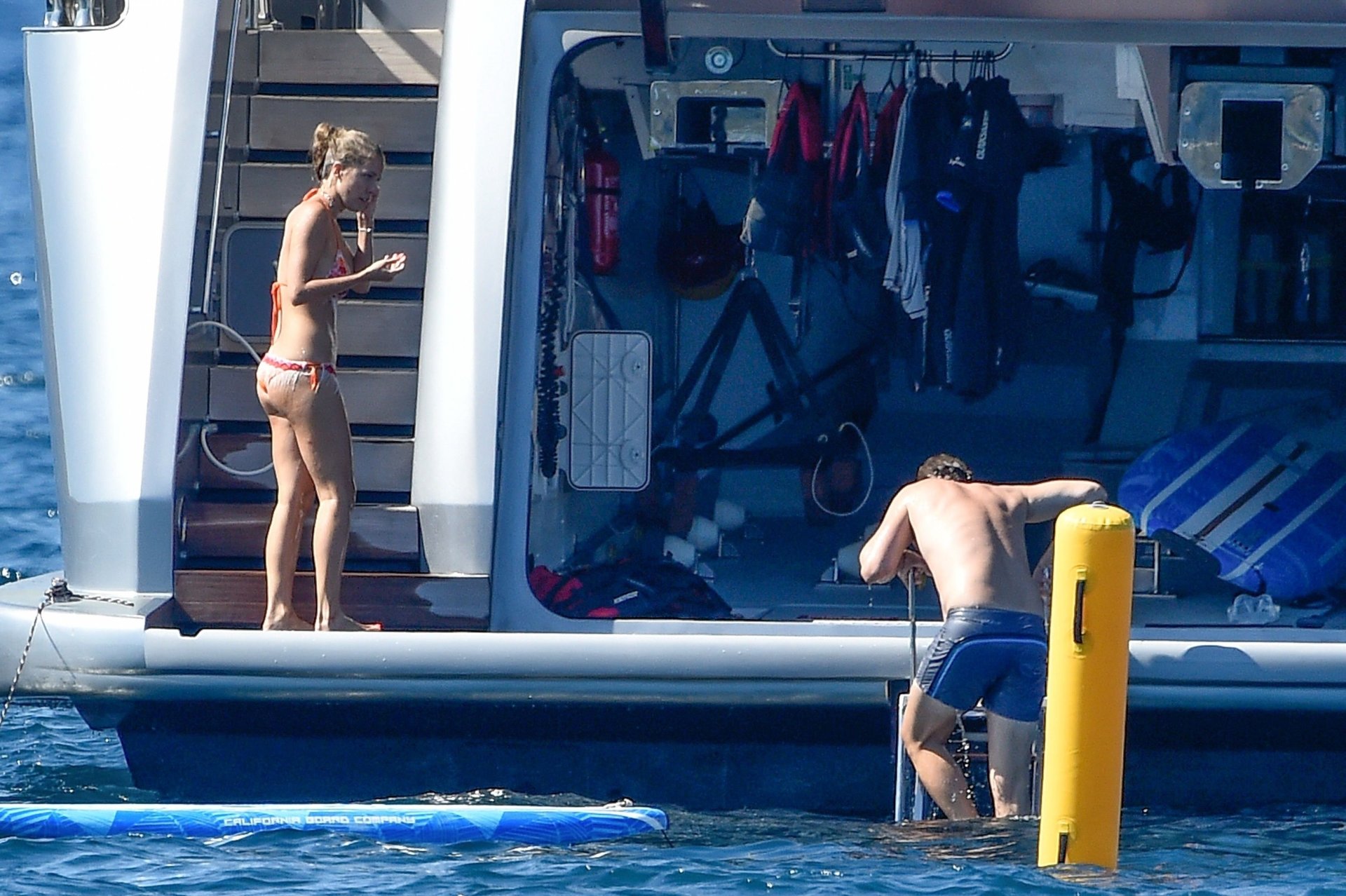 Herdeira milionária Swarovski Victoria Swarovski e a vencedora do concurso de top model alemã Barbara Meier aproveitando a vida de ricos e famosos em um iate na Sardenha, 24/08/2017.
