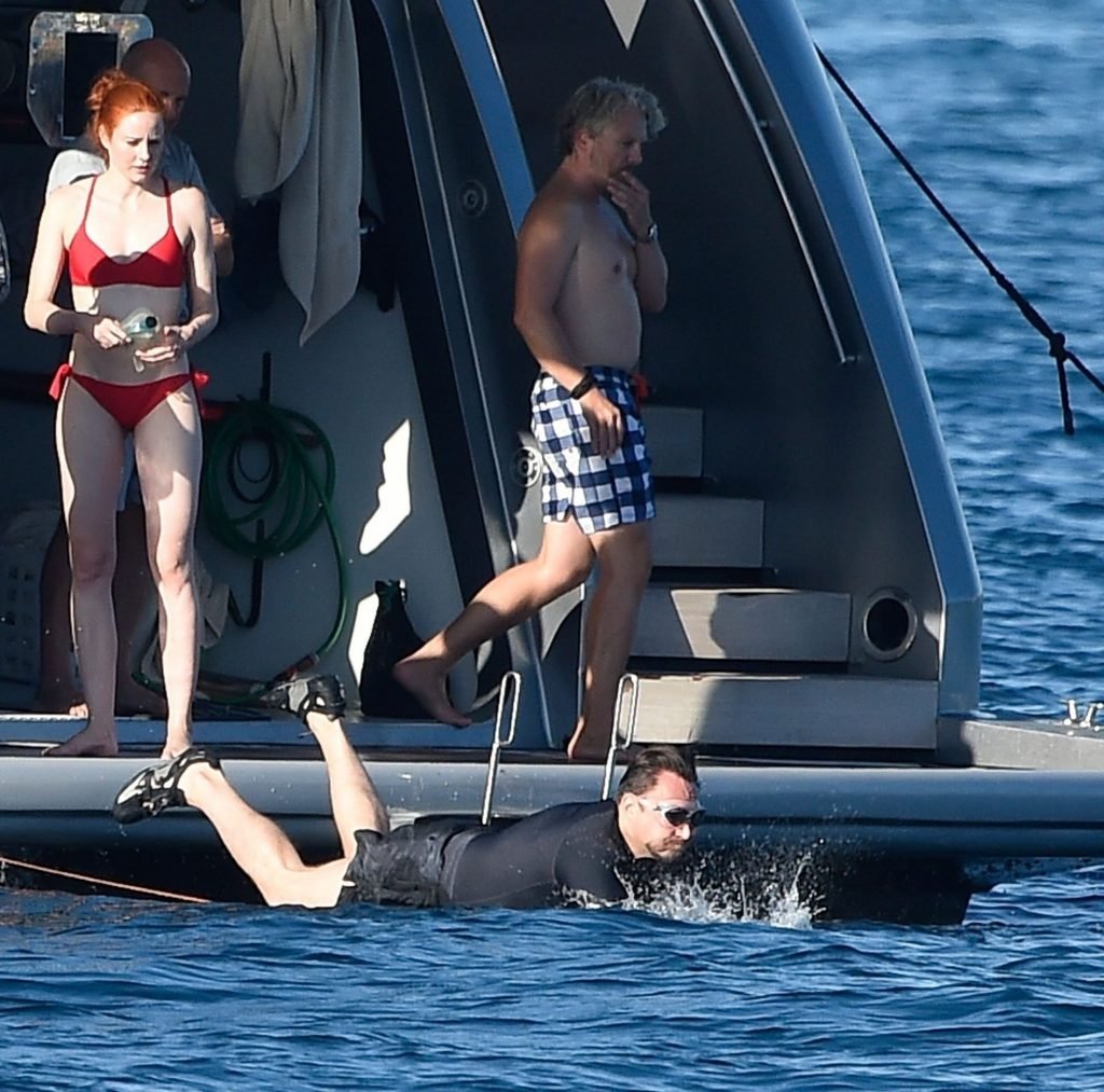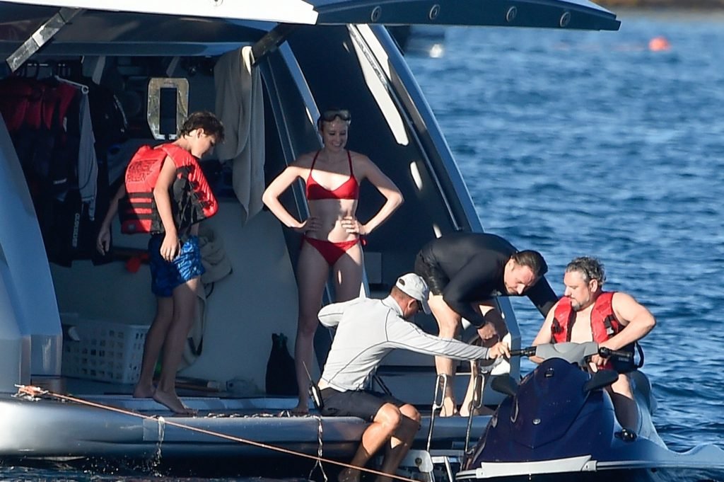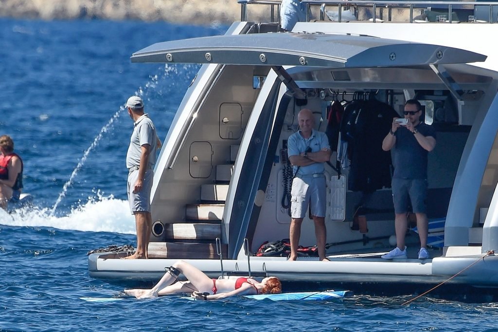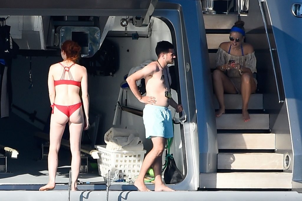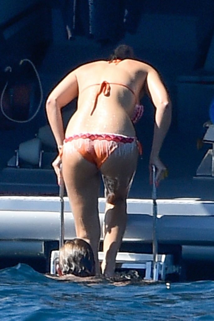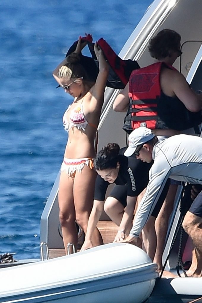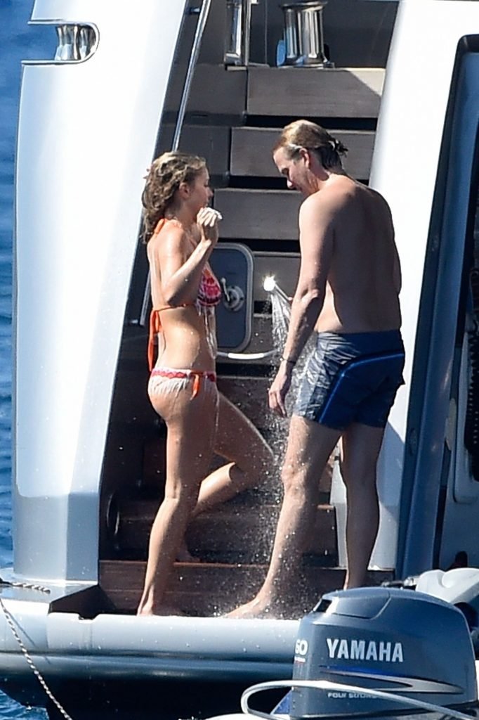 Herdeira milionária Swarovski Victoria Swarovski e a vencedora do concurso de top model alemã Barbara Meier aproveitando a vida de ricos e famosos em um iate na Sardenha, 24/08/2017.