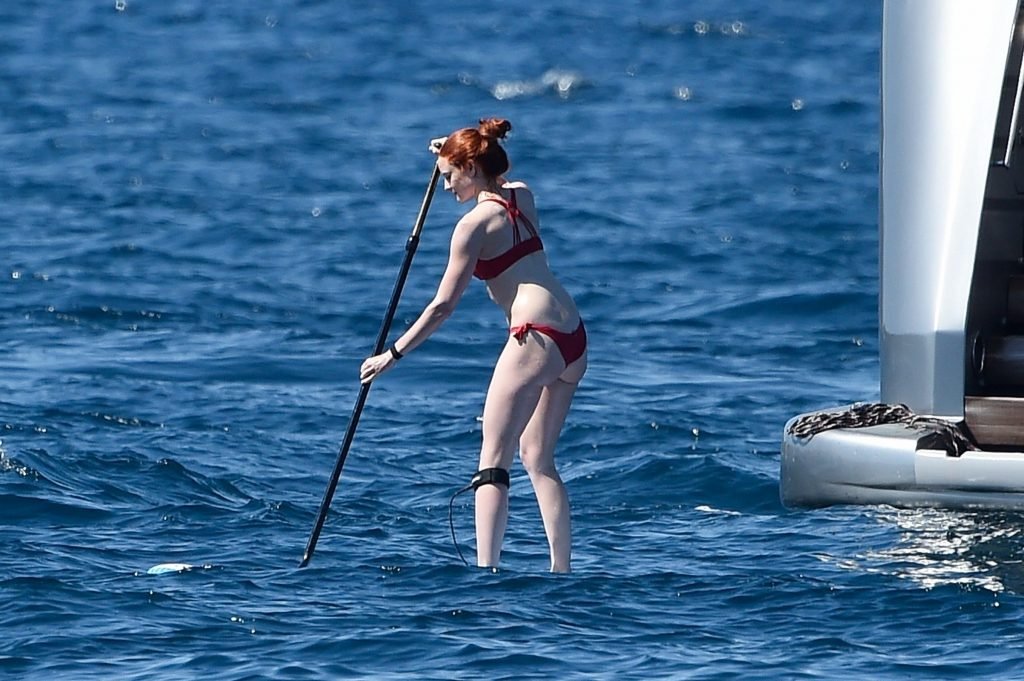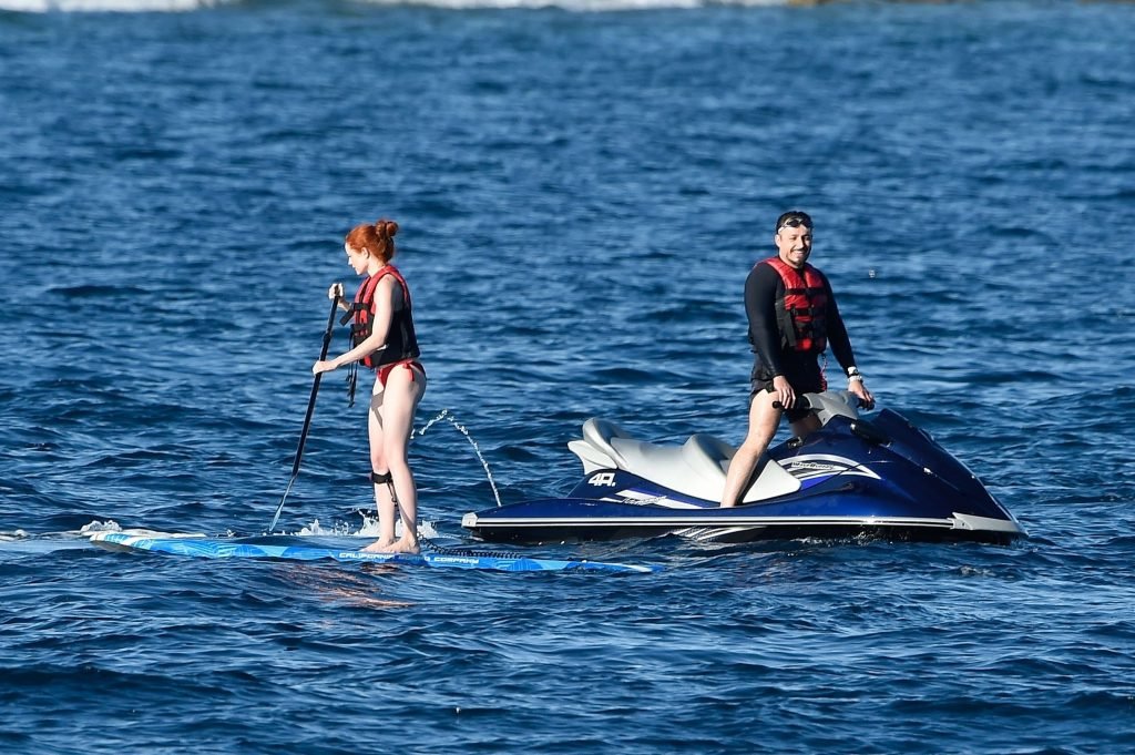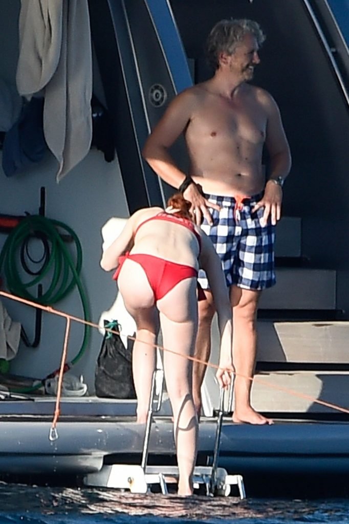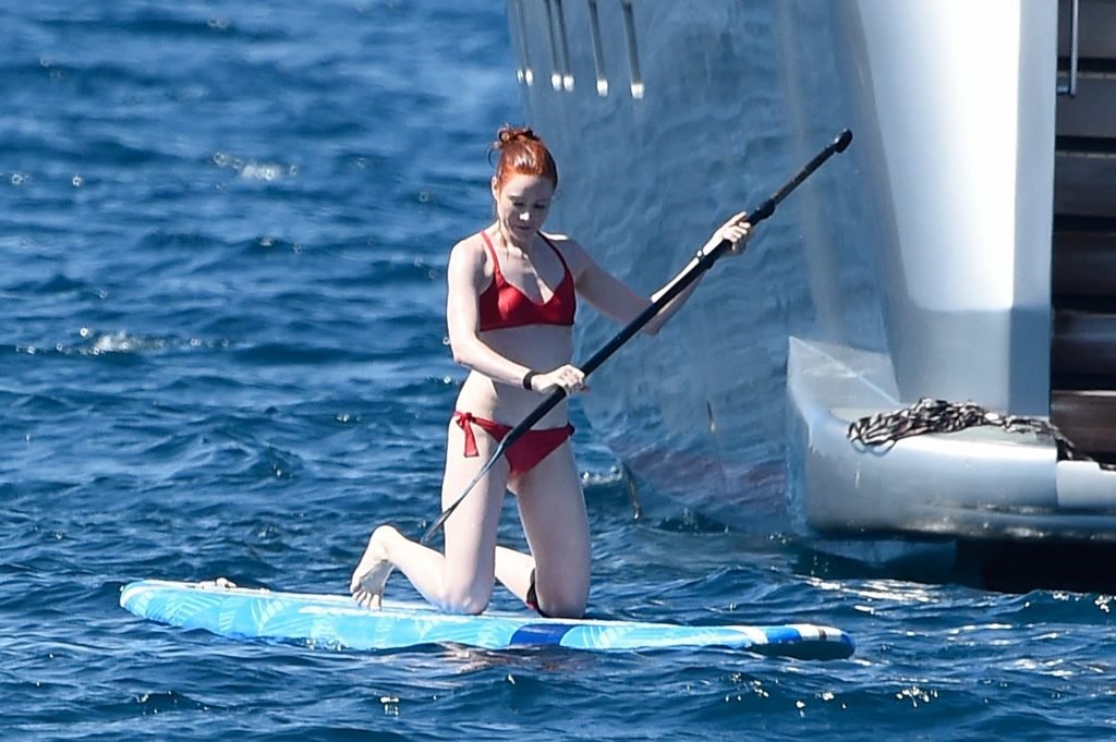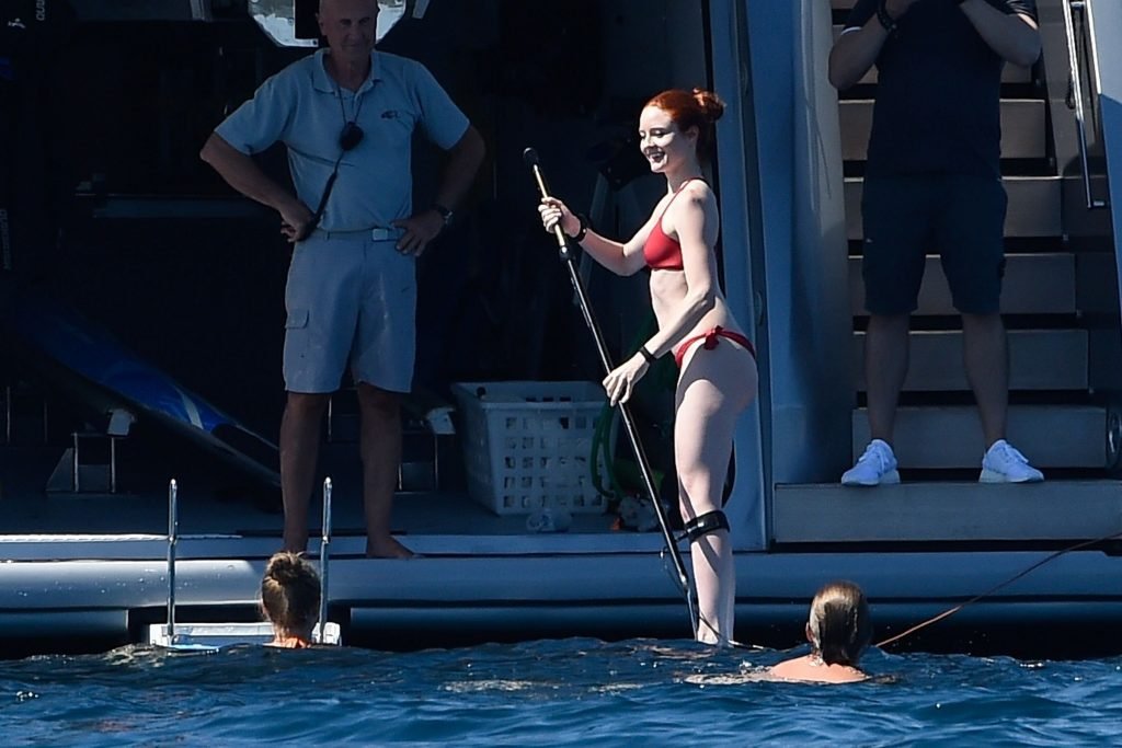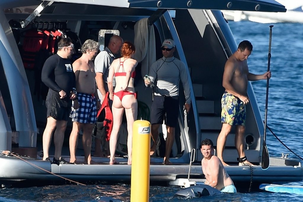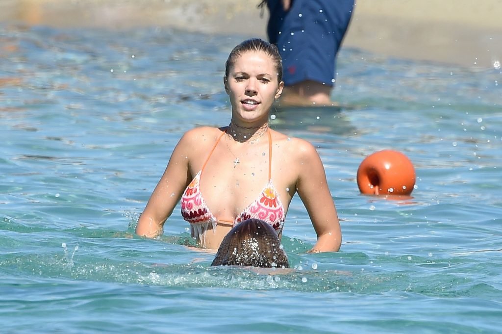Herdeira milionária Swarovski Victoria Swarovski e a vencedora do concurso de top model alemã Barbara Meier aproveitando a vida de ricos e famosos em um iate na Sardenha, 24/08/2017.