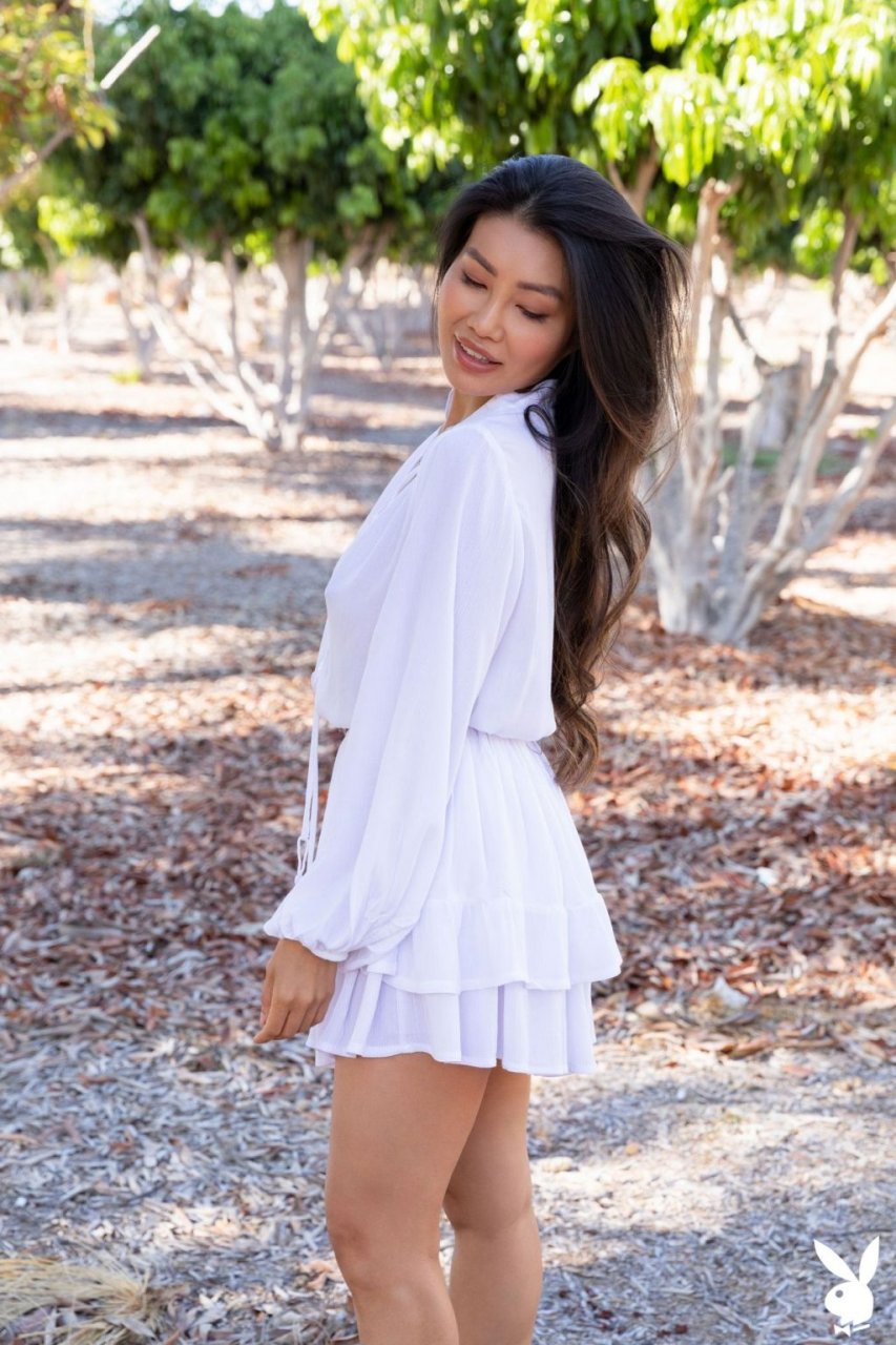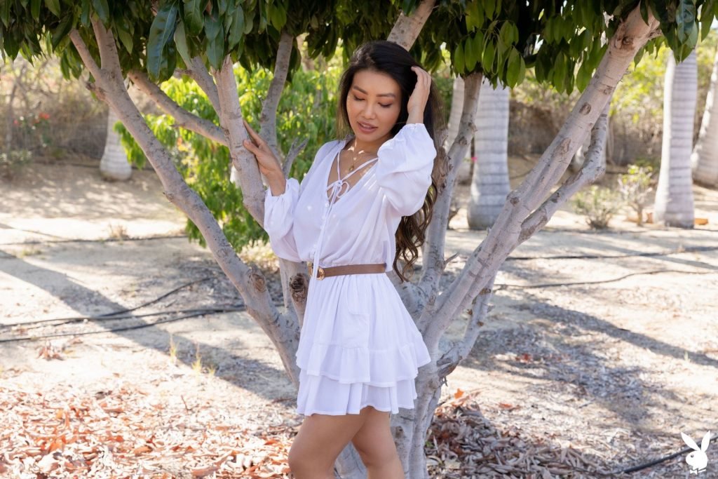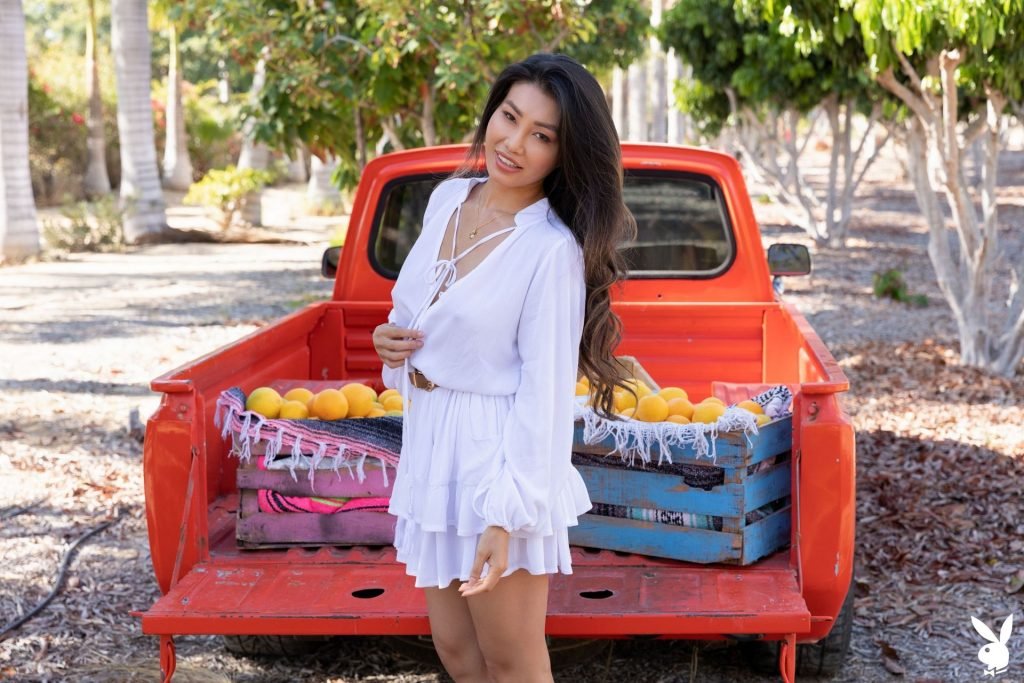 Asian brunette Viviane Leigh posa nua em um novo ensaio fotográfico chamado “Freshly Squeezed” para Playboy Plus (2019). A modelo decidiu se despir na frente da caminhonete laranja. Muitos fãs comprariam alguns quilos de frutas dessa garota!