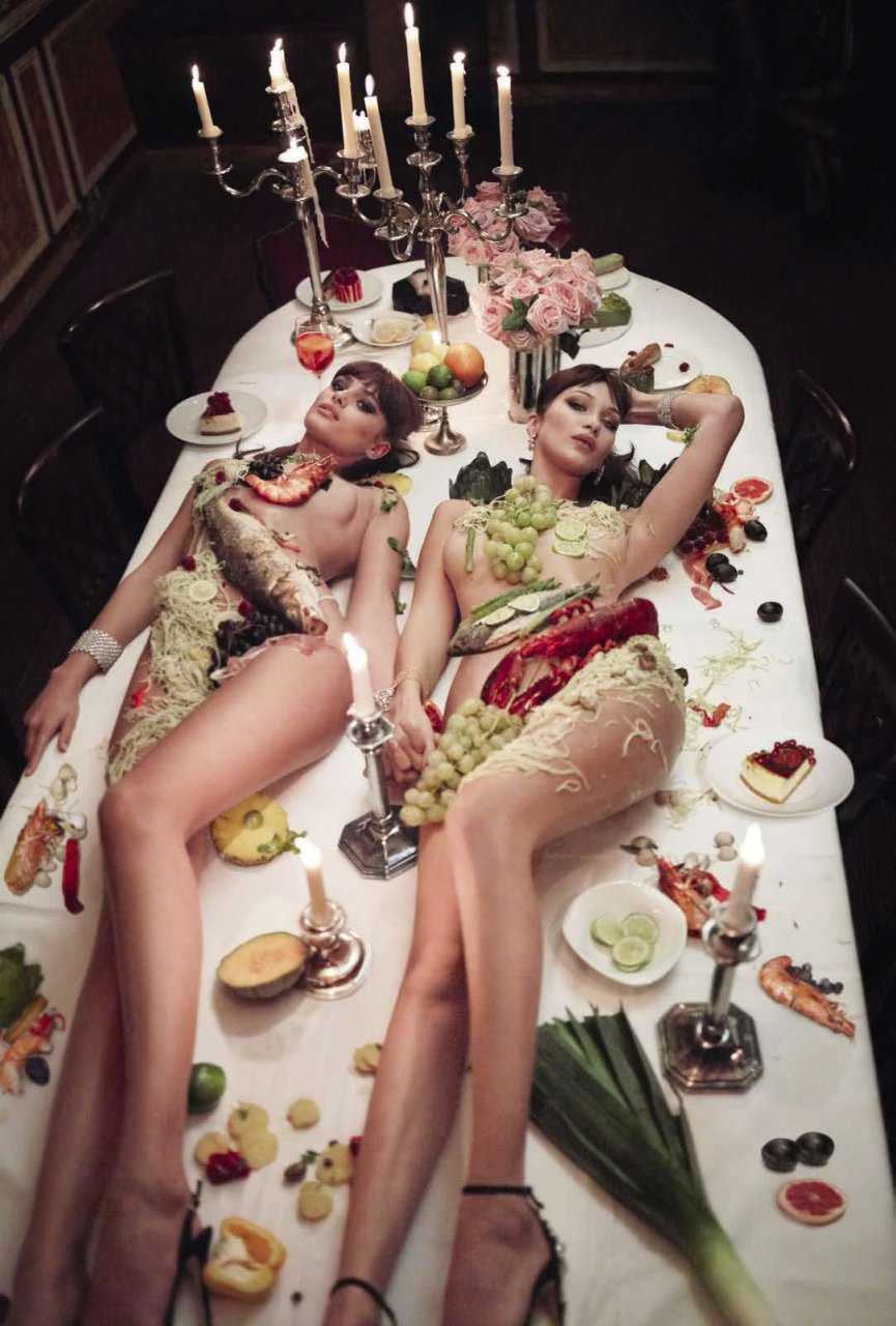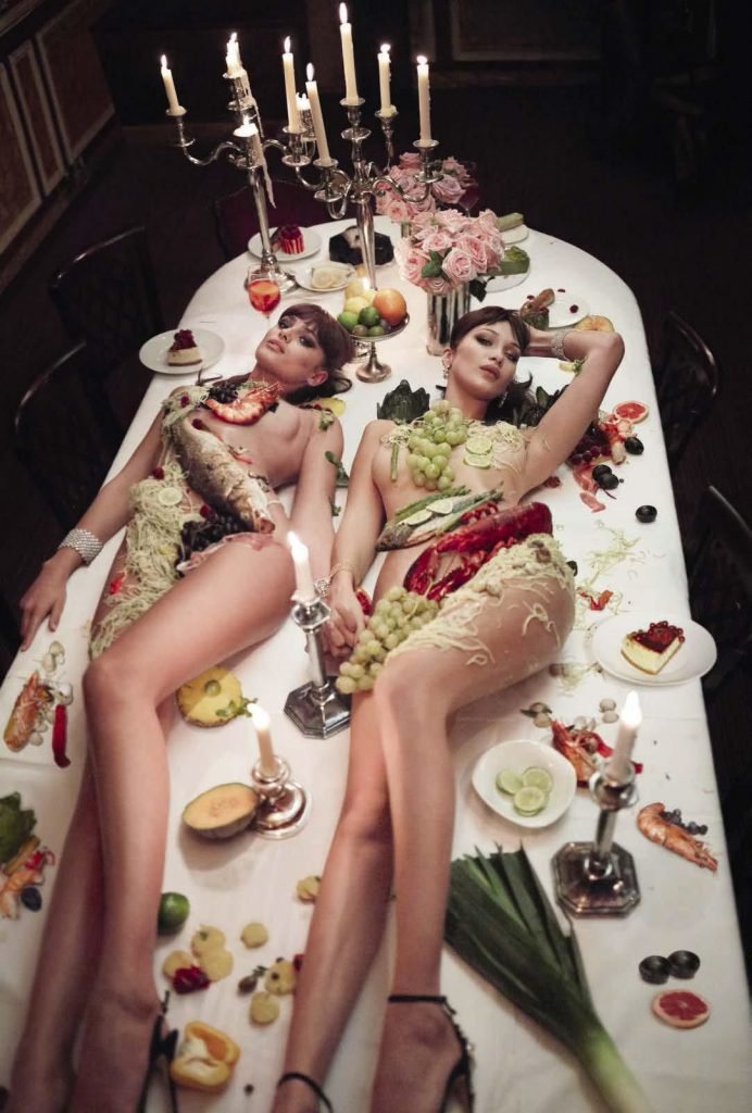 Por que as feministas não atacam as revistas de moda por "objetificar" e "sexualizar" as mulheres e propagar padrões irreais de beleza feminina? Elas não costumavam fazer isso? Ou é politicamente incorreto atacar homens gays e outras mulheres por criarem ensaios editoriais como este? E este não é um simples reuso de ensaios de moda que remontam, oh, quatro décadas? Ohhh - a comida é tão SENsual!