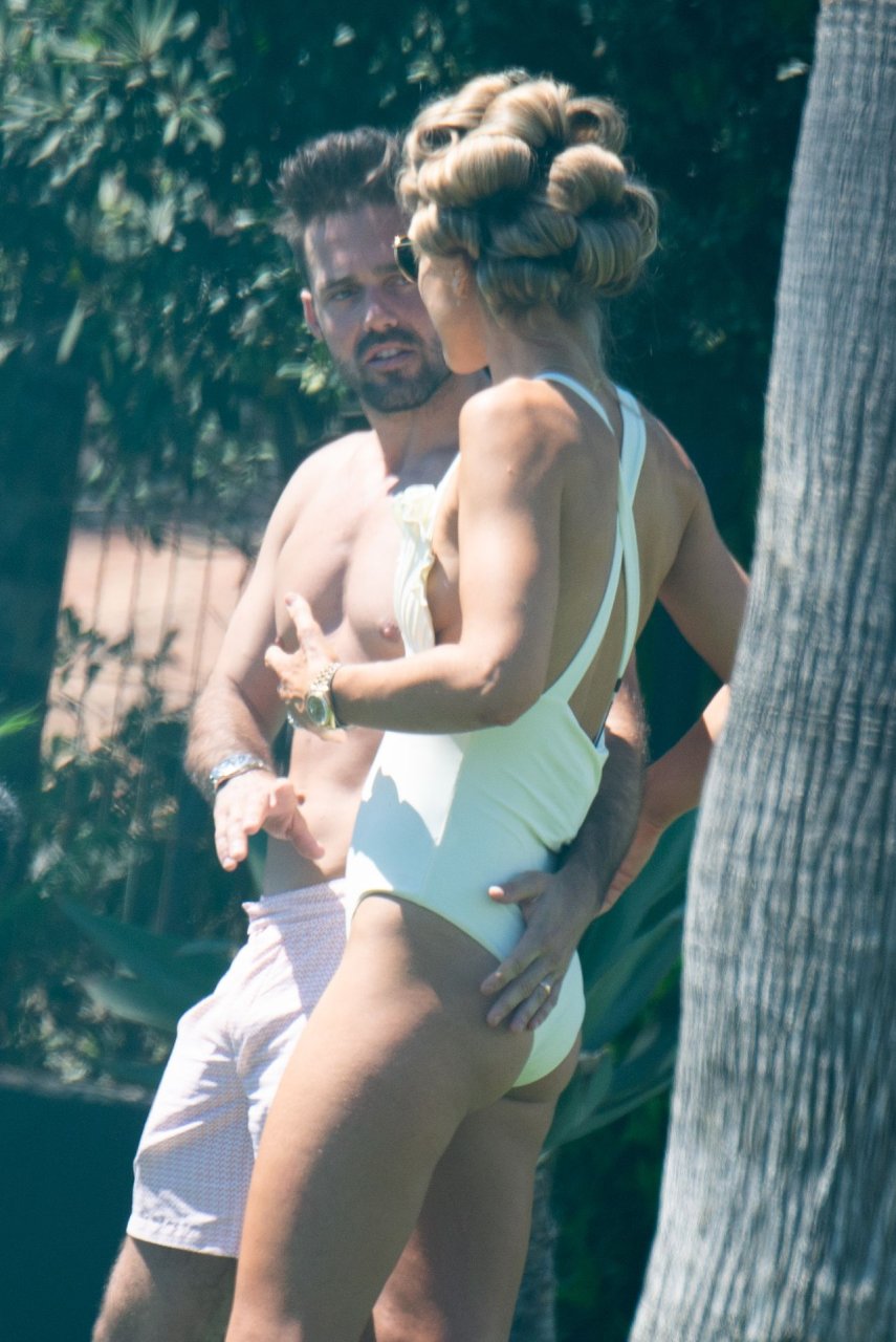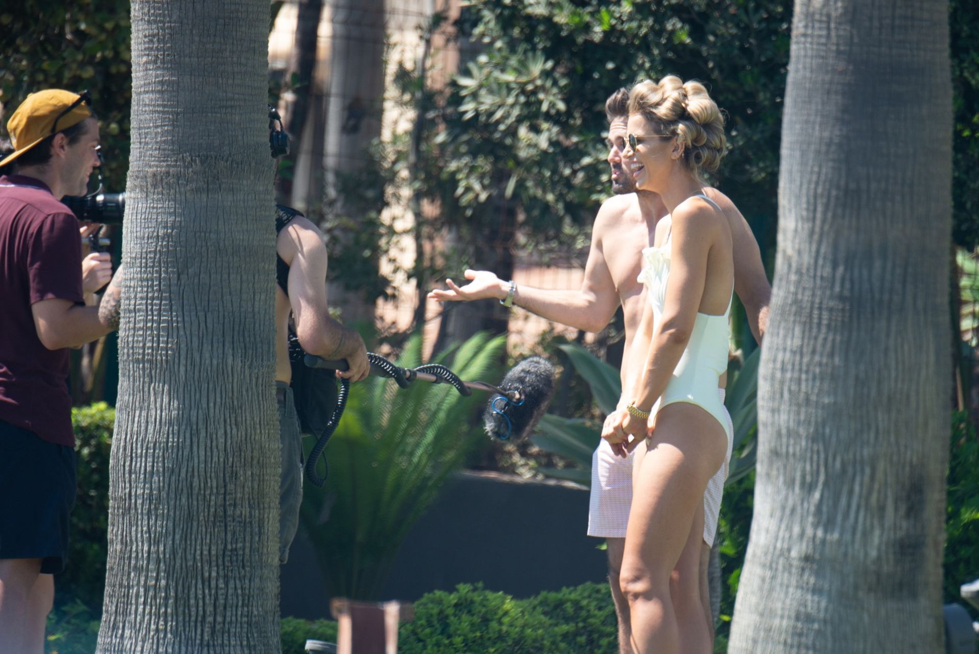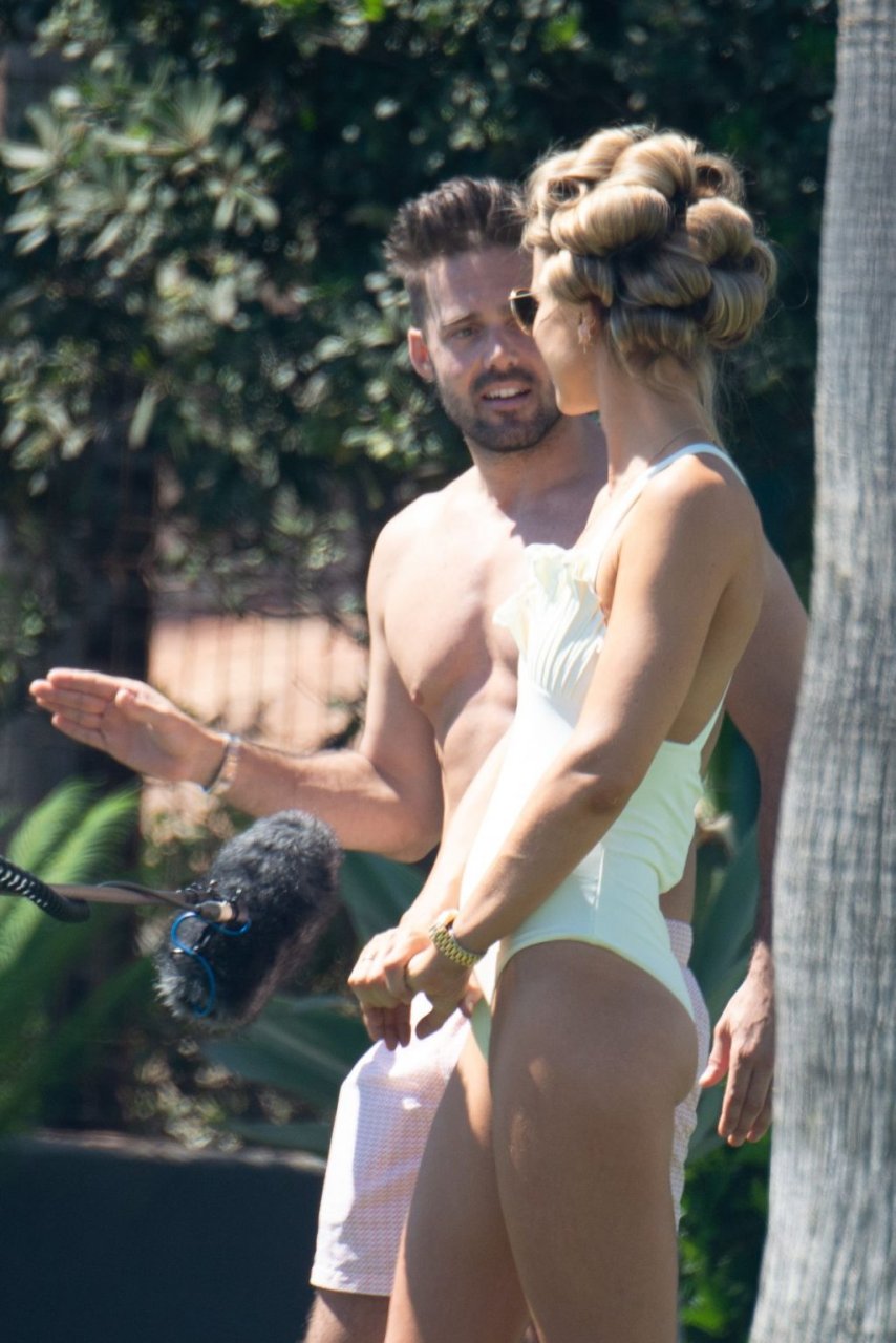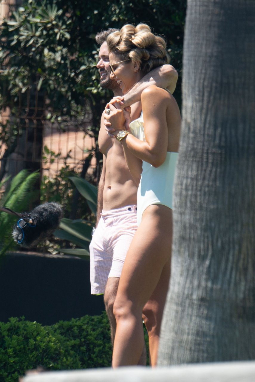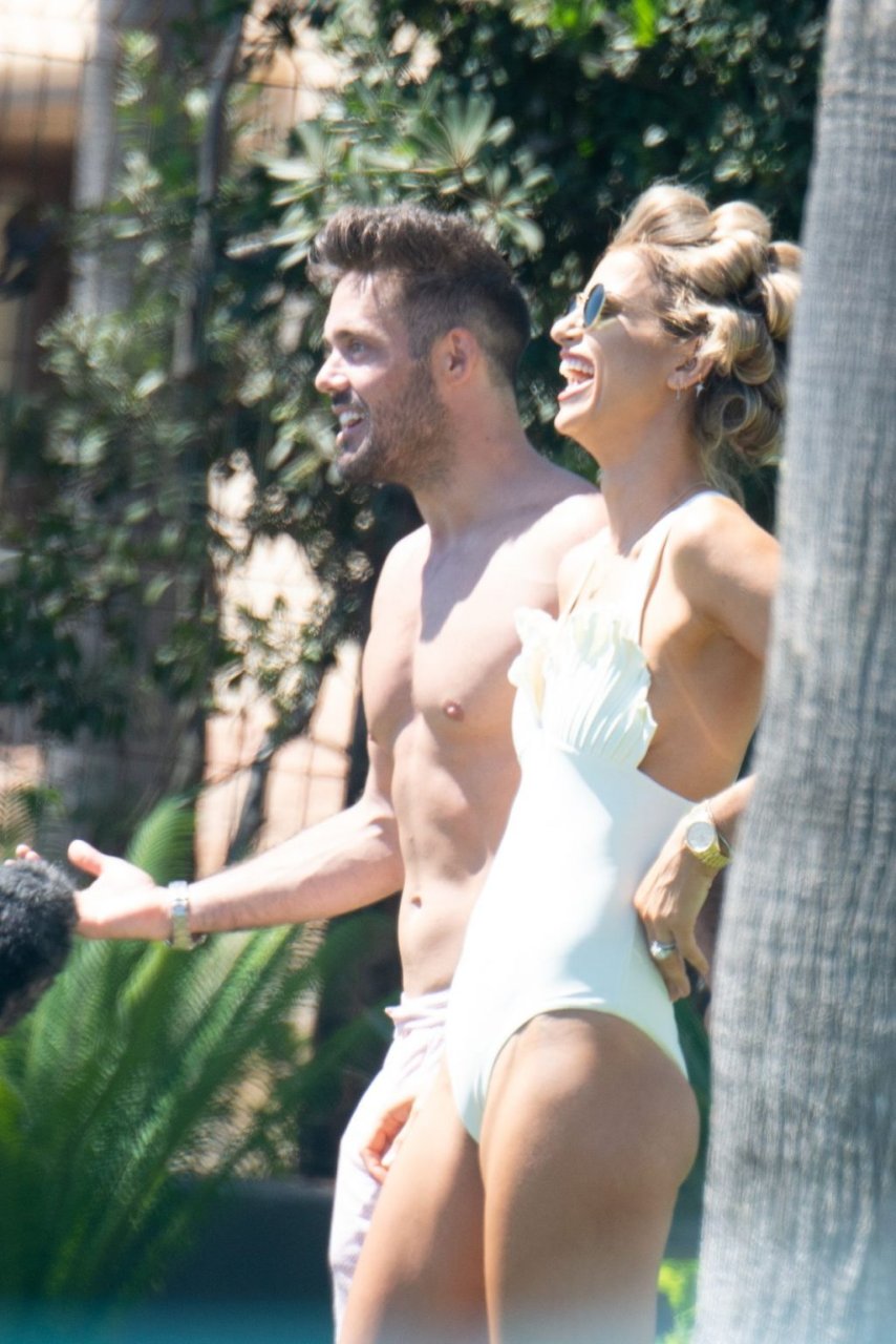 Vogue Williams e Spencer Matthews foram vistos aproveitando uma divertida sessão de fotos em Marbella, 18/08/2019. Vogue começou com um maiô branco e bobes no cabelo e depois trocou para um maiô preto espetacular, posando ao lado de outras modelos à beira-mar.