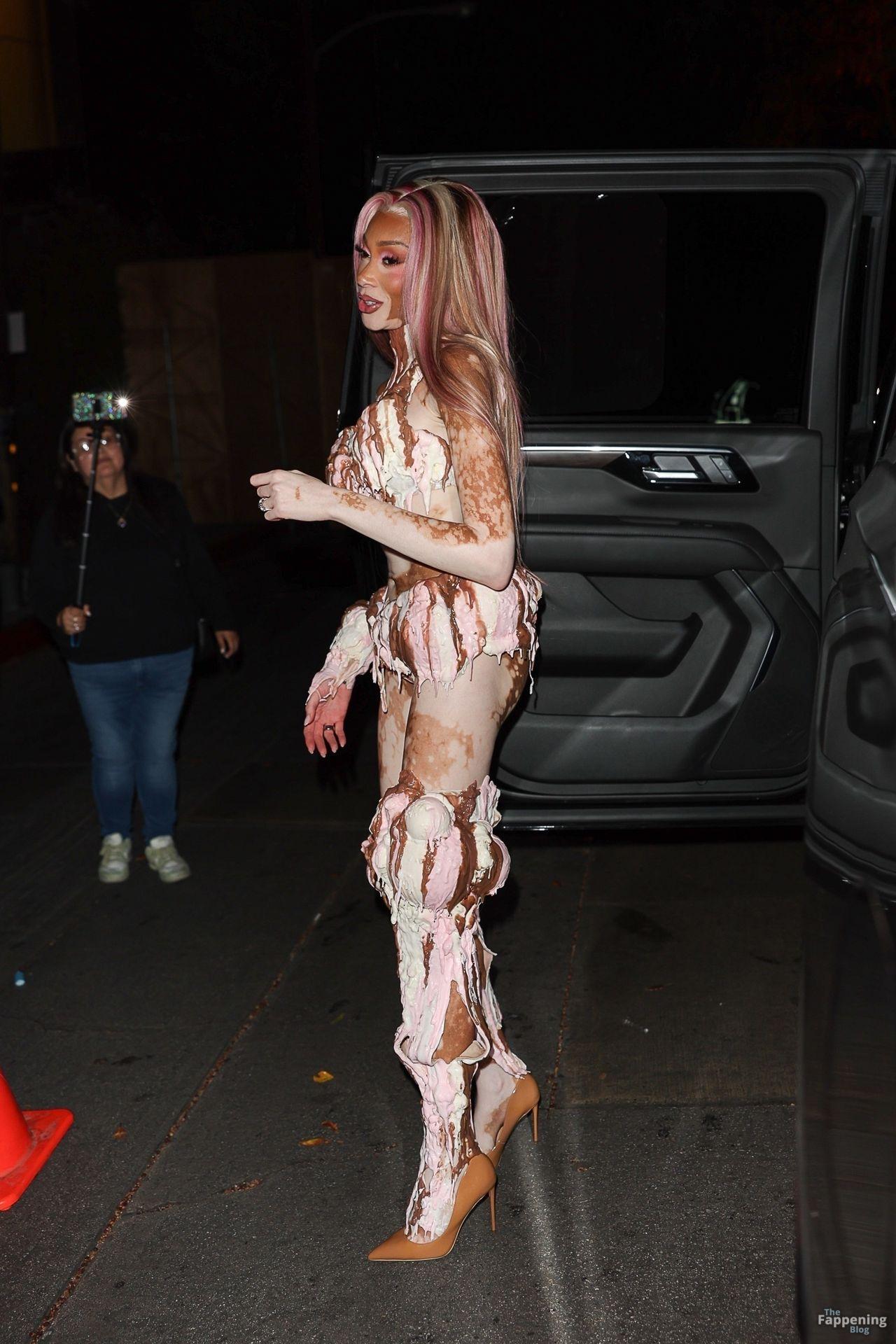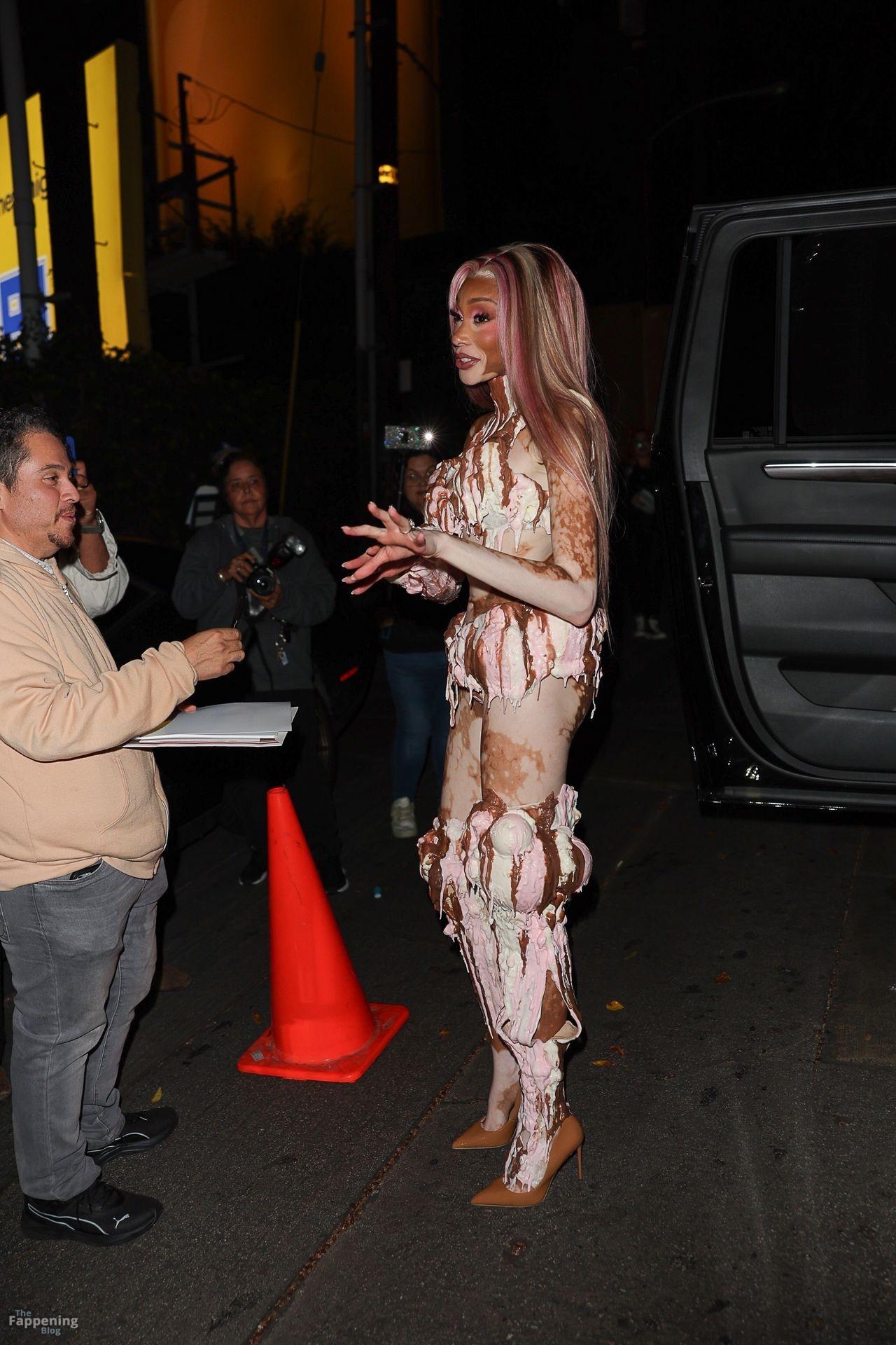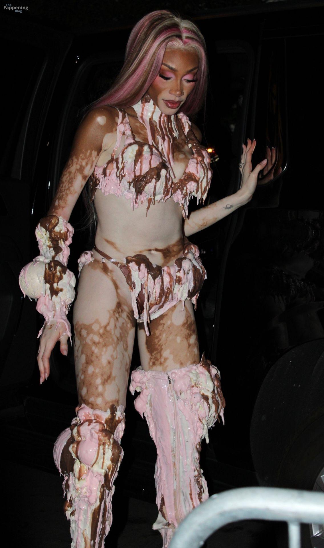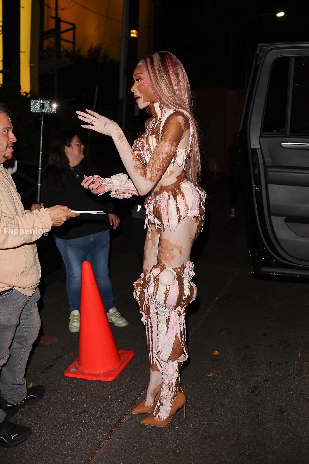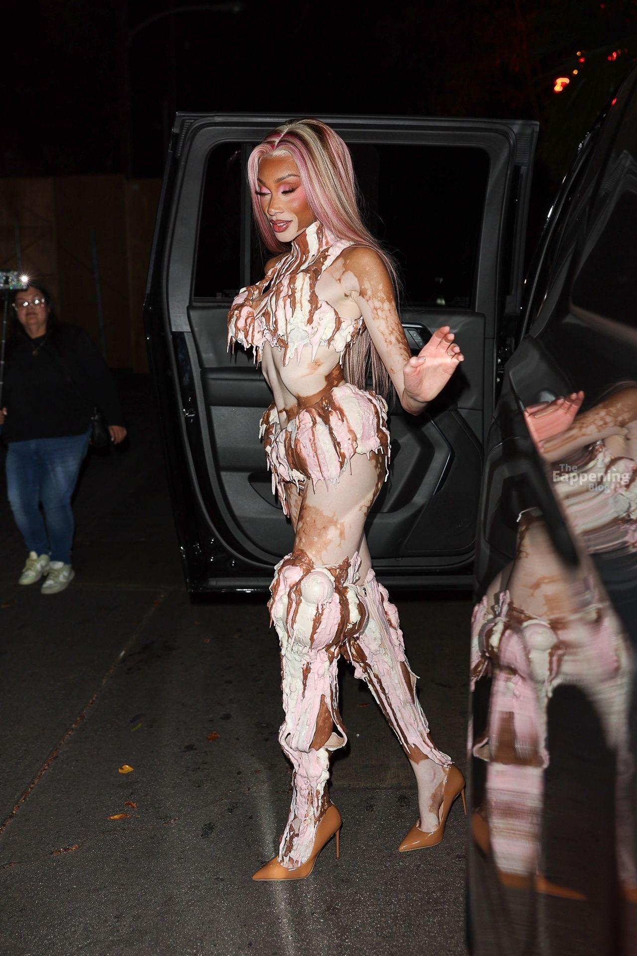 A modelo Winnie Harlow apareceu na grande festa de Halloween de Vas J Morgan em LA. Confira seu look de sorvete nas fotos dos paparazzi abaixo.