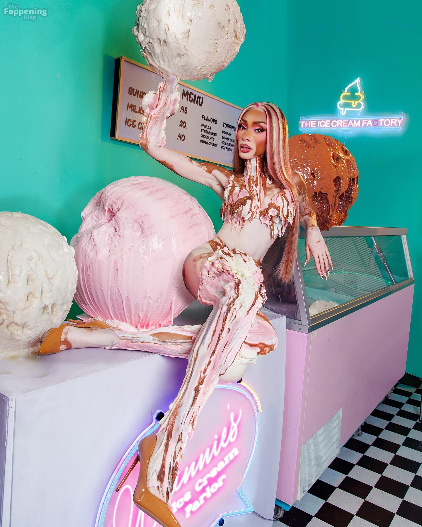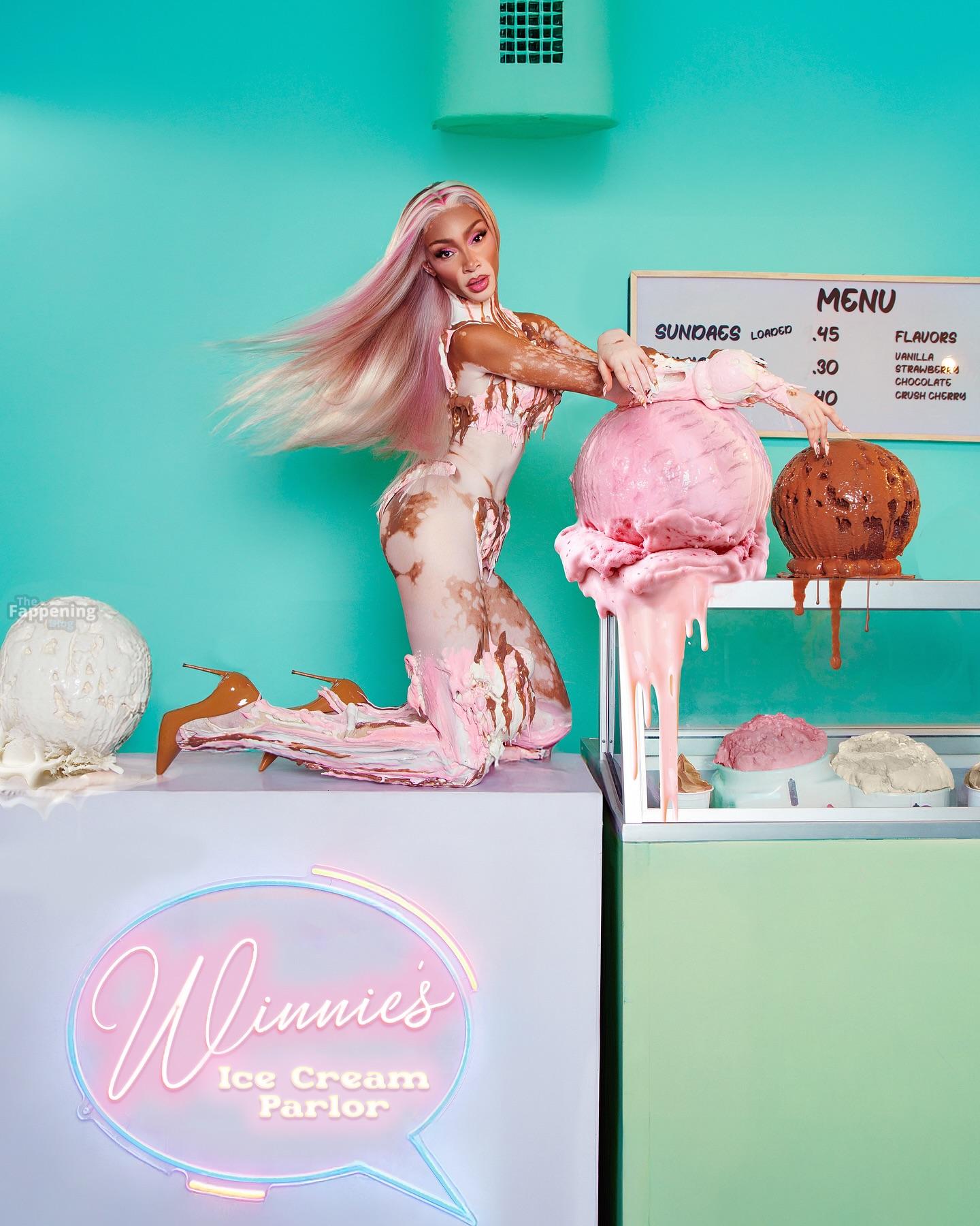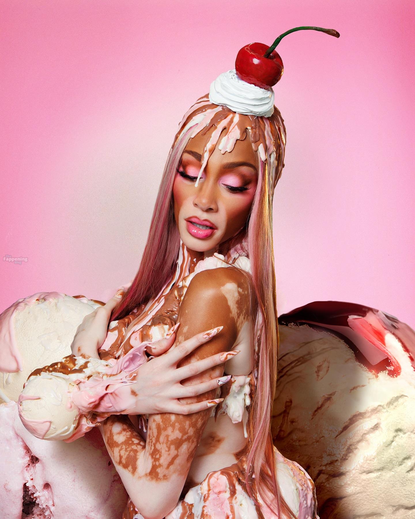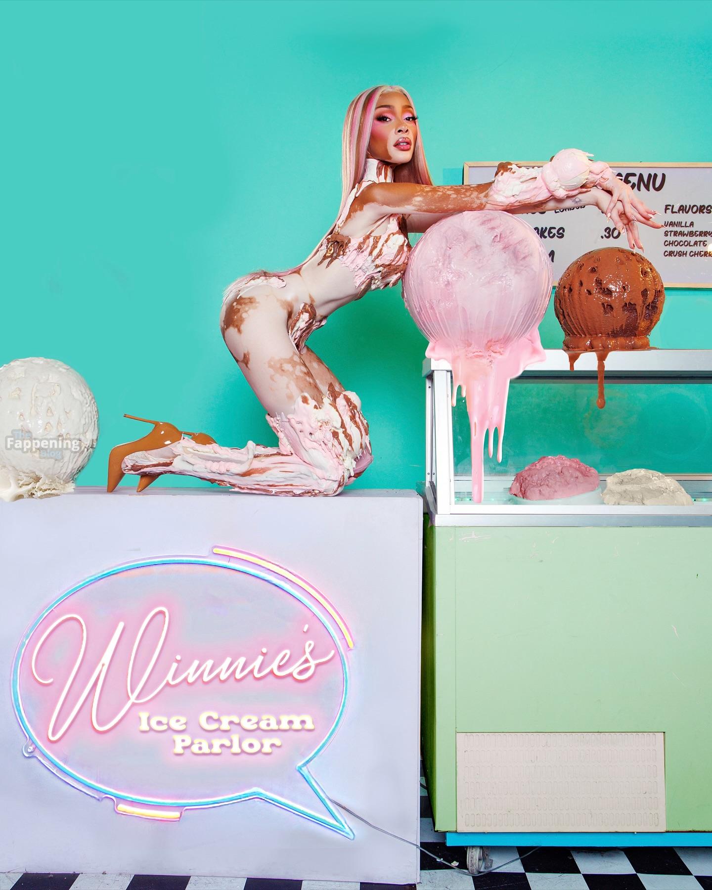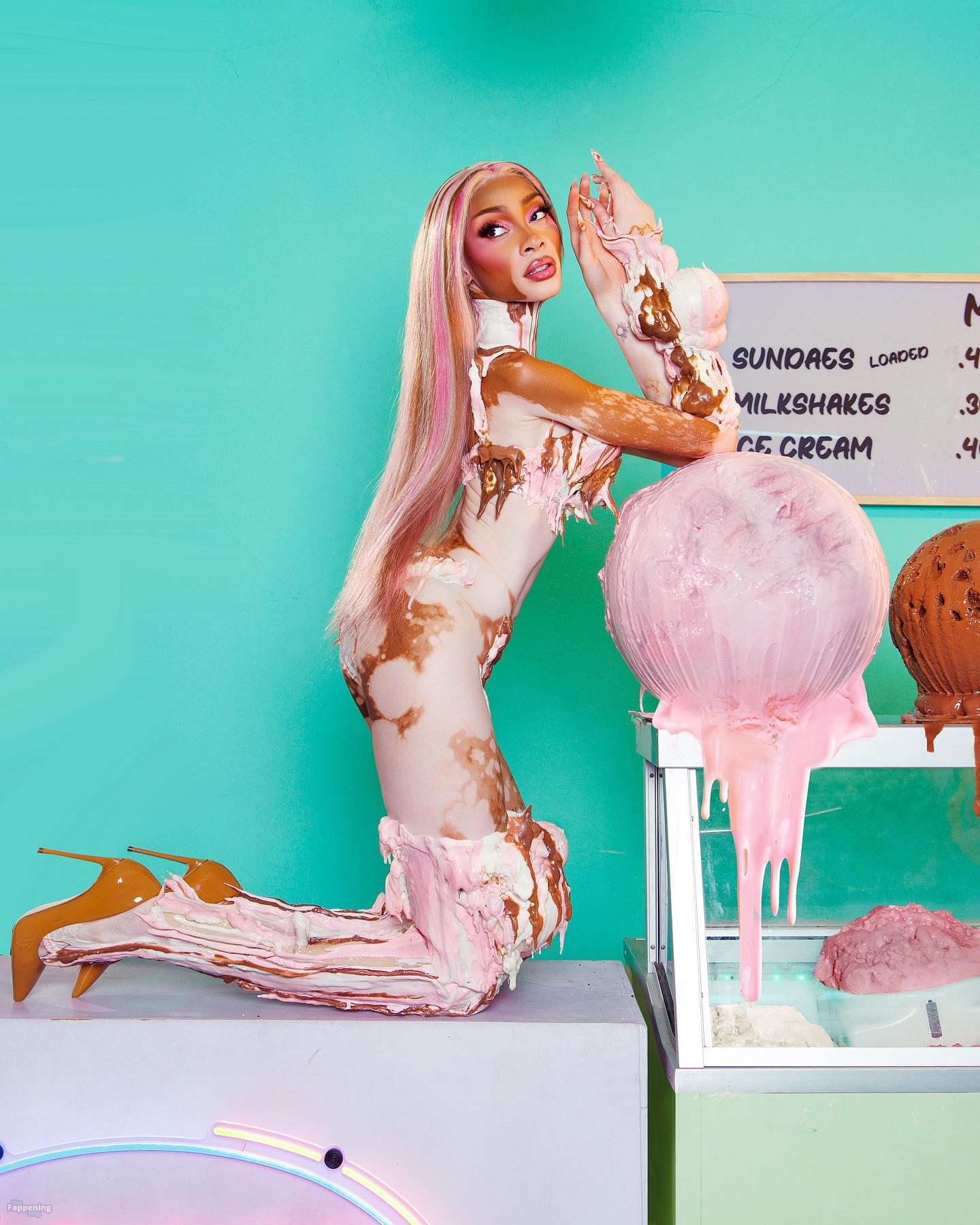 Winnie Harlow arrasou com a fantasia de Halloween mais original deste ano. Ela foi como um monstro de sorvete. É uma ideia matadora – uma garota sexy, semi-nua, coberta de sorvete, assustadora pra caramba. Nas fotos, a modelo com vitiligo posa em uma sorveteria, parecendo parte do cardápio. Você lamberia esse doce sorvete branco dela? Com certeza.