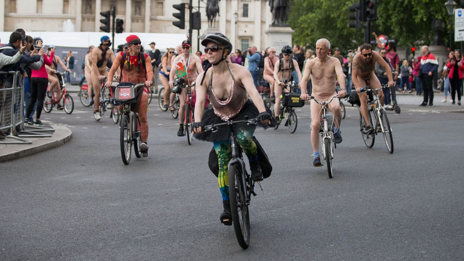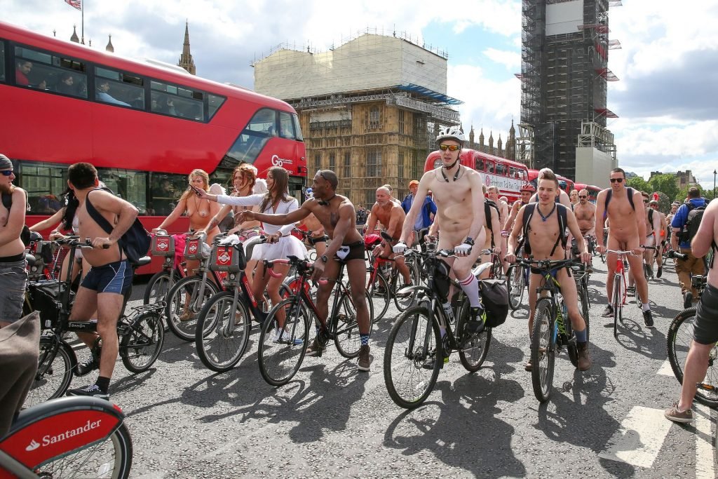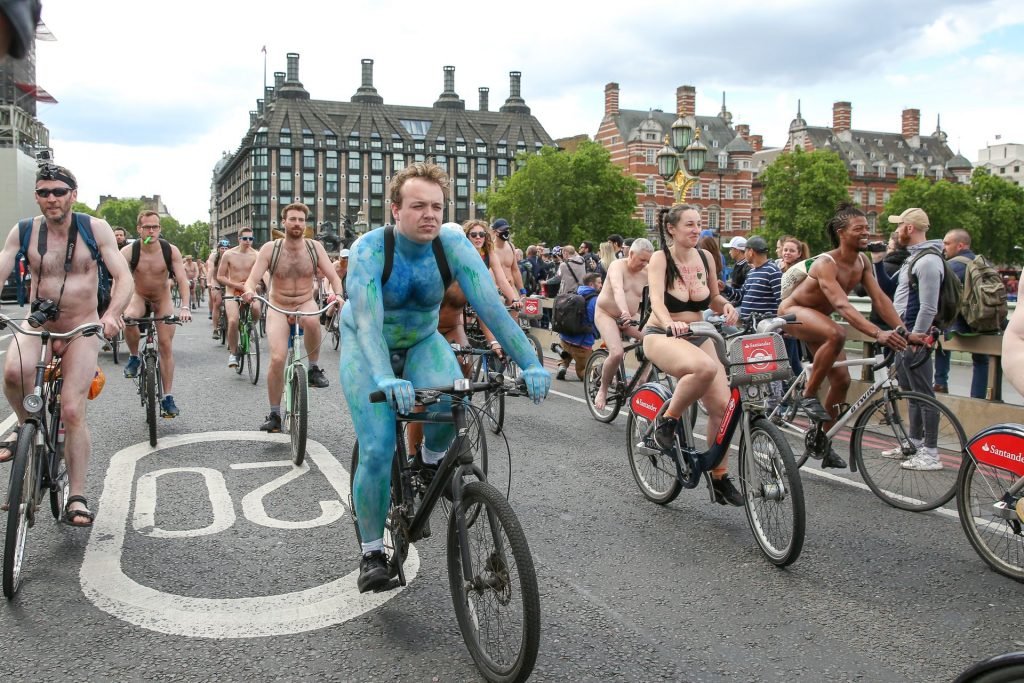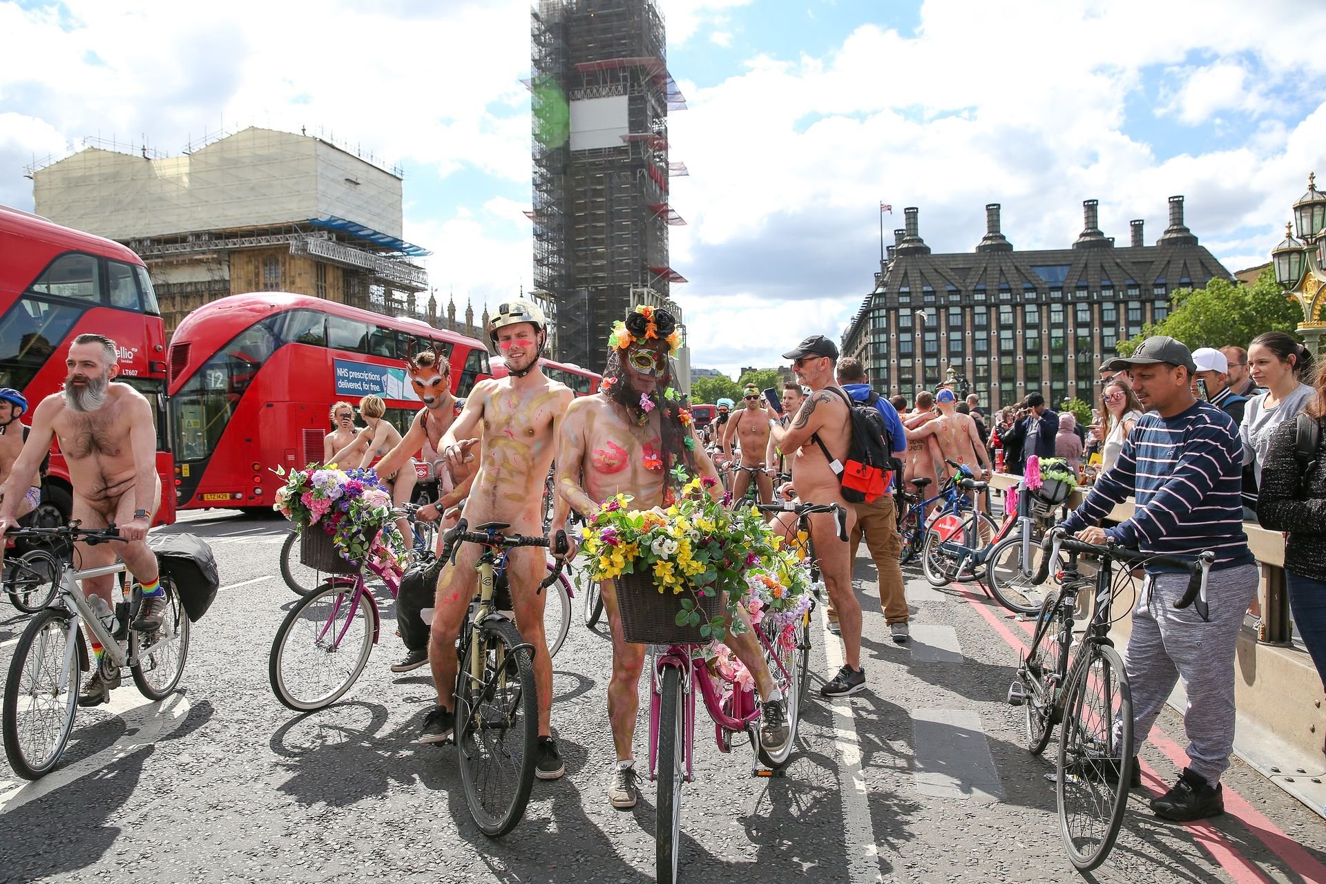 Ciclistas nus participam no 16º passeio anual de bicicleta nua pedalando na Ponte de Westminster como parte do evento World Naked Bike Ride (WNBR), 08/06/2019. Os ciclistas demonstram a vulnerabilidade dos ciclistas e protestam contra a cultura do carro, aumentando a conscientização sobre os ciclistas nas estradas.