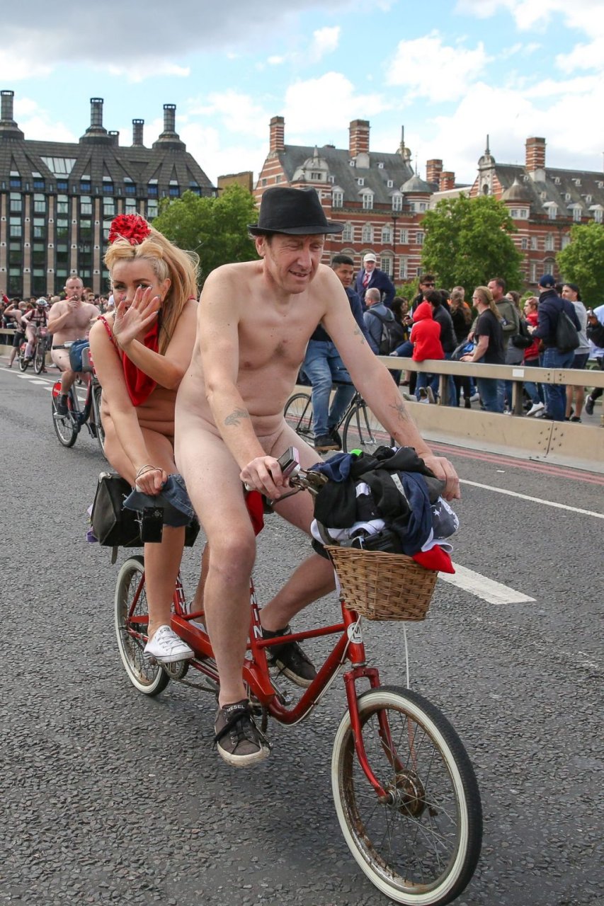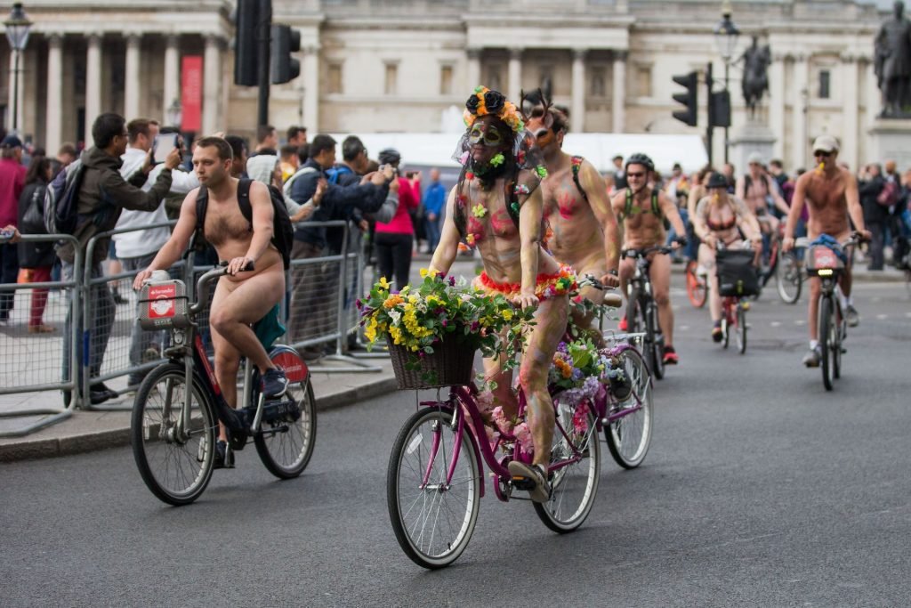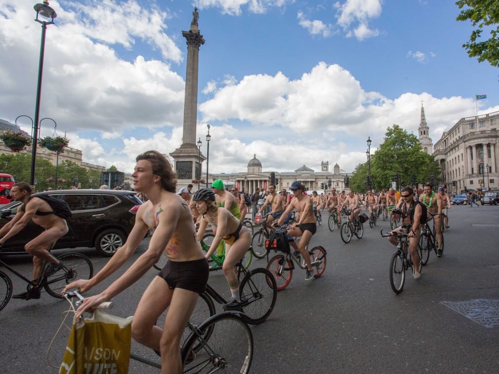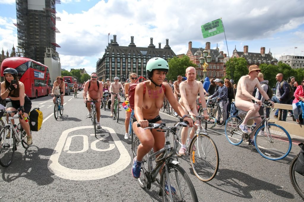 Ciclistas nus participam no 16º passeio anual de bicicleta nua pedalando na Ponte de Westminster como parte do evento World Naked Bike Ride (WNBR), 08/06/2019. Os ciclistas demonstram a vulnerabilidade dos ciclistas e protestam contra a cultura do carro, aumentando a conscientização sobre os ciclistas nas estradas.