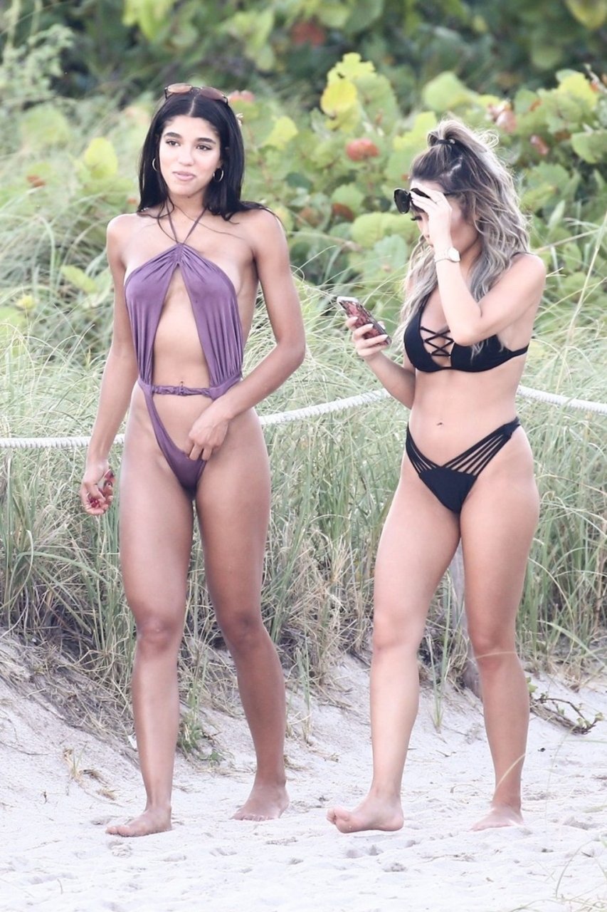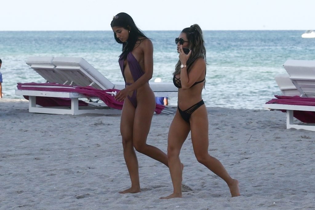 Model e influenciadora de mídia social Yovanna Ventura (22) arrasa com um ousado maiô roxo de uma peça na praia em Miami, 12/08/2018. A suposta ex de Justin Bieber chamou atenção junto com sua amiga enquanto as duas caminhavam pela praia.